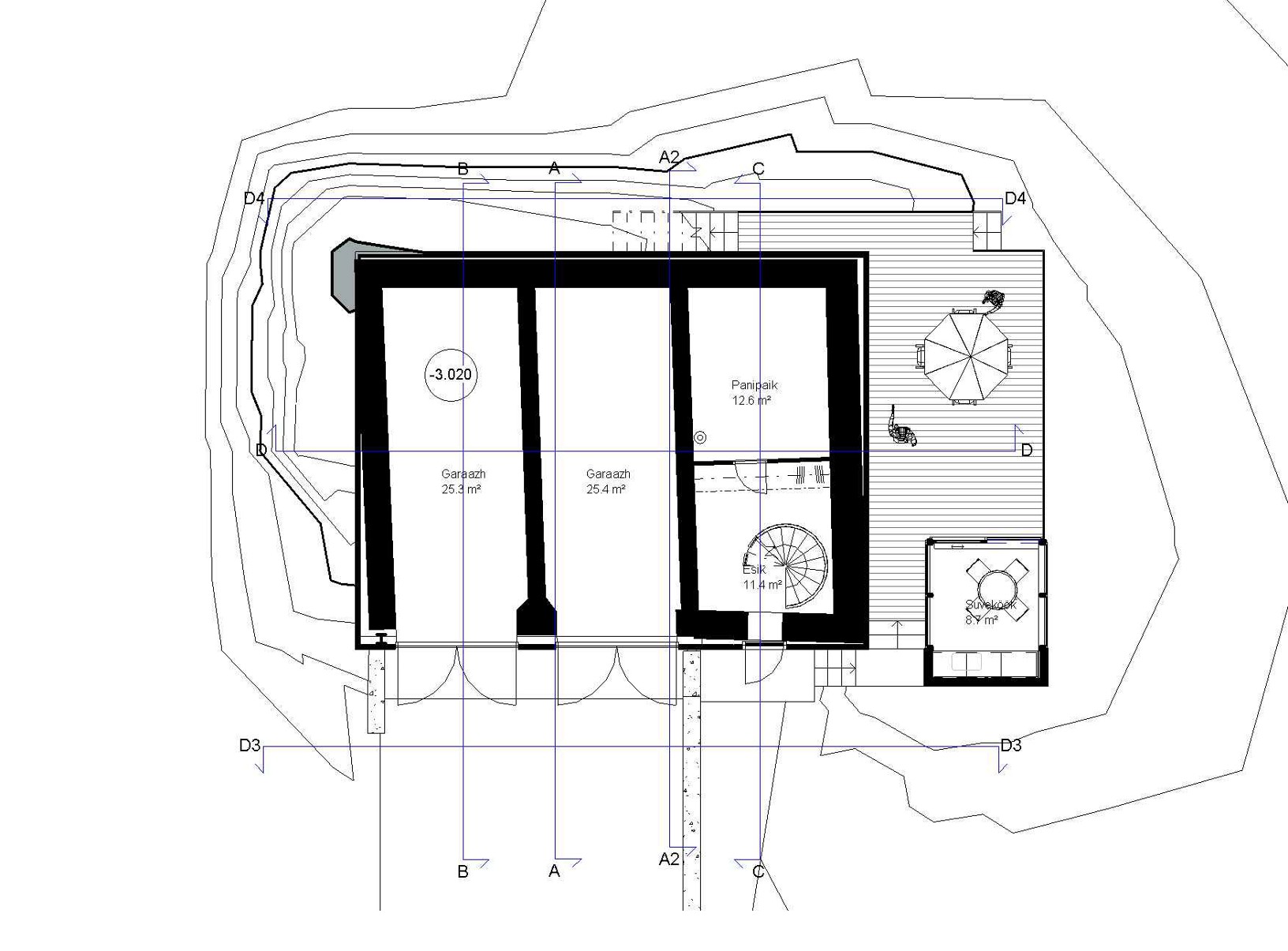 Ruumid on maapinna tasandil; garaazhi uksed on avarad, kuid panipaiga ukseauk on vaid u. 80x180 cm.