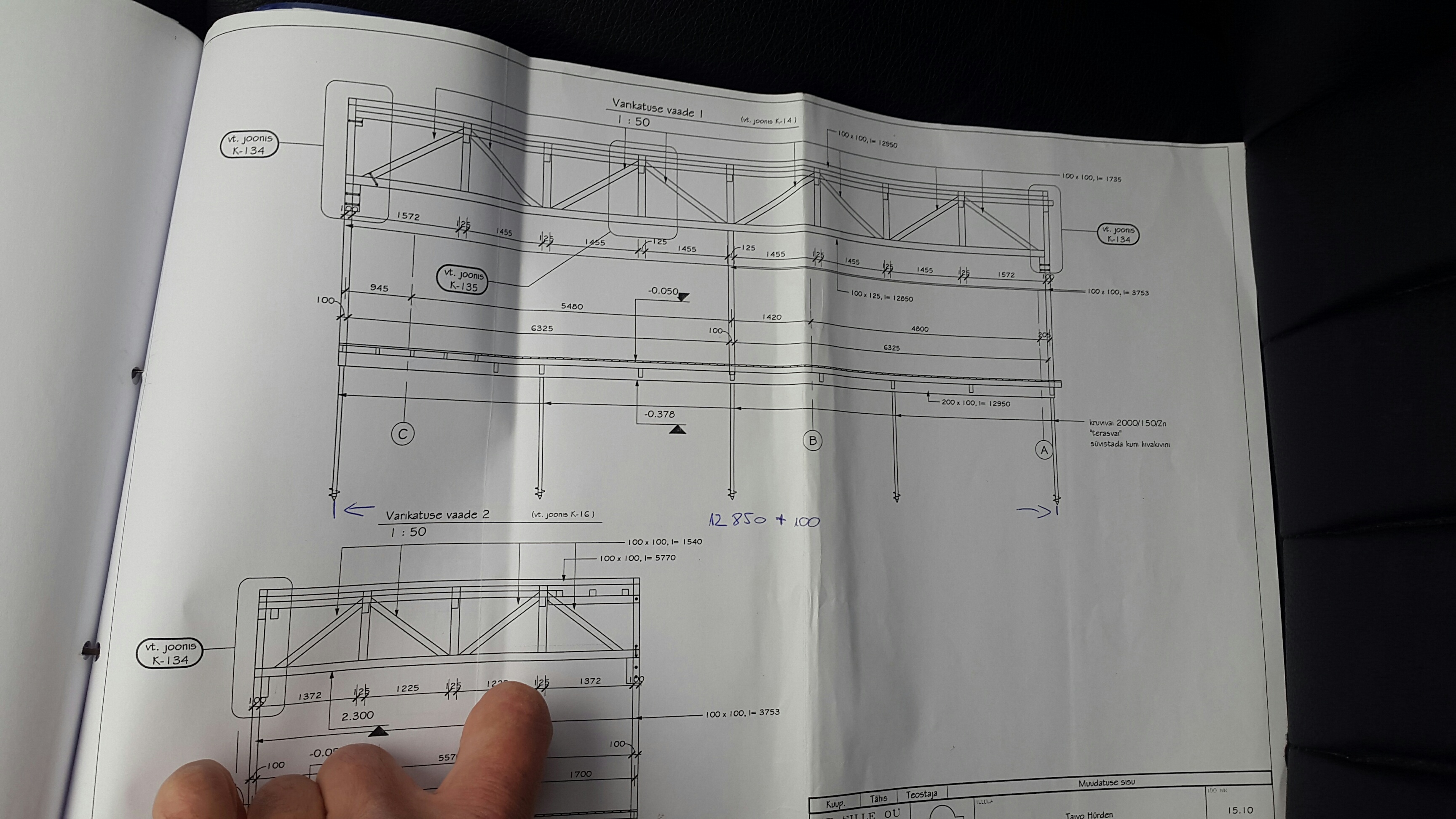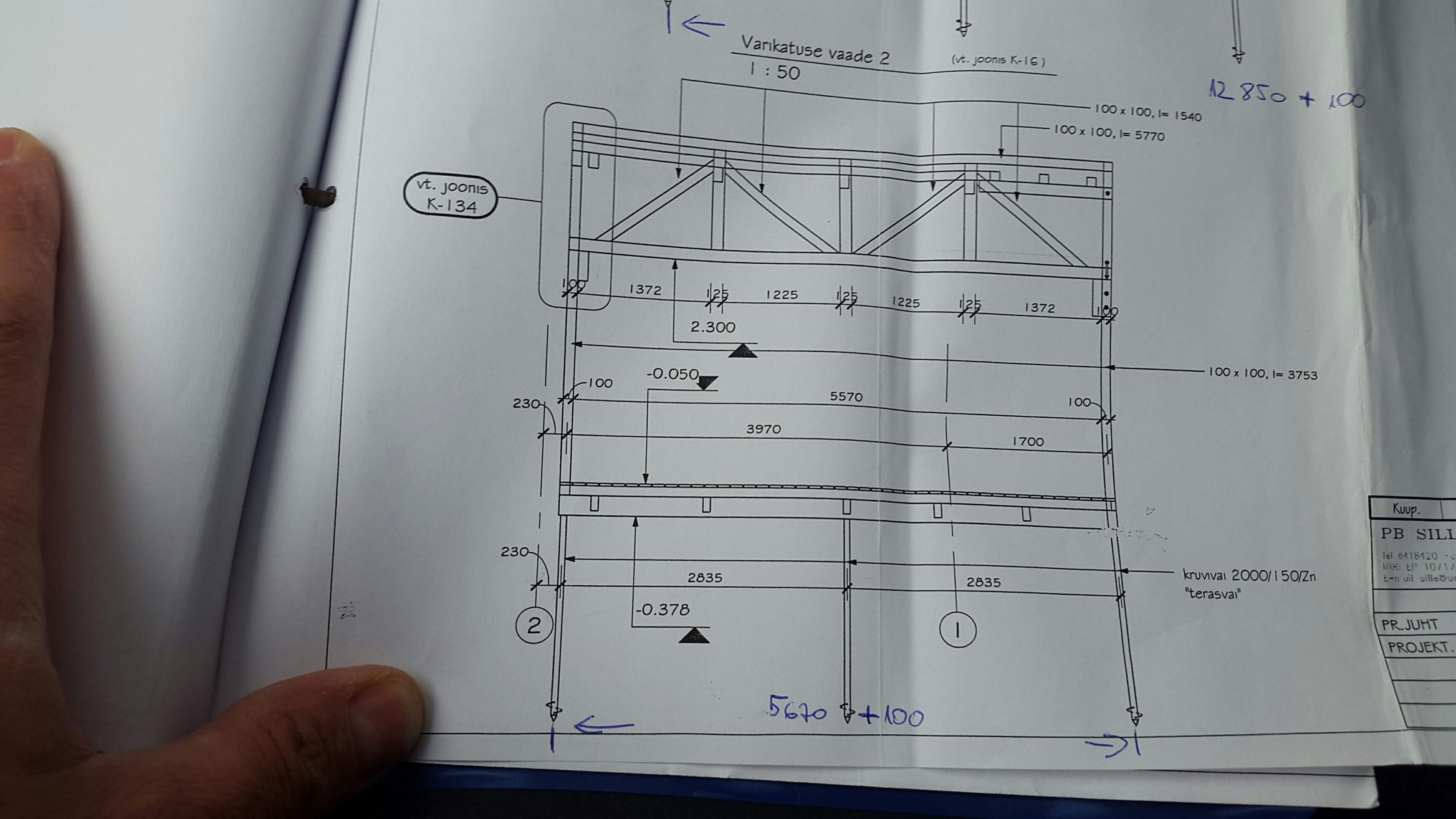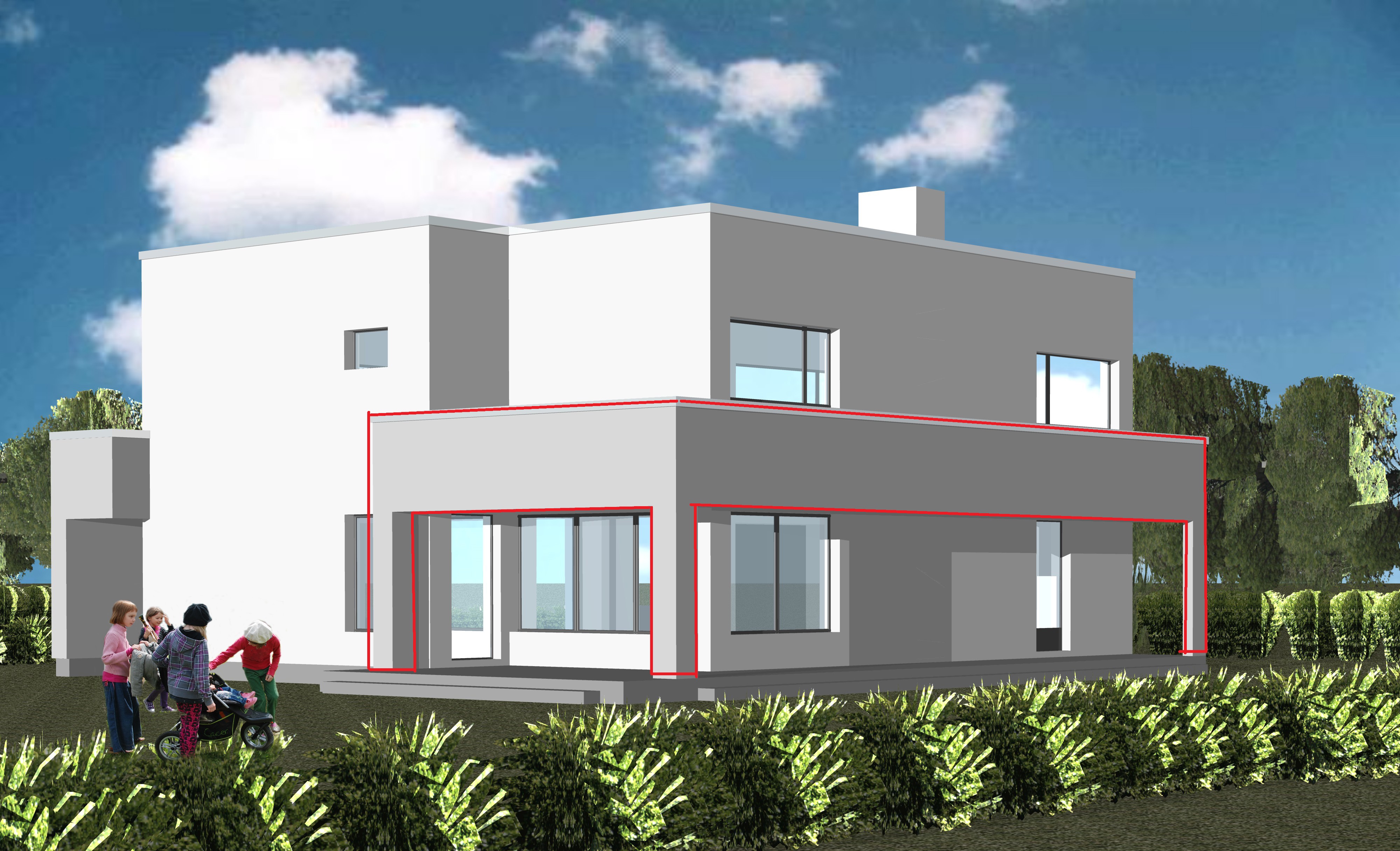 Ehitatav osa on pildil punase piirjoonega. Hoone küljes on olemas eelnevalt paigaldatud kinnituskannad katuse karkassi prussidele ja olemas on ka maasse paigaldatud katuse tugijalgadele kinnituskannad.