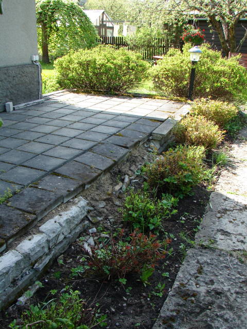 Terrassi mõõdud umbes 2,3 x 6,9 m. Vundament on tugev, kuid aastate jooksul (20 aastat) on ilmselt plaatide alla kogunenud vesi vundamendipealset äärt tasapisi pressinud ja vooderdise plaadid-kivid lahti surunud. Ühes otsas põõsaste vahel on trepitaoline asi, kuid trepi sooviks viia nurga peale või küljele. Vaja oleks ka mingisugune drenaažilahendus (a la mõni veesülititaoline toru külgede pealt välja). Peale uued samalaadsed plaadid, küljed vast rinnatisekivist. Aga ka uued ideed oodatud.