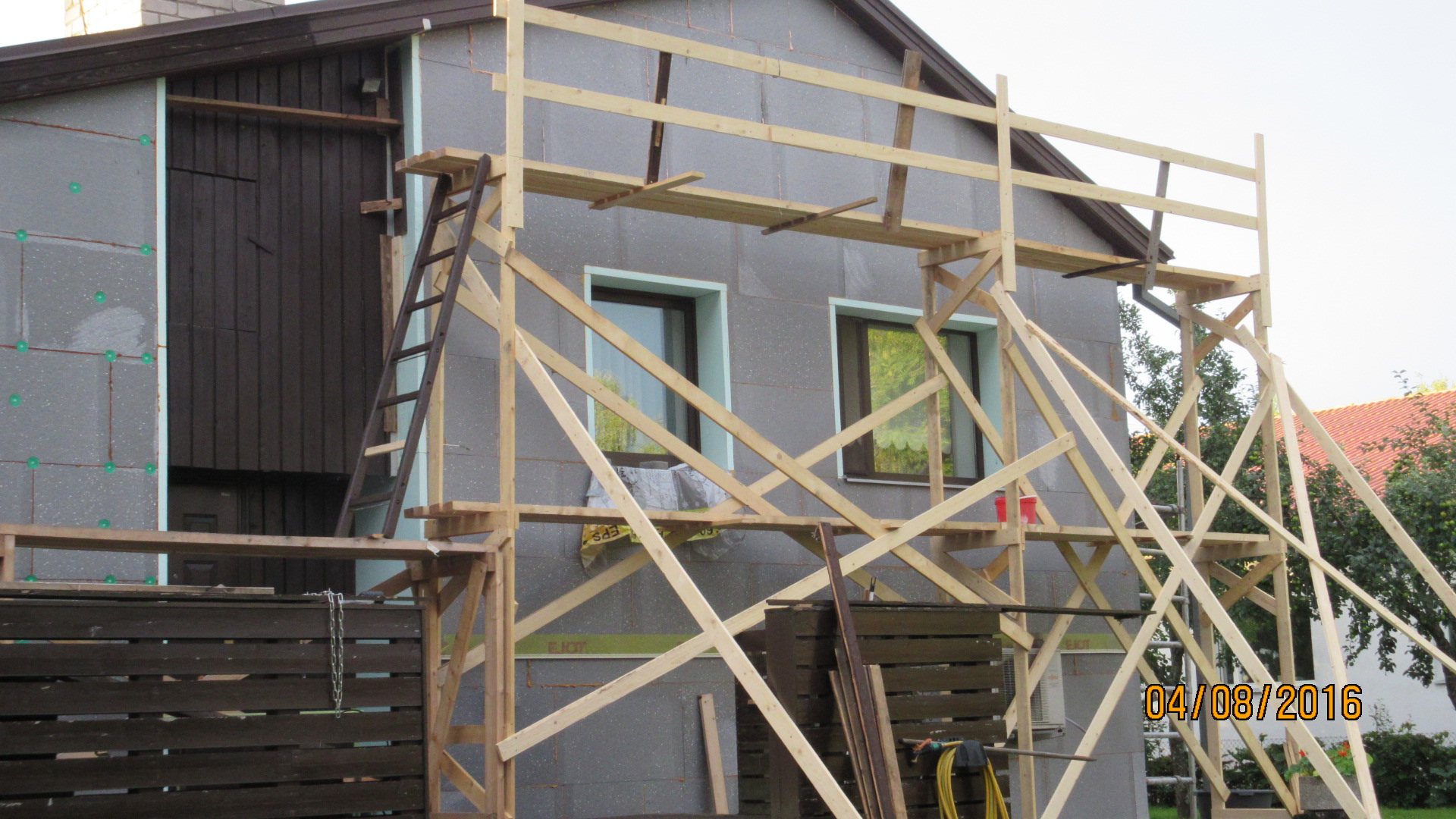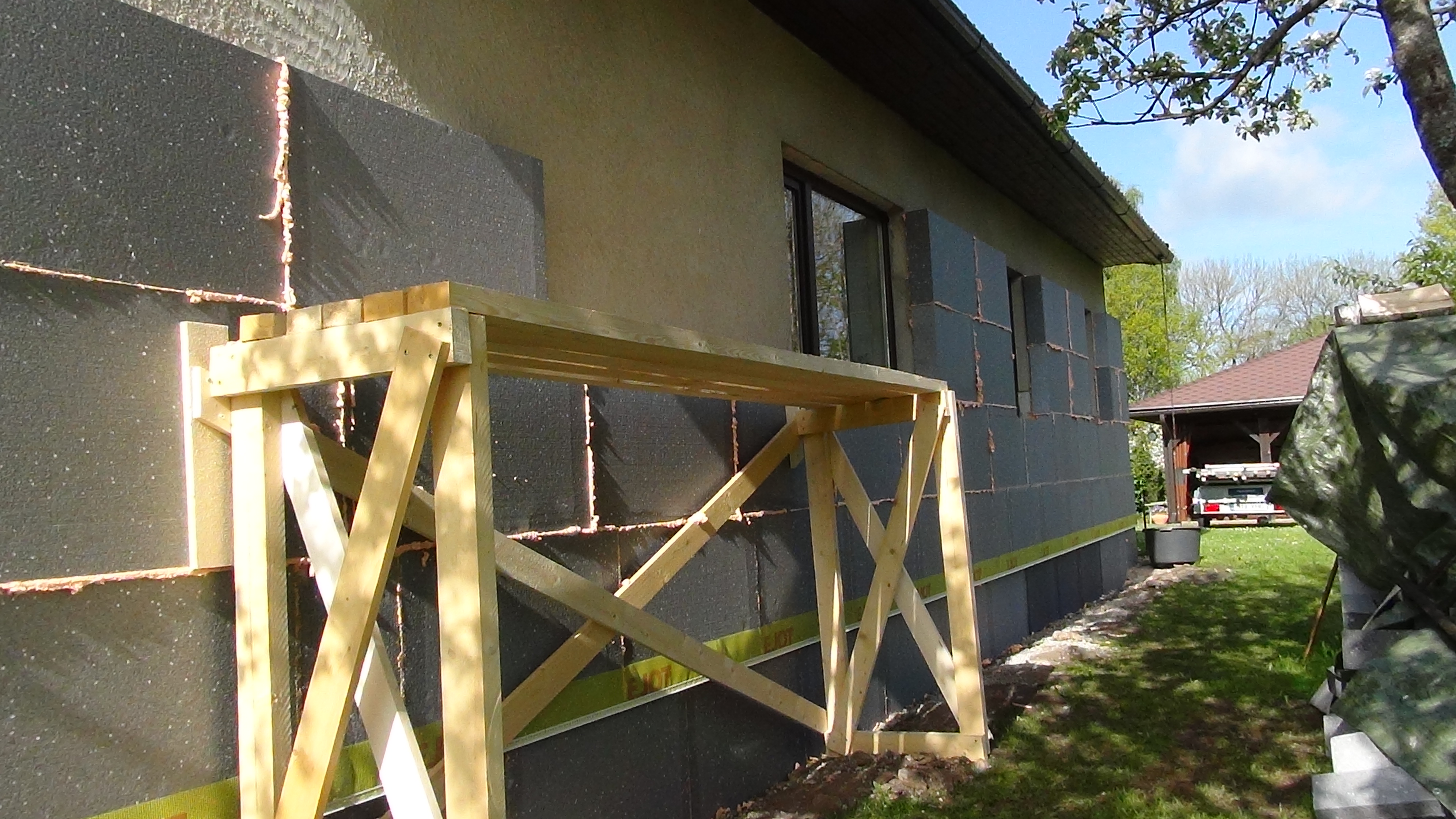Eramu väliseinale on paigaldatud tume penoplast soojustus.Plaadid on tüübeldatud.