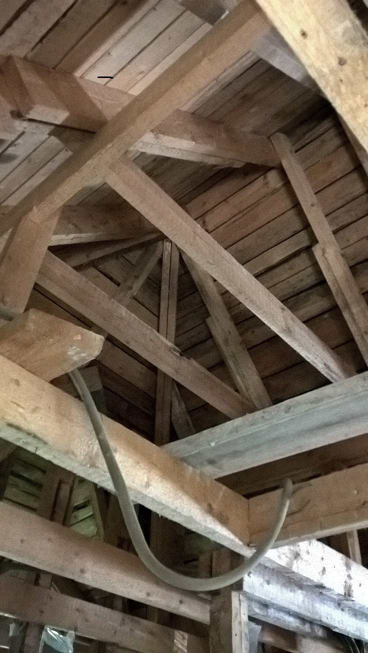 Terve katuse ulatuses on vana alumiinium laineplaadist(1tk ca 90x150) plekkkatus, mis on kinnitatud ca 4 punkti kruvikinnitusega (kuuskant kruvi). Katuse kandekonstruktsioon: sarikad keskmise vahekaugusega 60-80 cm , sarika ca 50x200, sarikatele kinnitatud laudis ning kaetud ruberoidiga ,roovitus. Katusel on üks korsten.