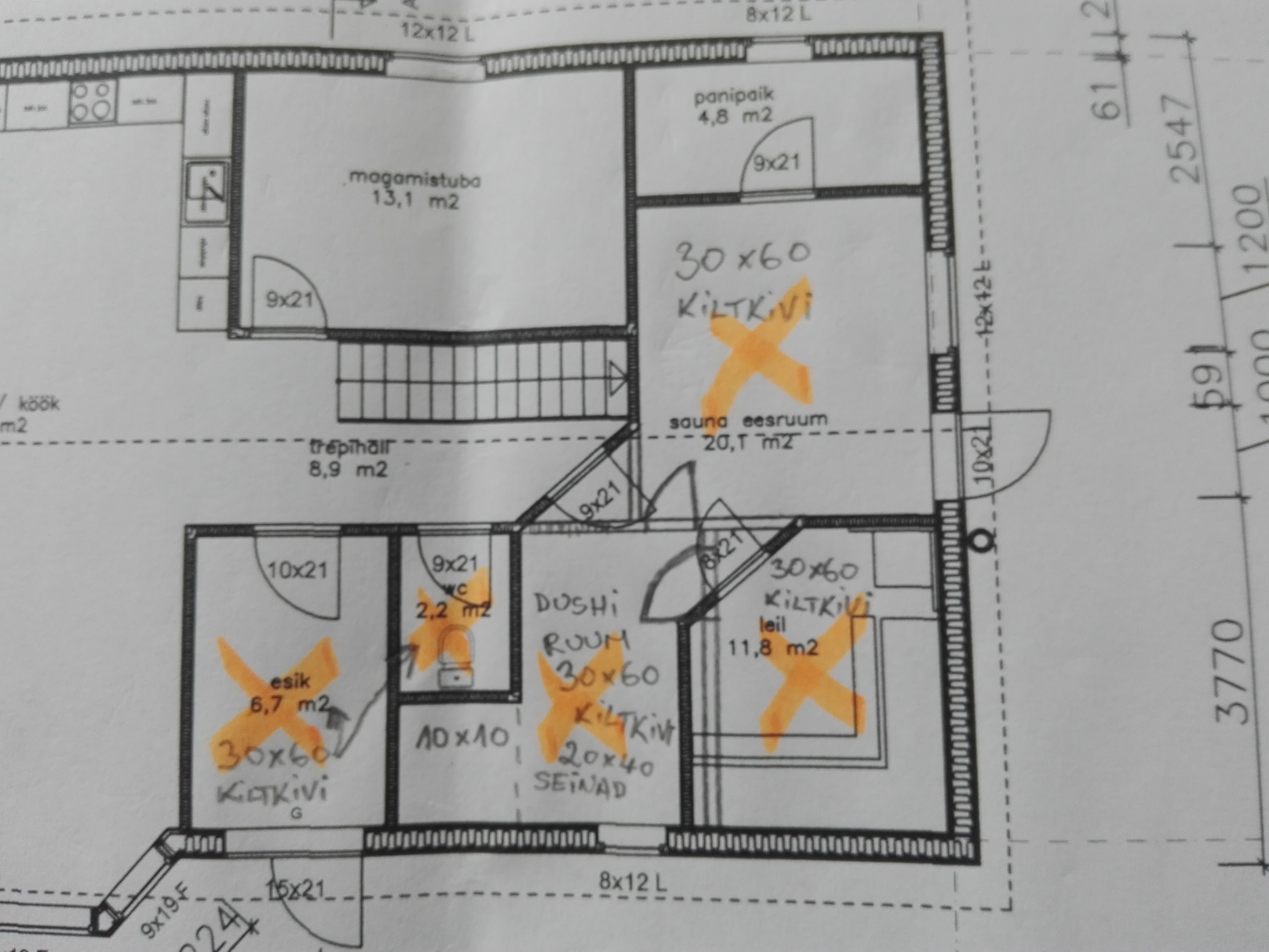 Plaatida 5 ruumi põrandad, vajadusel tasandussegu ja vannituppa hüdroisolatsioon!