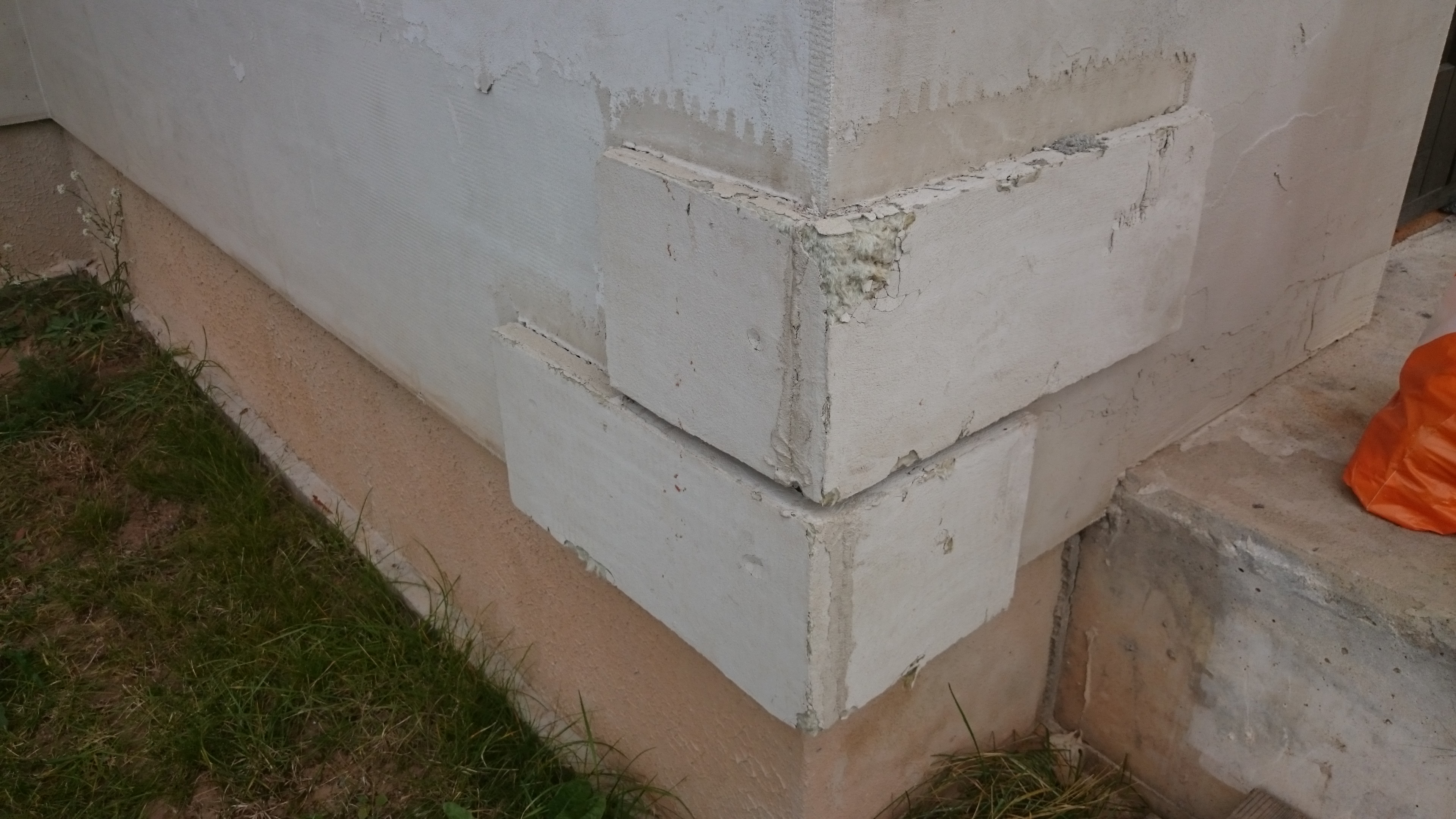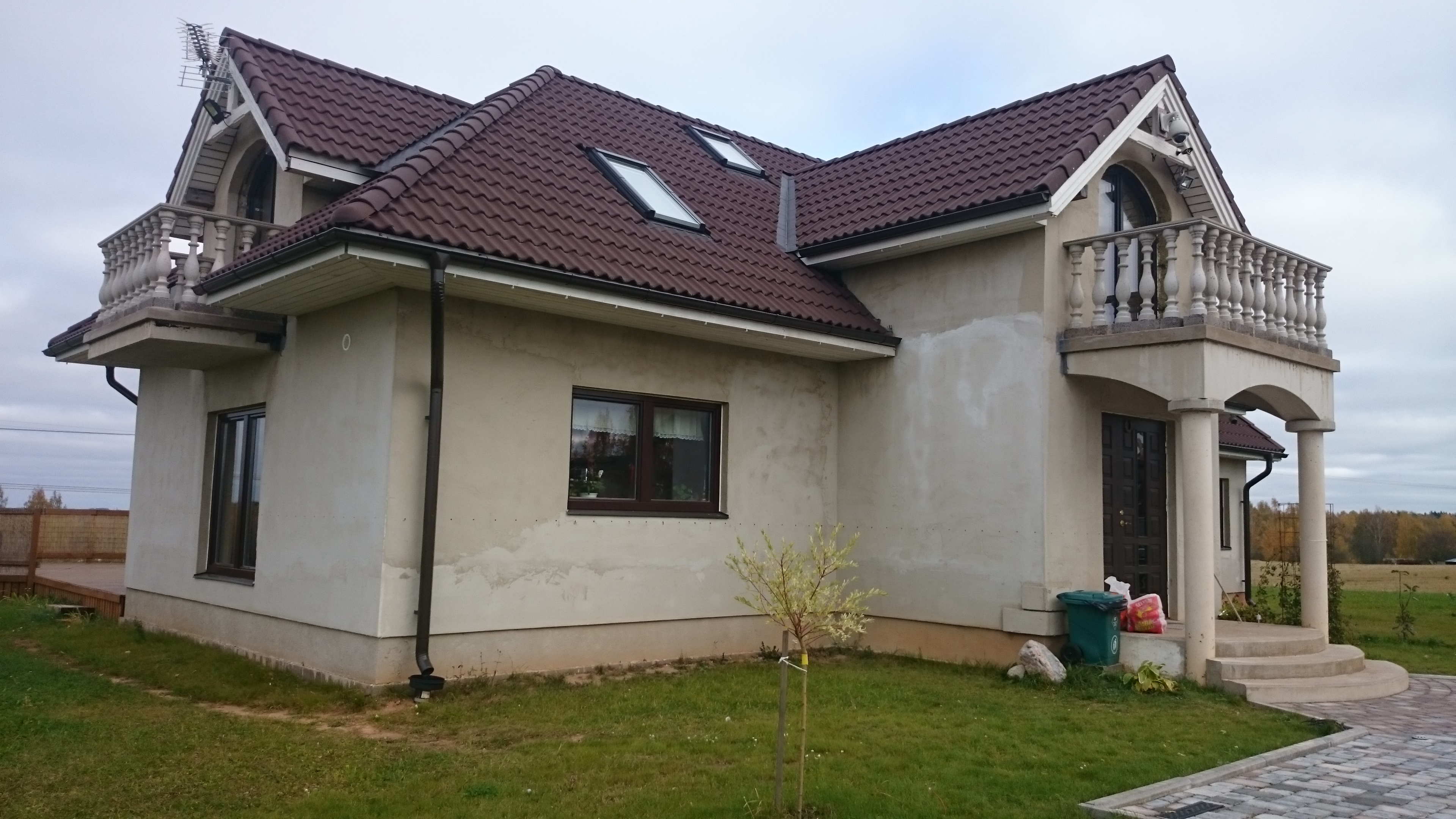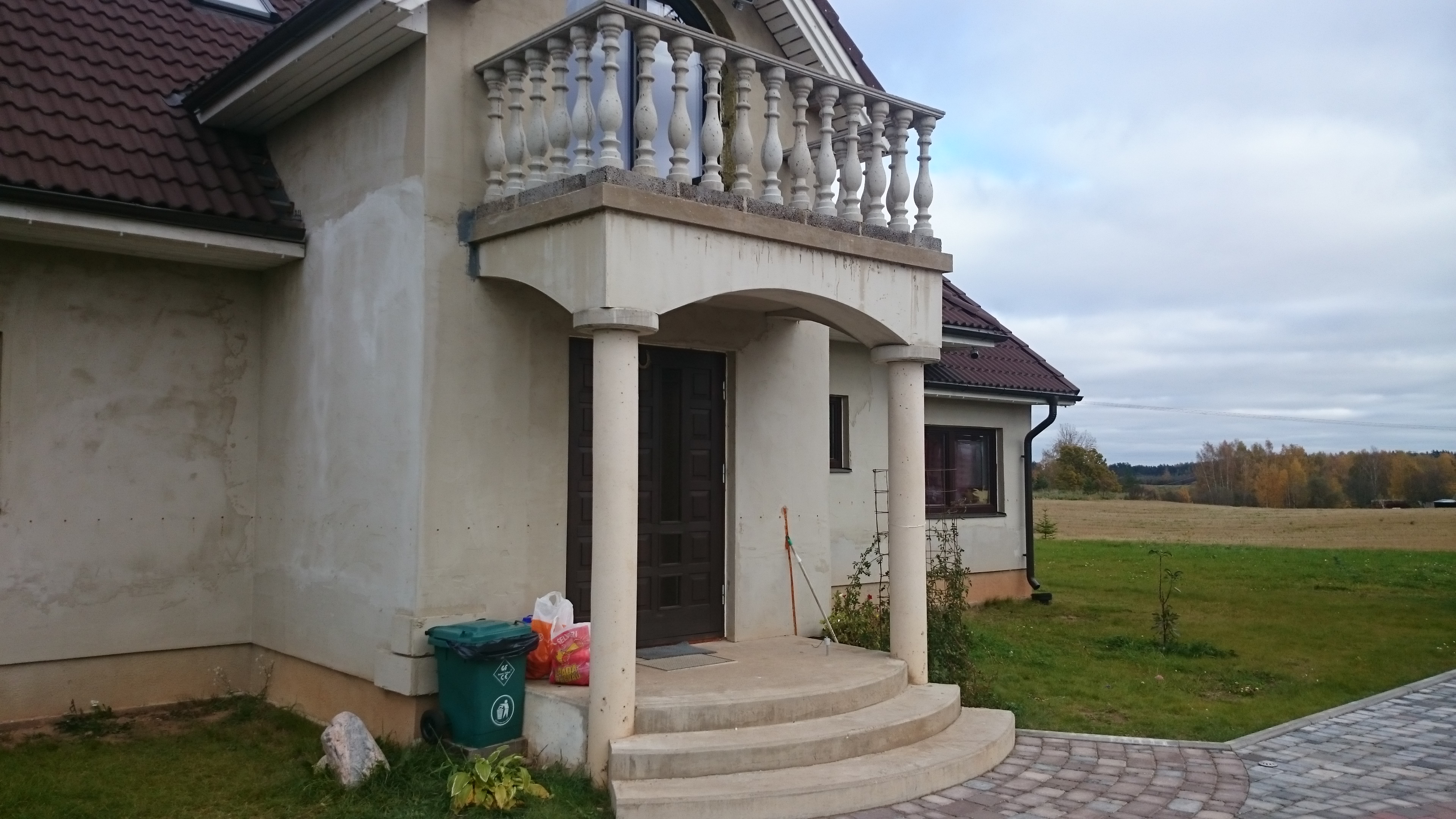 Tuleks eemaldada olemas olev soojustus. Soojustada uuesti ja õigesti 200mm villaga. Eriti jälgida sarikate ja avatäidete juures, et ei jääks tuule kanaleid. Aluskrohv kogu majale. Ei aja taga rihtlatiga loodi, kuna tegu maamajaga. Avade ümber fassaadile tuleks moodustada 100mm laiused äärised. Värvida valgeks. Samuti maja välisnurkadesse dekoratiivne kivi-kivi nurk (pildil). Värvida valgeks. Fassaadi dekoratiivne kivi liimida etteantud kohtadesse. Ülejäänud fassaad viimistluskrohviga, nö tavaline "labakinnas". Samuti ei aja taga loodi. Aknaplekkide paigaldus. Rõdud viimistleda ja värvida valgeks.