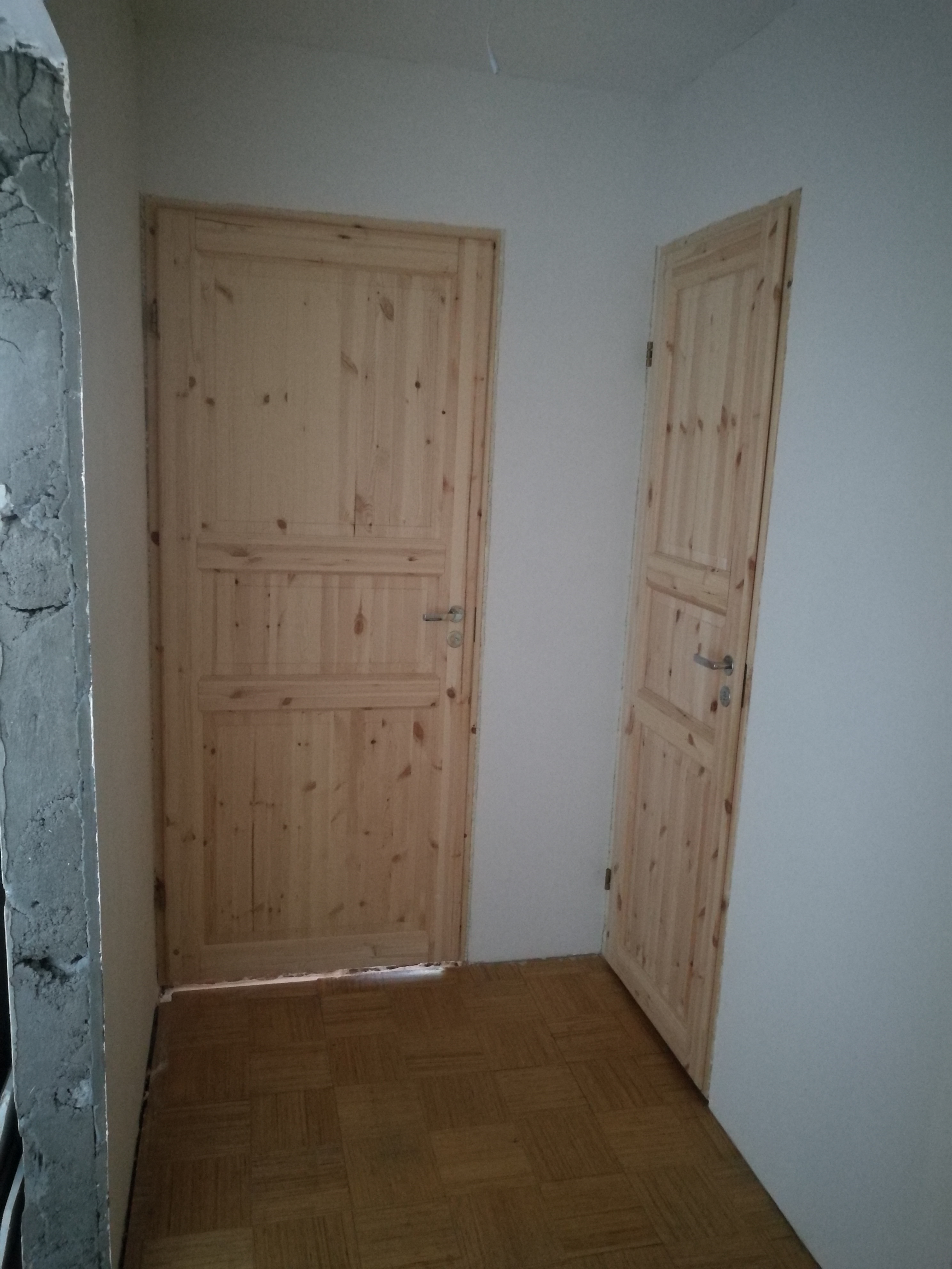 Pooleli olevas osas (kahetoalise korteri esik suurusega 10,5 ruutmeetrit), osaliselt on teostatud lae ja seinte pahteldamine, teostatavad tööd: pahteldamine, struktuurkrohvi paigaldamine seintele (materjal olemas) ja värvimine, lae värvimine, laminaatpõranda ja liistude paigaldamine.