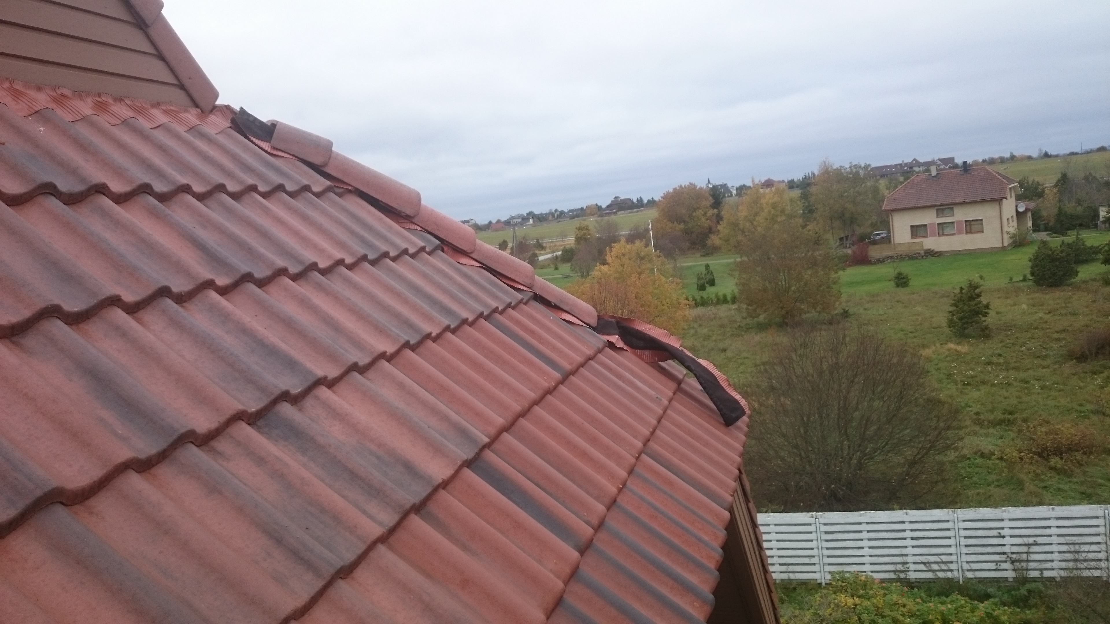 Eramu katuse 2 kaldharja ,pikkusega ca.2,5m kumbki, vajavad renoveerimist sest kaldharja kivid olid paigutatud ilma roovita ning tuulega libisesid paigast.