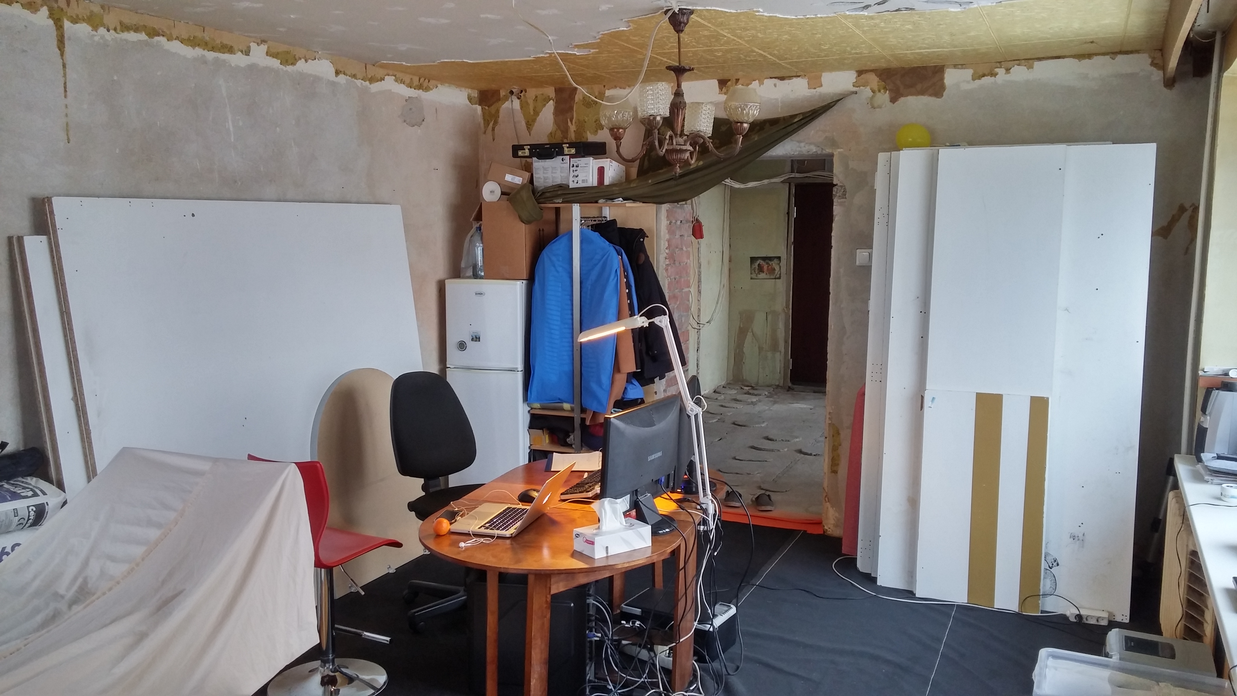 Korteri põranda, seinte ja lae ehitus ilma lõppviimistluseta. Põrandale puitkarkass ja lamineeritud saepuruplaat.