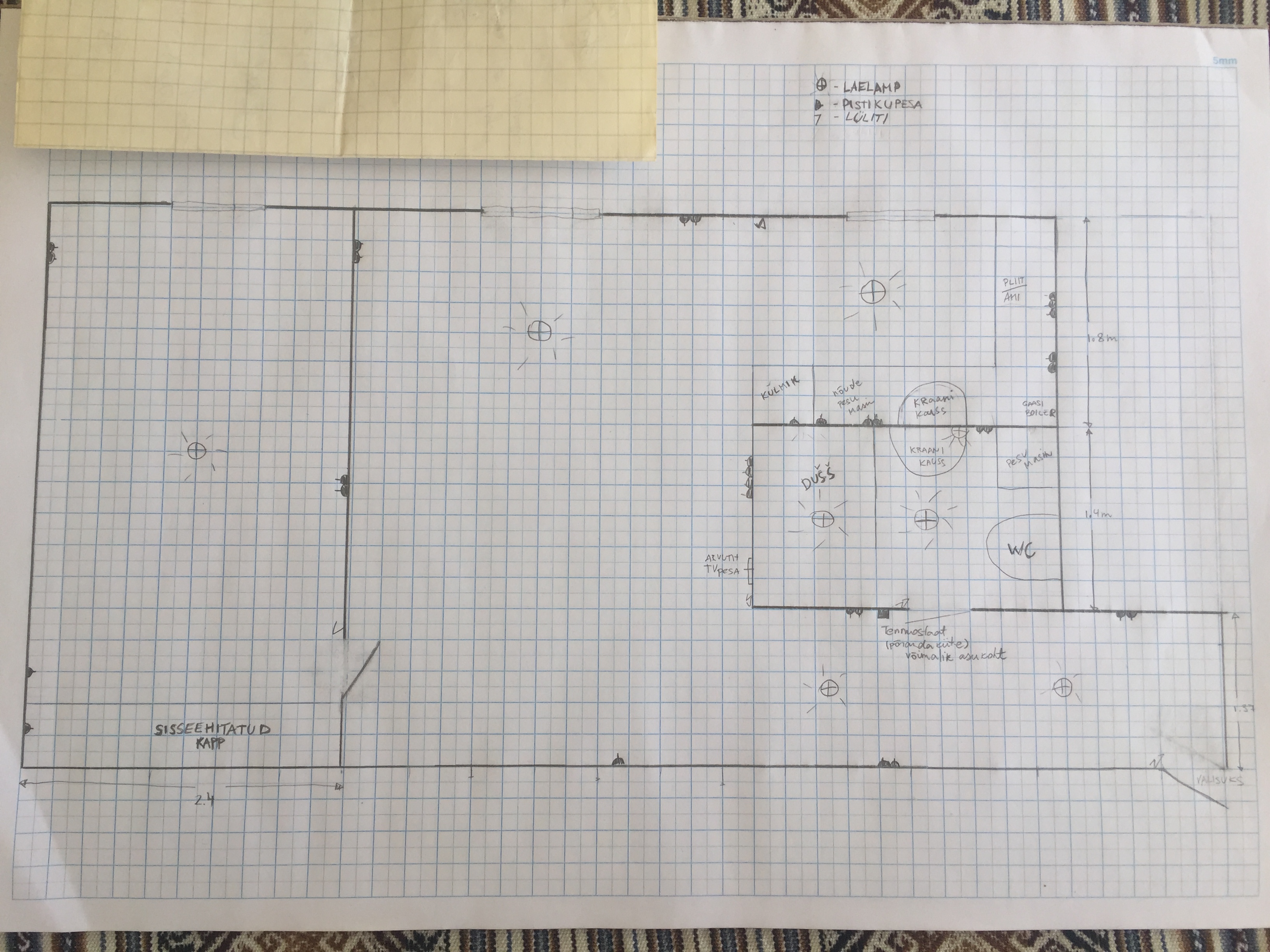 • Manuses olevale joonisele on märgitud pistikute, lülitite ja lampide asukohad. Pistikute asukohta saab mingil määral muuta, jooksvalt läbirääkimiste käigus, kui nt alternatiivne asukoht lihtsam ja sobib.