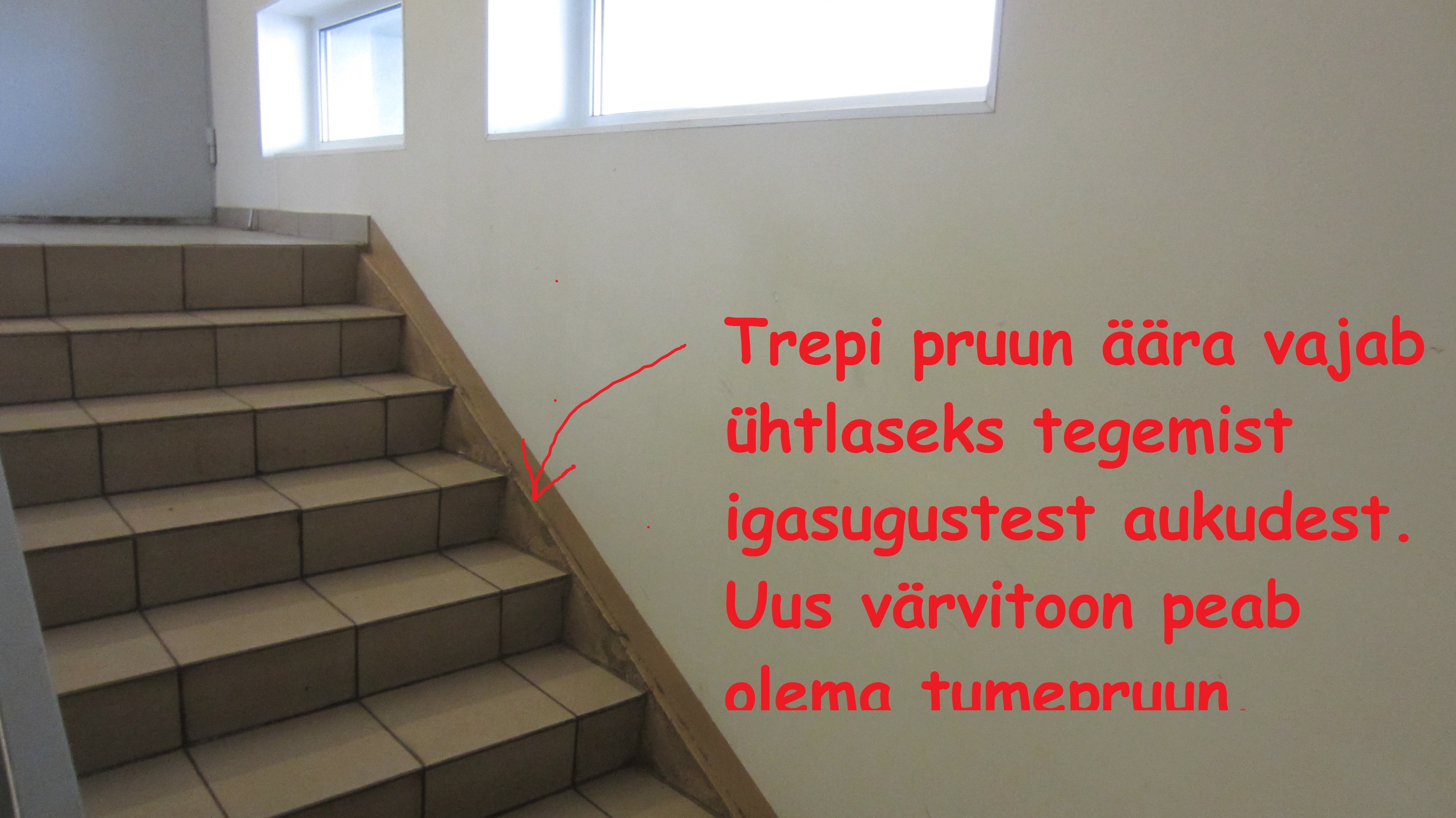 1) Trepikoja seinad. Pahteldada, lihvida, kruntida, pinnavärv (2 korda). Pinnavärviks tuleb helekollane. Trepiäärest on vaja ühtlustada piltidel olev helepruun osa ja värvida. Värvid peavad olema võimalikult kulumiskindlad ja kergesti puhastusvahenditega puhastatavad.