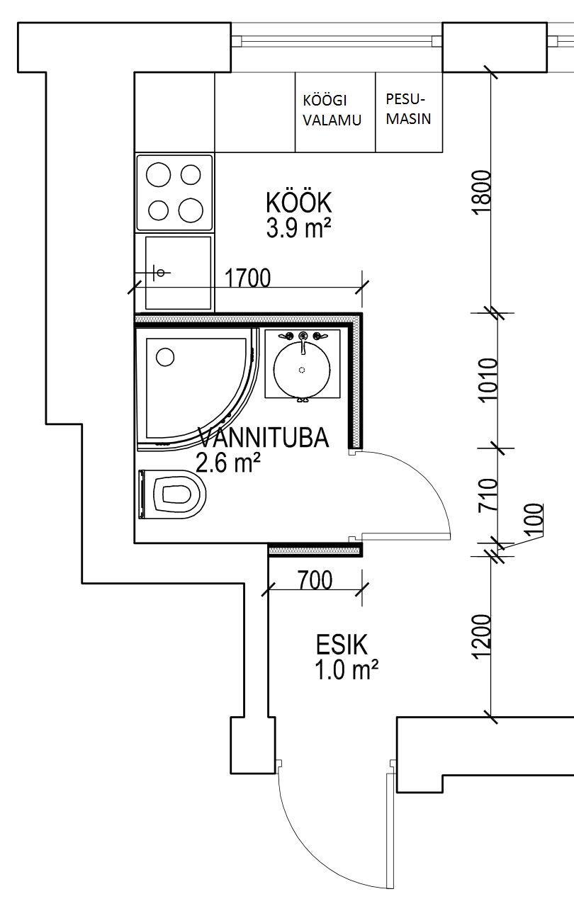1. Vajalik ehitada vannitoa kipsist metallkarkassile seinad (plaanil märgitud tumedaga). Sisemine vannitoa kips peab olema kahekordne.