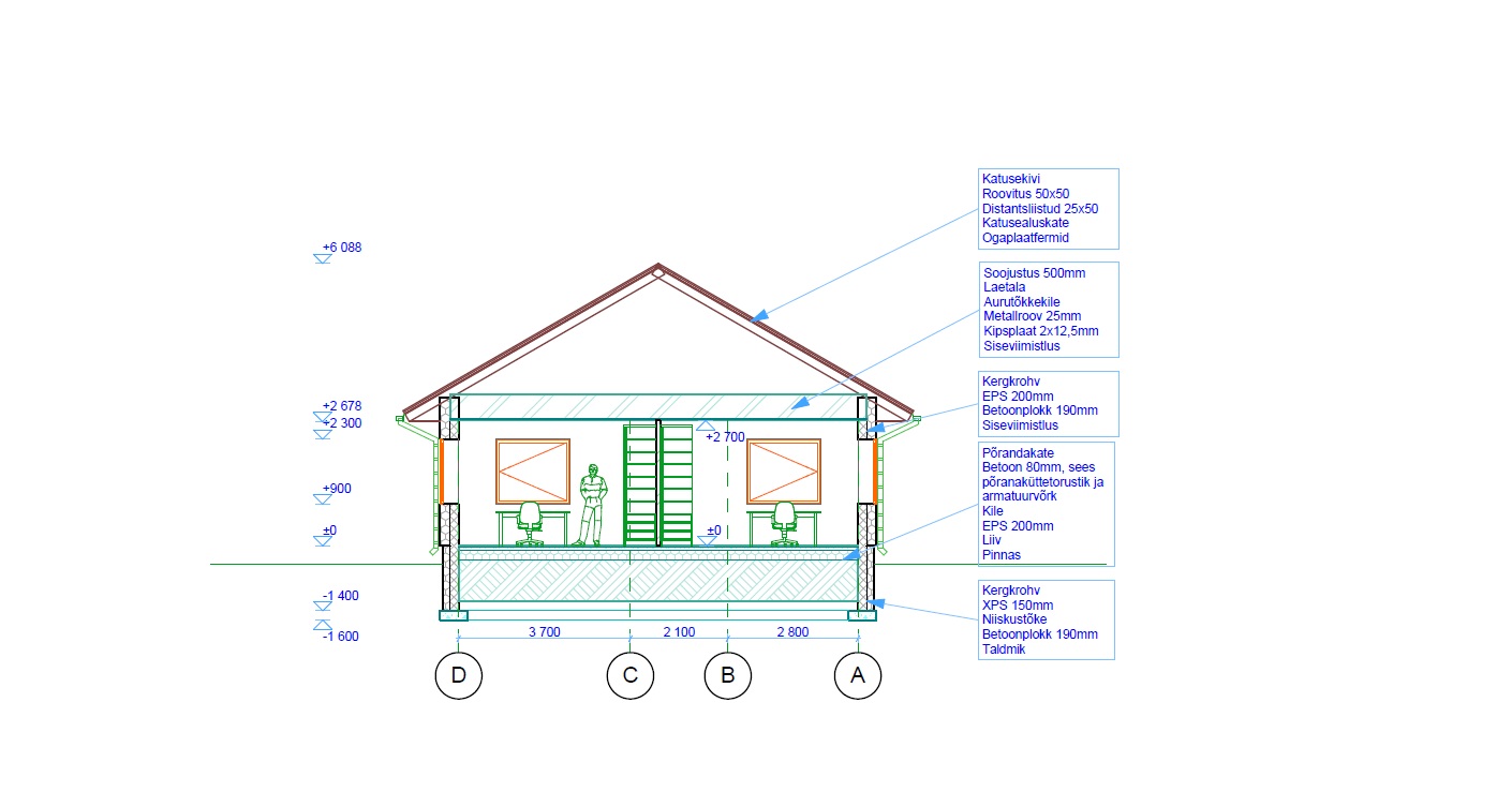 Ehitusprojekt eelprojekti staadiumis. Energiaarvutused ja energiamärgise koostamine. Kooskõlastused ehitusloa saamiseks, ehitusloa hange KOV. Pakkumishind eeldab hoone arh-eh projekti kõikide korrektsete jooniste (v a asendiplaan) olemasolu.