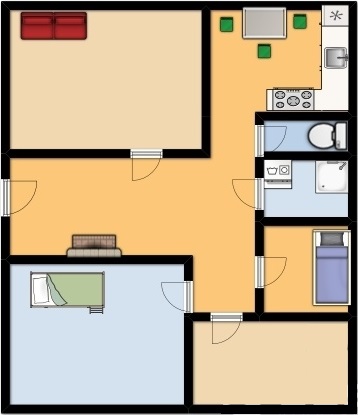 Korter asub esimesel korrusel. Pildil helesiniselt tähistatud toa all on keldriruum, kuhu tuleb paigaldada kogu kütteseadmestik.