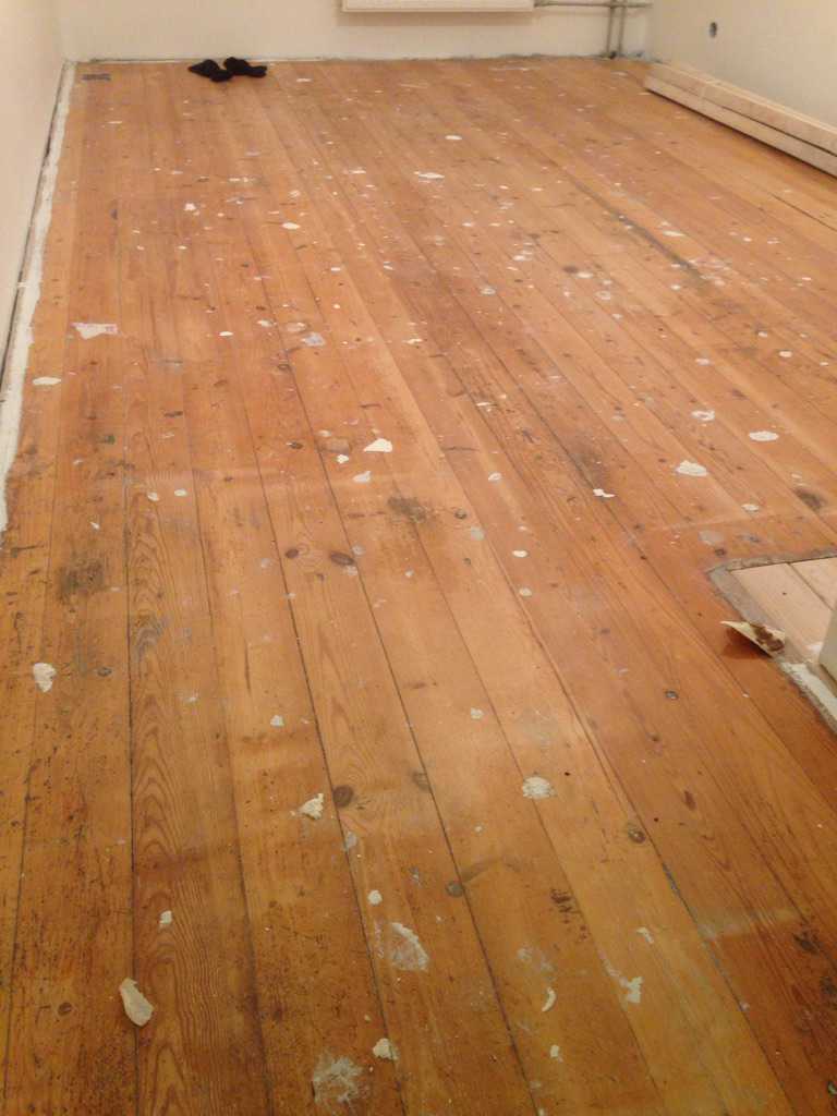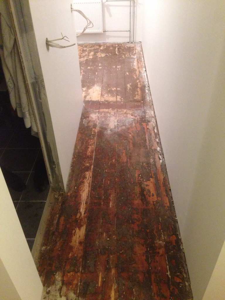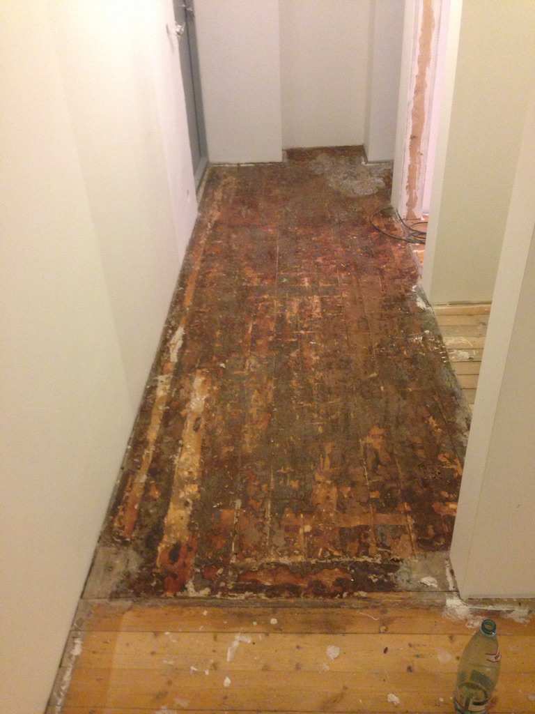 Kaks tuba on varasemast ajast juba korra lihvitud ning on enamvähem viisaka väljanägemisega. Koridor, ca 5m2, oil kaetud linoleumiga, mis kunagi oli sinna liimiga pandud. Linoleum on eemaldatud, aga põrandal endiselt liimijäägid. Niipalju kui sai siis eemaldasin seda pahtlilabida ja peitliga.
