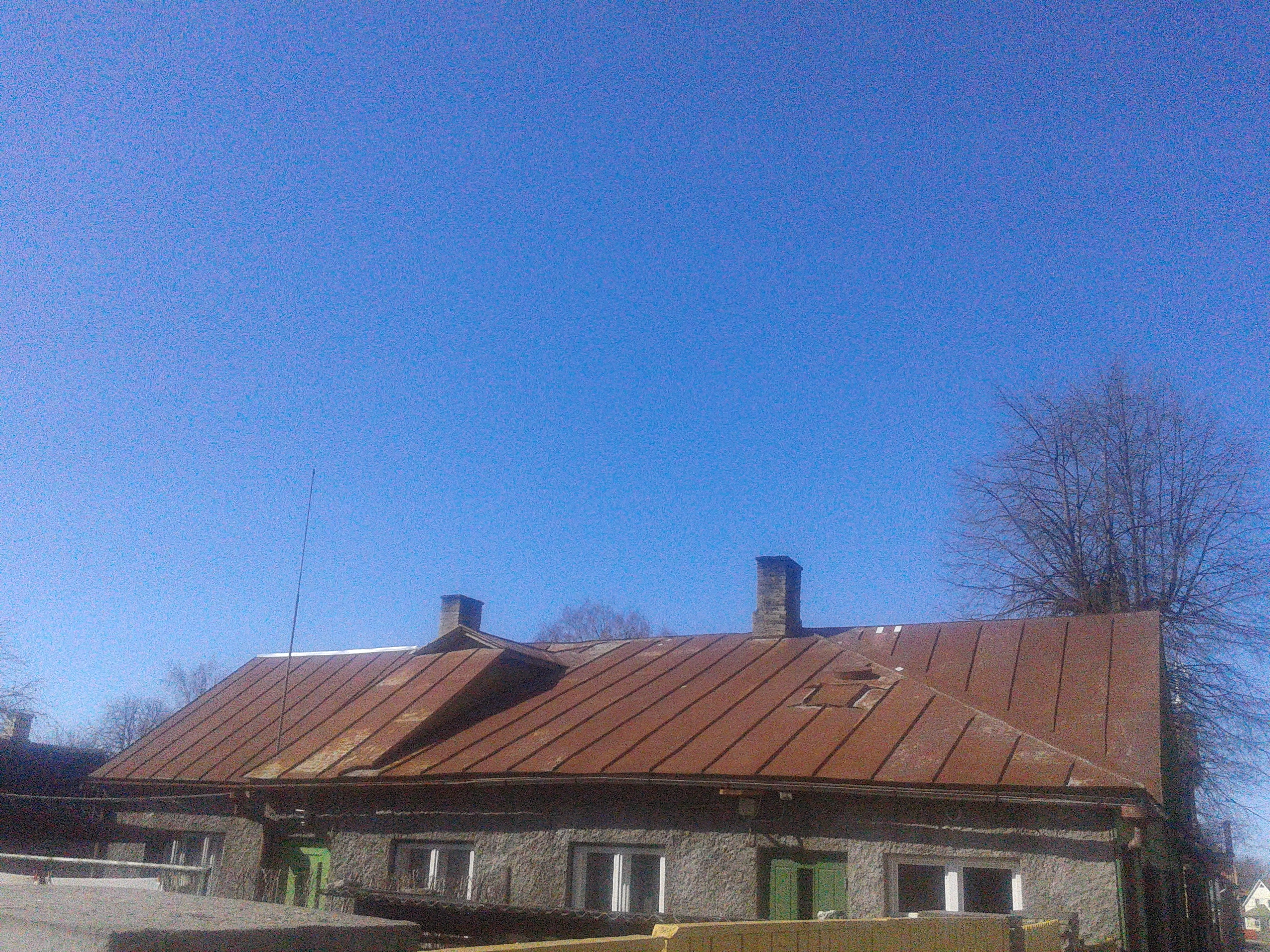 Vaja vahetada eramaja katus Haapsalu linnas. Praegu on peal plekk, mis osaliselt kaetud eterniidiga. Asemele tuleb plekk, Classic profiil. Katusel on mitu vintskappi, 3 korstnat. Kokku pinda umbes 240m2.