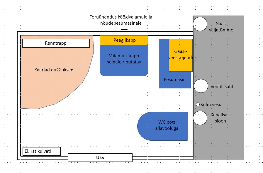 Kaarjad duššiuksed (90x190cm), renntrapi, seinasisese dušisegisti, põrandaplaadid, seinaplaadid, valamu, valamukapi ja valamusegisti, gaasiveesoojendi, WC poti, el.rätikukuivati, laevalgustid, valge niiskuskindla lehtukse 8x21.