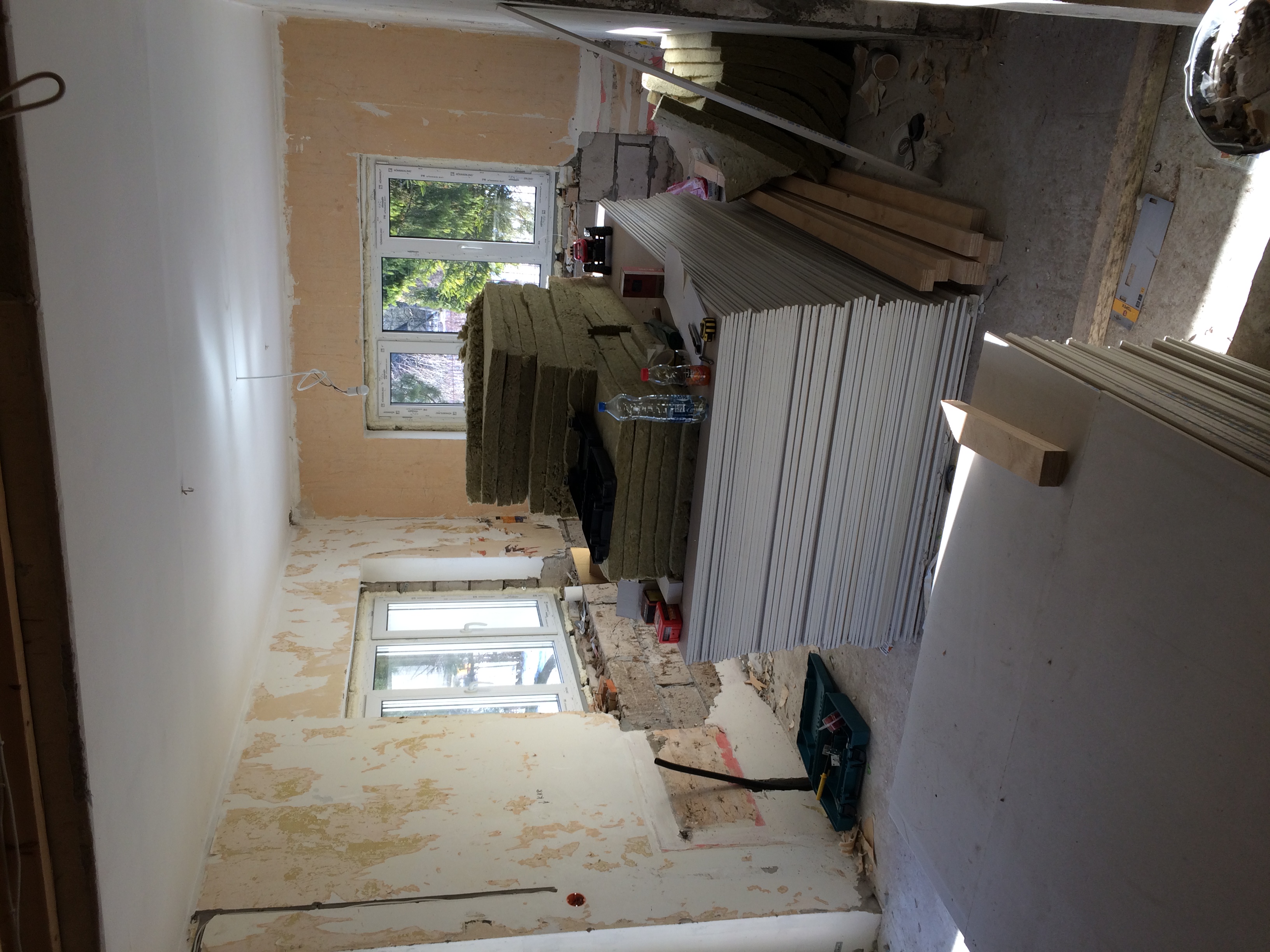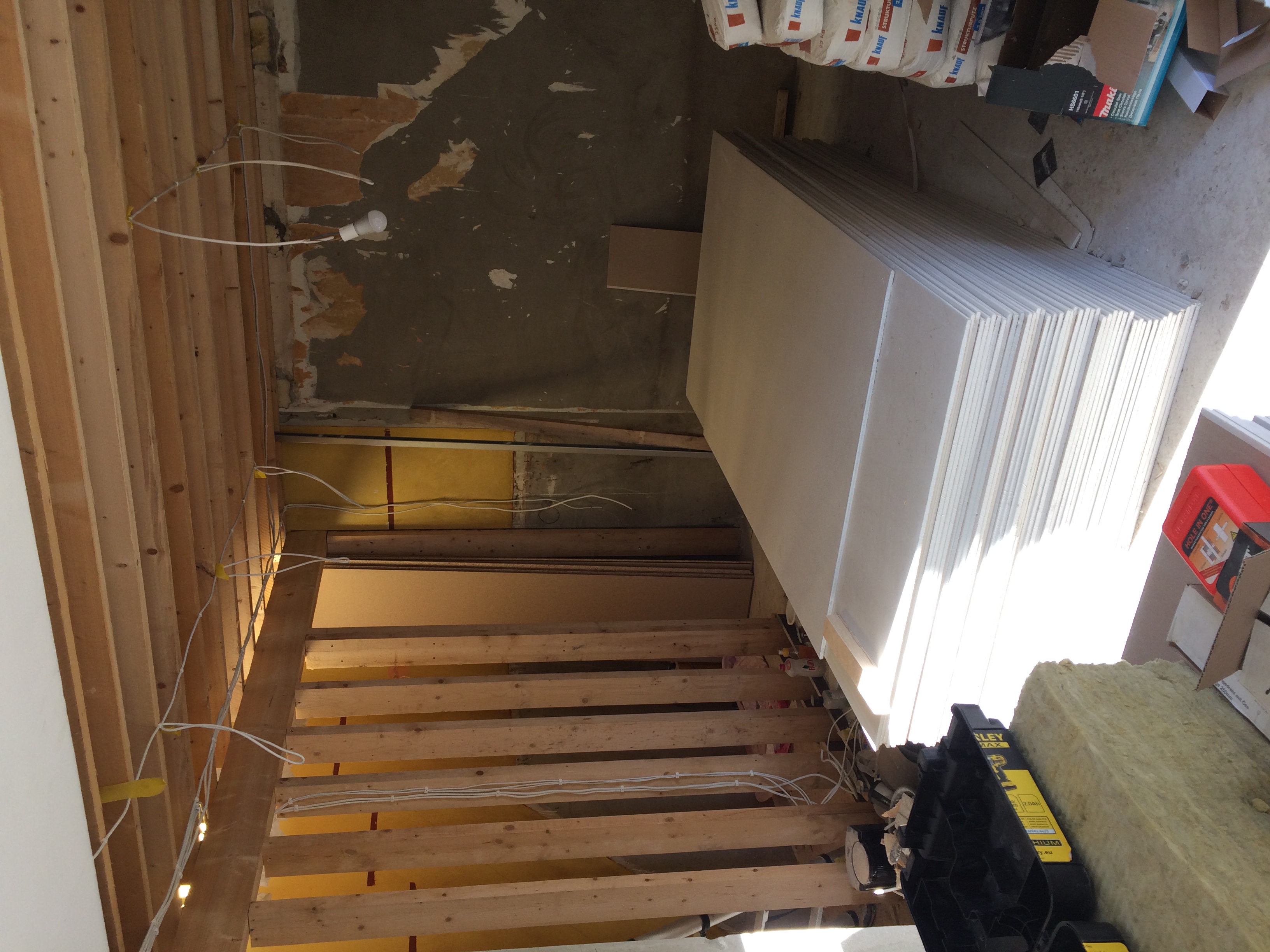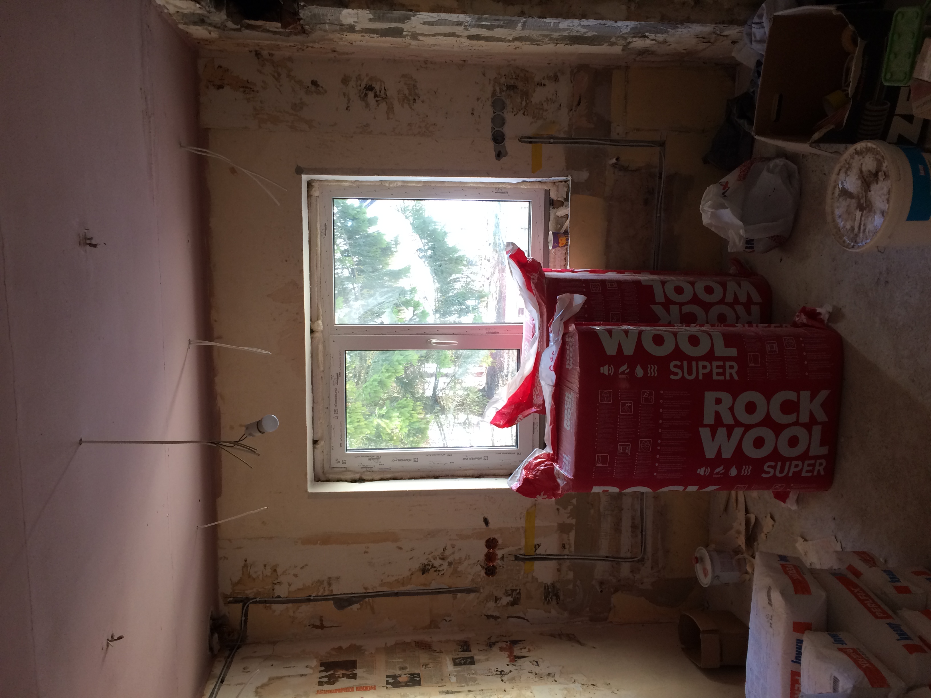 *Elutuba: Lae talade vahele vill 20cm. Riputid, karkass+kips1x. Tagumine sein (pildilt näha) karkass+ kips 1x. Uus sein OSB+kips.