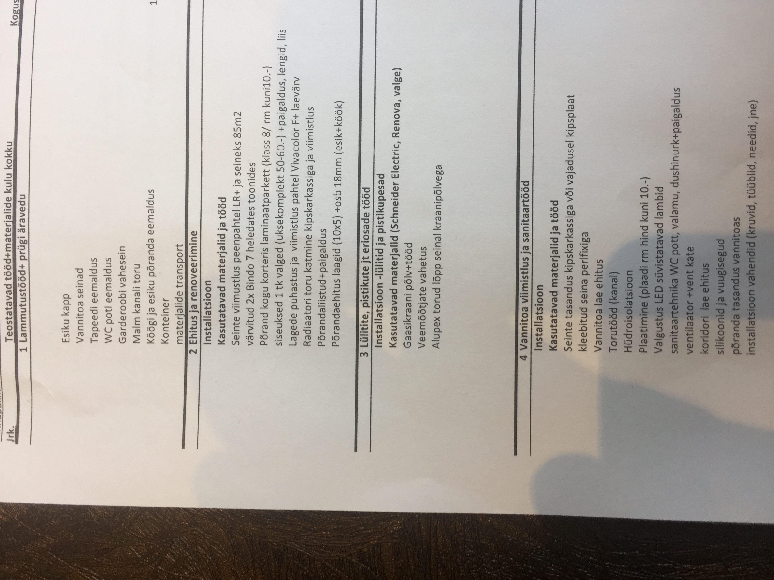 Põranda liistud, 4 ust, vannitoaseinad, panipaiga sein, esikukapp (laes),tapeedi eemaldus, wc potti eemaldus, 5 ukse raami, köögipõrand.