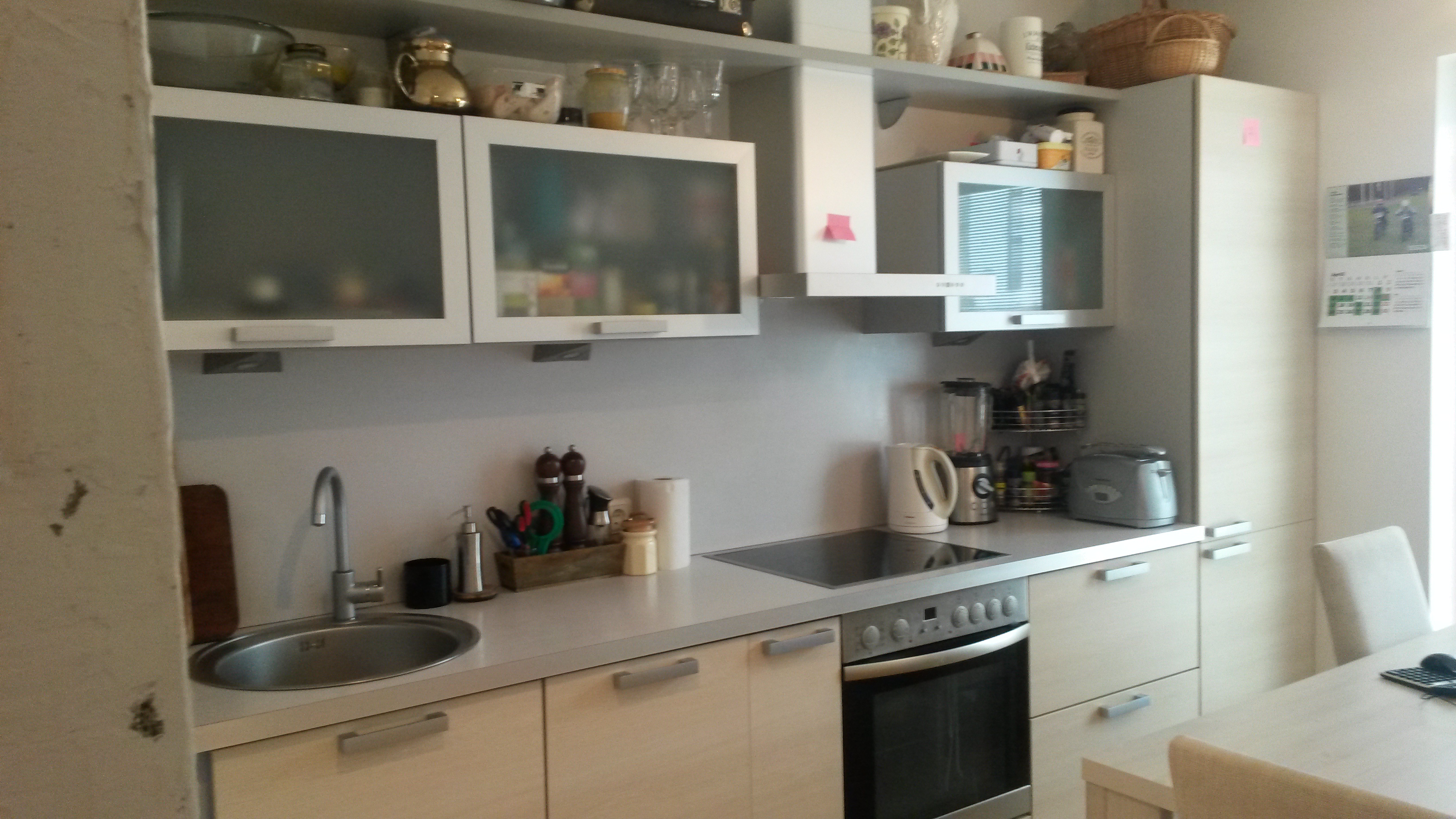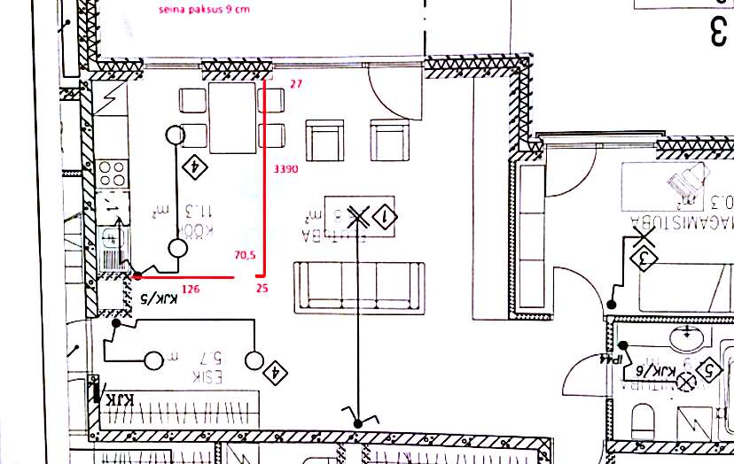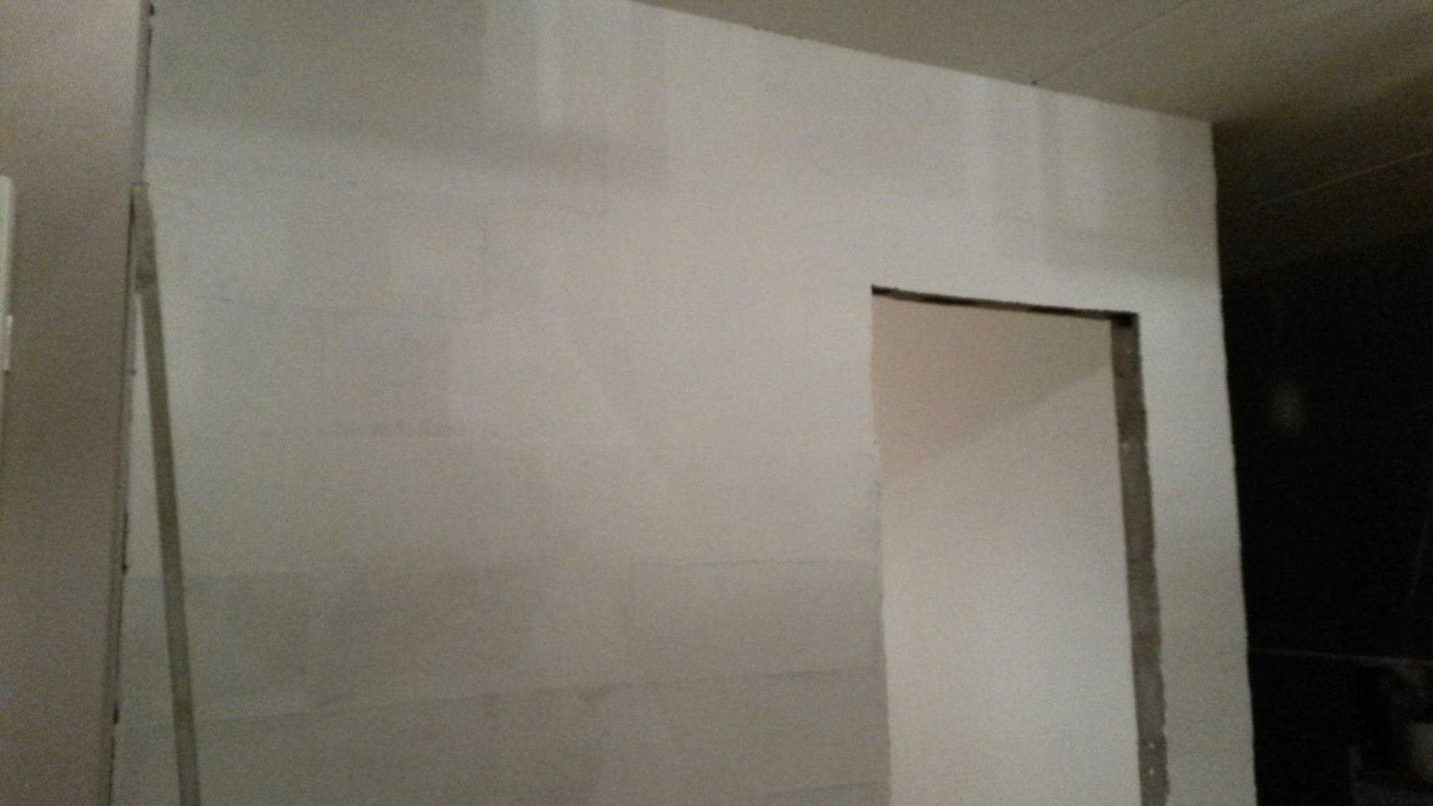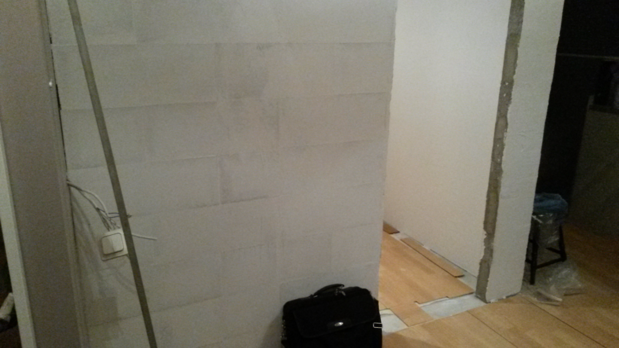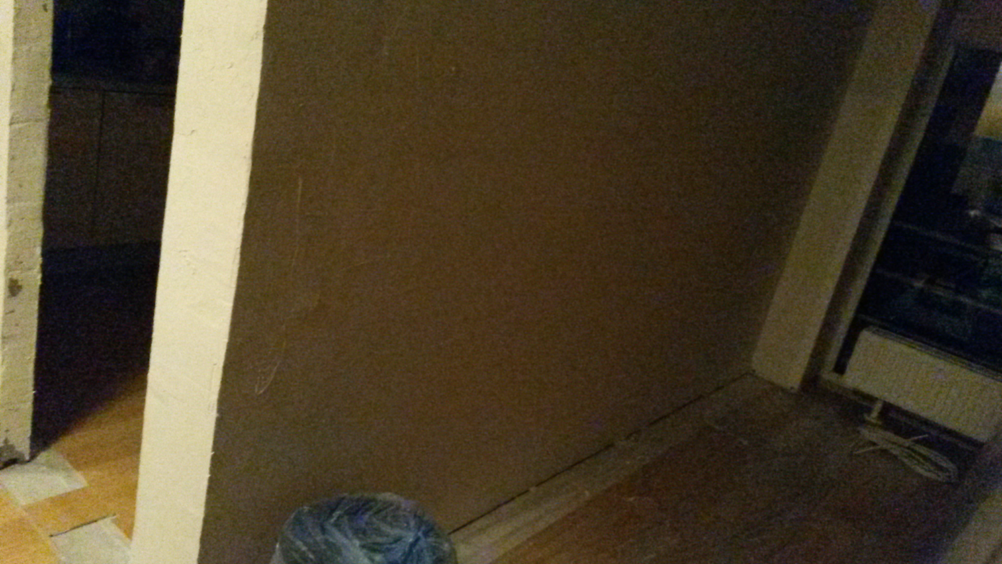 Korterisisene kivisein üles laotud ja pahteldatud. Vaja lihvida ja veel pahteldada kuni saab krundi peale. Vedada lisaelerkter ja nihutada kanalisatsiooni. Paigaldada vaheuks ja tõsta köögimööbel uude seina. Seina pindala u 30 m2.