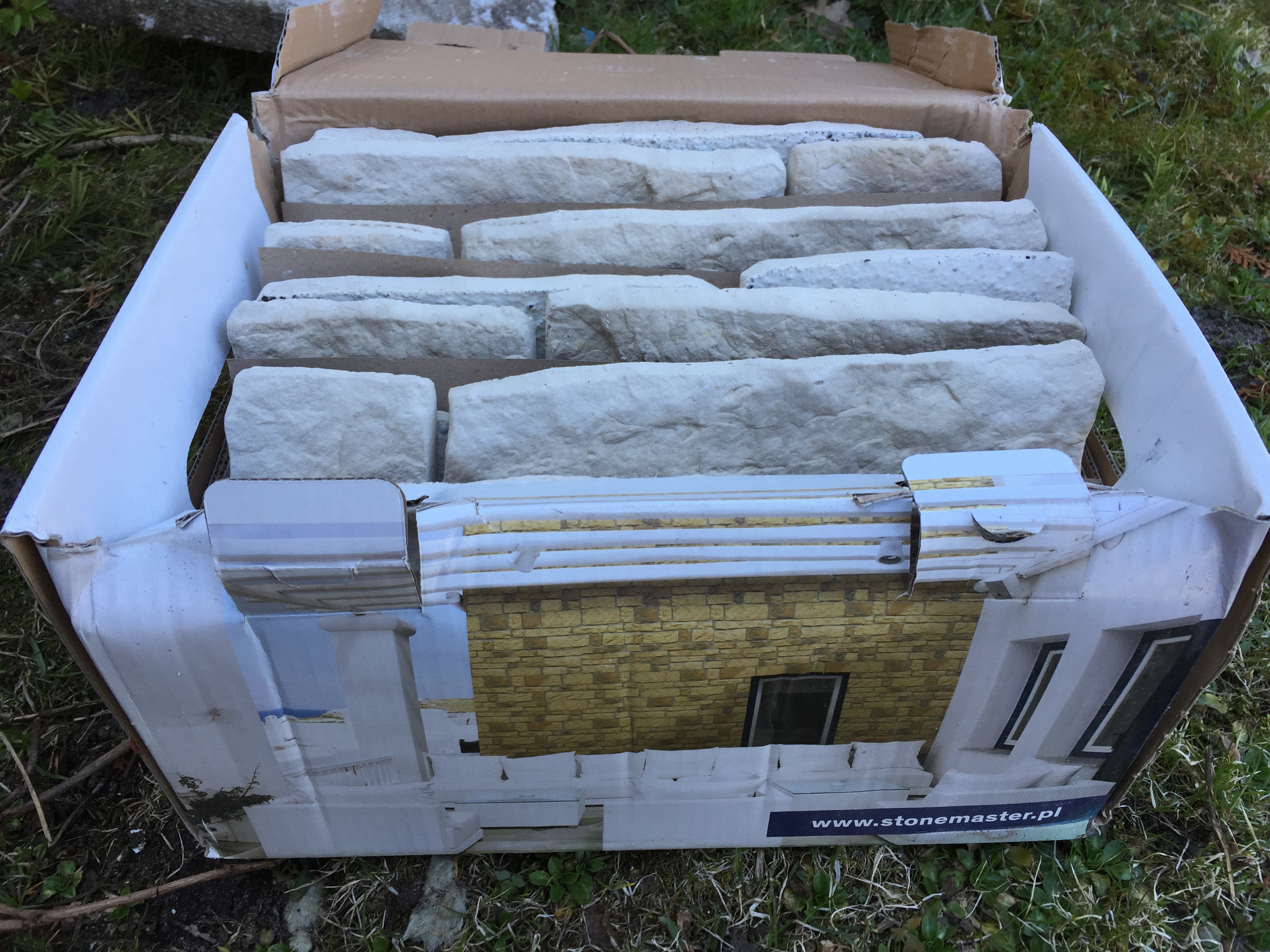Dekoratiivkivide paigaldamine ümber tellistest tugiposti ning fiboblokkidest laotud müürile.