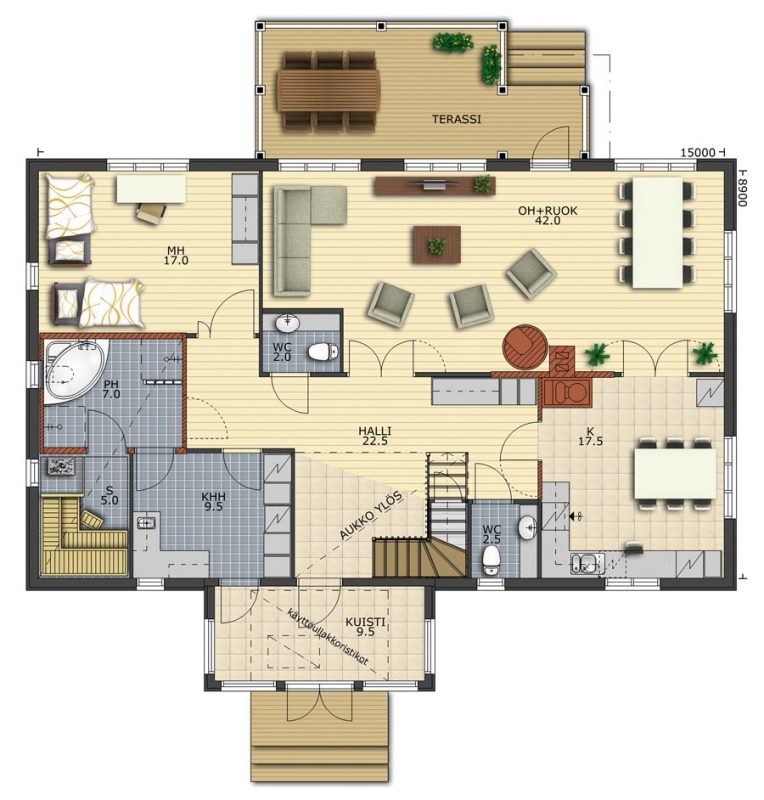 Projekt sisaldab kõiki vajalikke jooniseid ja seletuskirju mis on ette nähtud ehitusprojektis ehitusloa saamiseks / ehitusteatise esitamiseks, (ehitise arhitektuurne ning konstruktiivne lahendus, asendiplaan; korrusteplaanid, vaated ja lõiked; vundamendi plaan; krundi piirdeaed ja krundisisene haljastuse lahendus; tehnovarustuse lahendus; seletuskiri; energiaarvutused ja –märgis) vastavalt projekteerimistingimustele või Teie vajadustele. Projektile on võimalik koheselt juurde plaatvundamentide hinnpakkumine, koduaia kujundusplaan jpm Tasumine etappide valmimisel (mõõdistamine, eskiisprojekt, eelprojekt, põhiprojekt) - Eskiisprojekt sisaldab põhiplaani ja visualiseeringut, 500€, - Eelprojekt sisaldab asendi-, vundamendi - ja põhikorruse plaani, nelja vaadet ja kahte 3D visualiseeringut koos seletuskirjaga. 500€; - Ehitulsloa kättesaamisel 250€. Eskiislahenduse valmimine ca 5 tööpäeva, eelprojekti valmimine ca 10 tööpäeva. Projekt digitaalselt koos 3D –visualiseeringuga teostatakse ArhiCAD formaadis, vajadusel salvestatakse töö AutoCAD-is ning esitatakse kliendile edaspidist arendust võimaldavas vormis. |