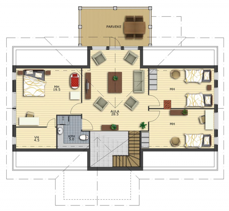 Projekt sisaldab kõik, mis on ette nähtud ehitusprojektis ehitusloa saamiseks , s.t. ehitise arhitektuurne ning konstruktiivne lahendus, asendiplaan; korrusteplaanid, vaated ja lõiked; vundamendi plaan; krundi piirdeaed ja krundisisene haljastuse lahendus; tehnovarustuse lahendus; seletuskiri; energiaarvutused ja –märgis; ning kõik muu, mida juurde on vaja vastavalt projekteerimistingimustele või Teie vajadustele. Projekt digitaalselt koos 3D –visualiseeringuga. |