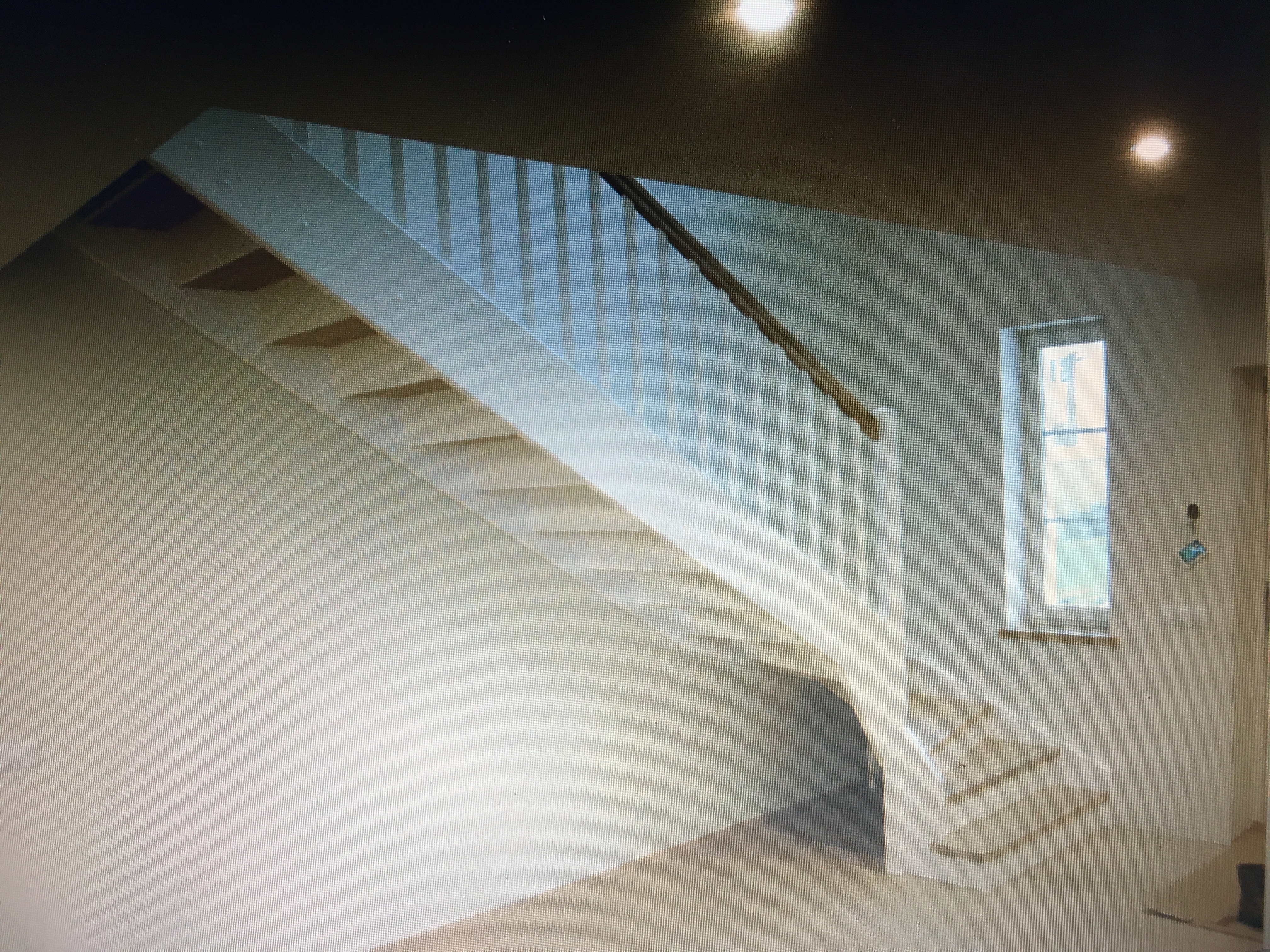 Viimistlus: käsipuupostid jraam on valged, astmed ning käsipuu õlitatud helepruunid (pähkel)