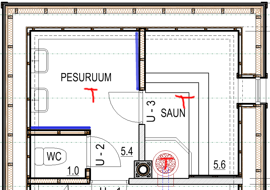Sauna, wc ja pesuruumi plaatimine. Kokku 12 ruutu. Põrandad on valatud ja kalletega. Kokku kaks trappi ja üks ventilatsiooniava (joonisel punasega). Pesuruumi osale vaja teha ka niiskustõke. Lisaks tuleb kahte pesuruumi seina seina peale ka üks rida plaate (joonisel sinisega). Plaadid esialgu planeeritud 10x10cm.