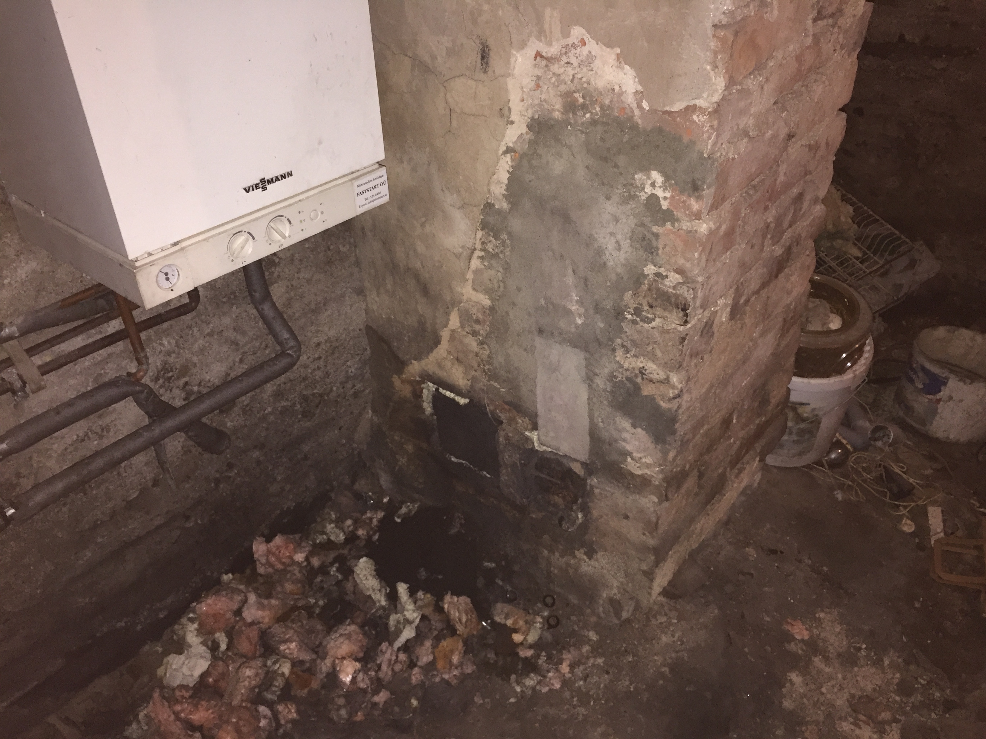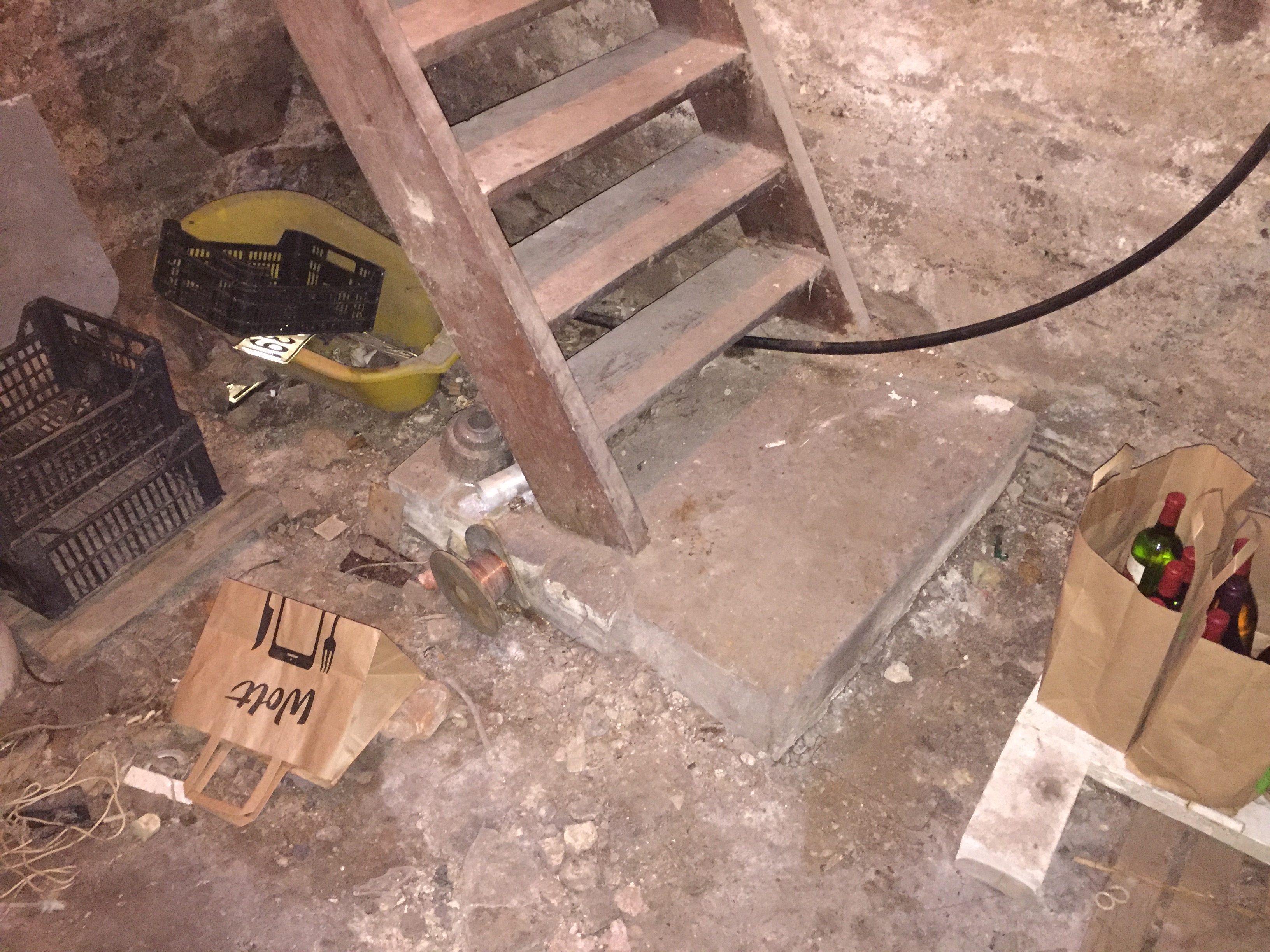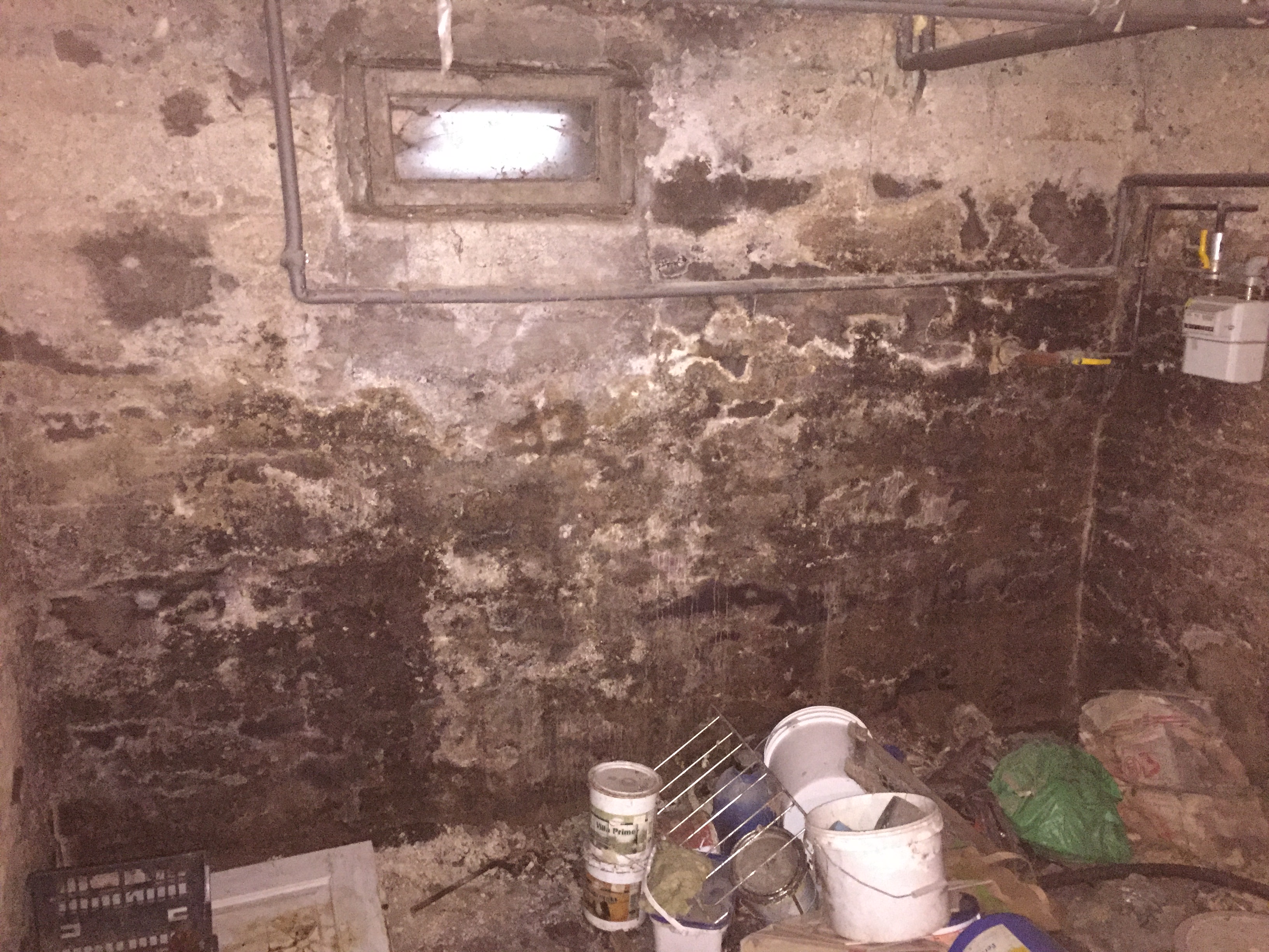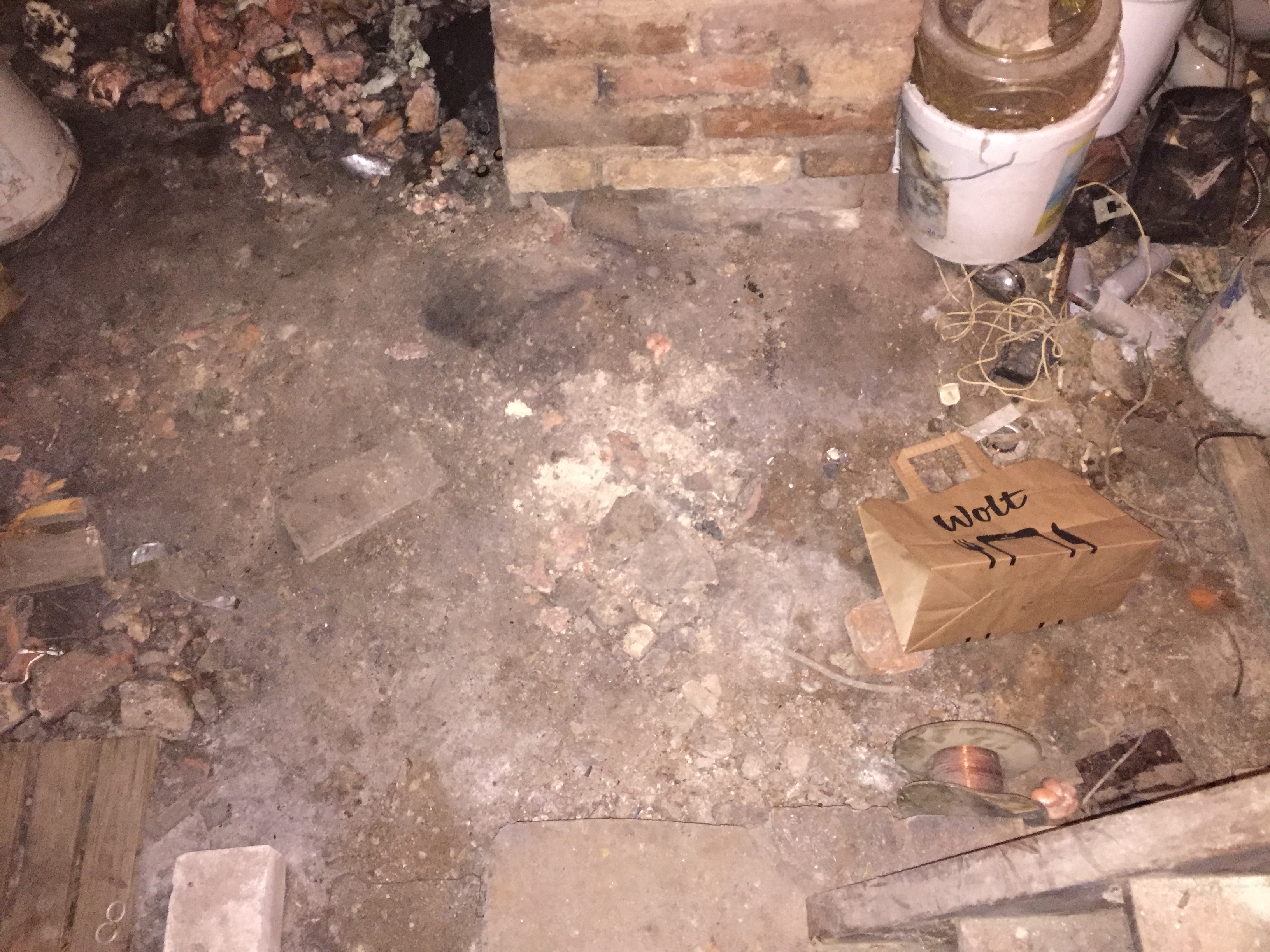 Eesmärk on saada kelder-katlaruum kuivaks, puhtaks ning eemaldada niiskus. Olemasolev krohv seintel pudeneb, välissein (2,9m) on märg, korstnajalale on vaja paigaldada tahmaluuk ning krohvida. Piltidel näha olev rämps saab omal jõul eemaldatud.