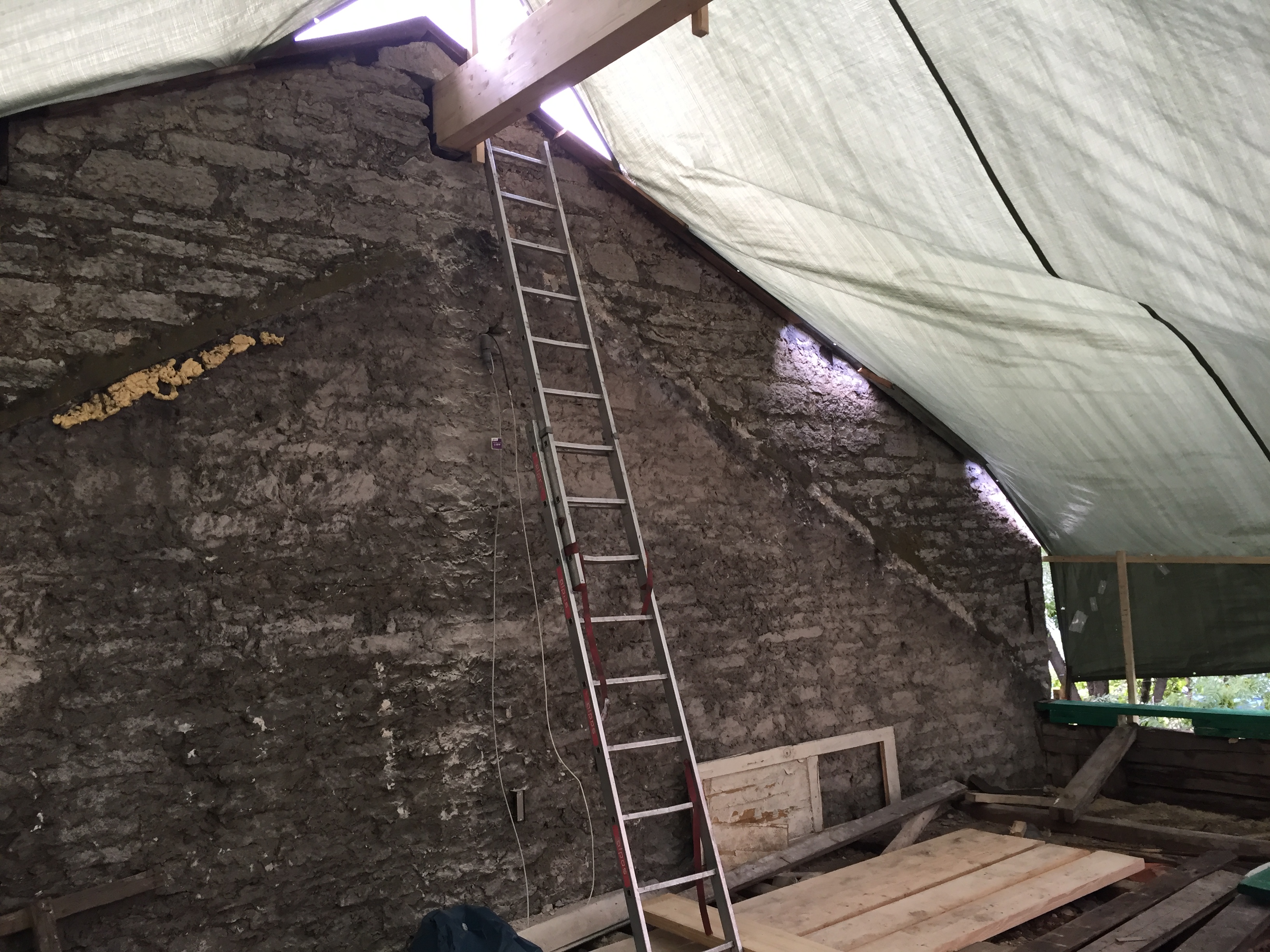 Kuna maja katus tõuseb harjast 1m, siis vaja paekivi müür laduda kõrgemaks harjast 0,8 -1m. Müür ise 40cm paksune. Kivid olemas. Müüri pikkus 7m ,mis jookseb , siis harjast nulli räästasse. Kokku müüri 14jm/ 7m2/ 3m3.