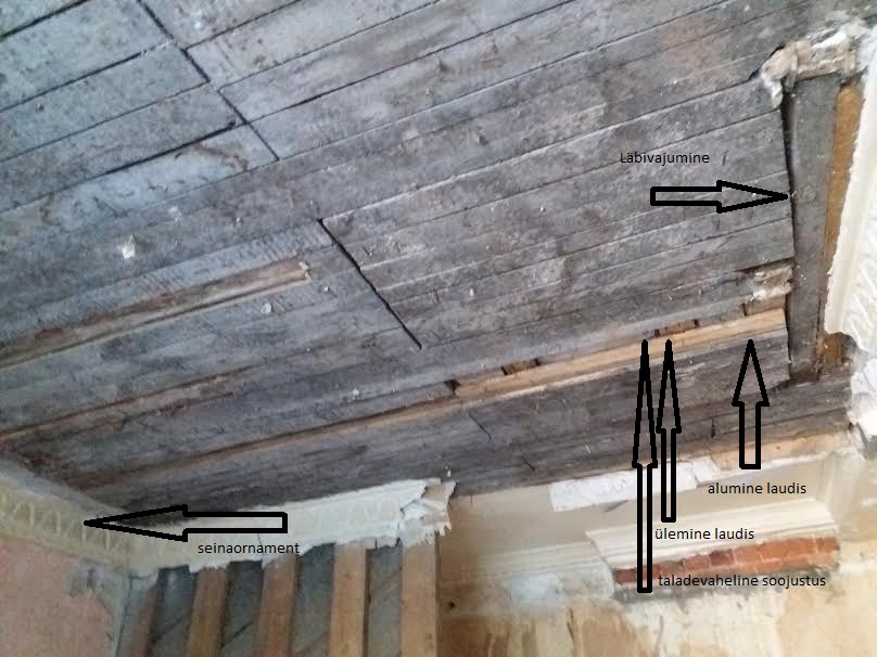 Must lagi on kahekordseselt löödud 1" laudadest, mis on naelutatud altpoolt vahetult taladele. Talade vahed on soojustatud liiv-lubja seguga mille peal on räbukiht. Soojustuse paksus kokku on ca 40-44 cm.