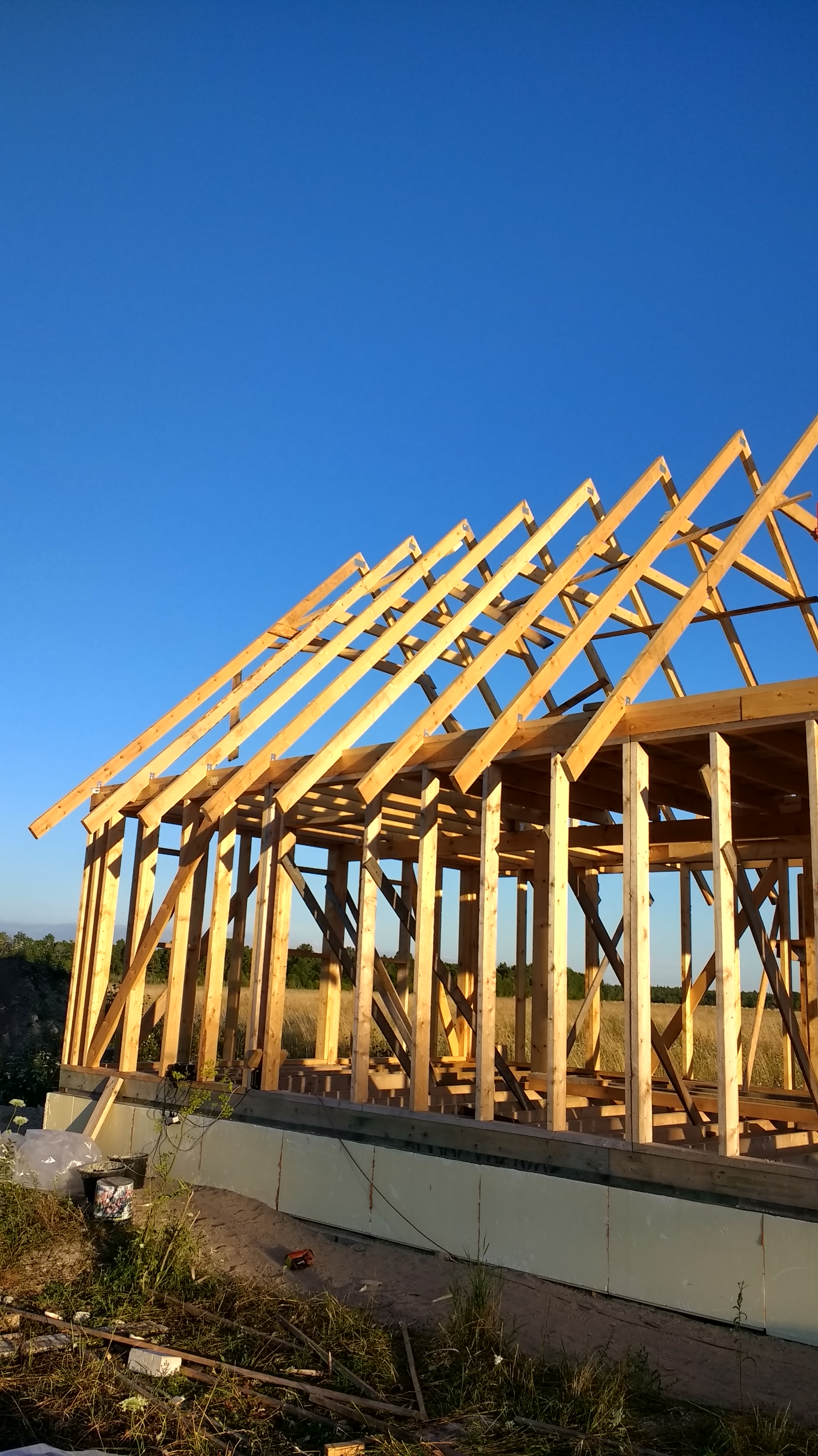 Puitmaja sarikatele katusekile ja plekk-katuse paigaldus. Katuse kalle on 45 kraadi. Katuse alune pindala on 7x12 m. Sarika külje pikkus on 6 m ja on paigaldatud. Augustis.
