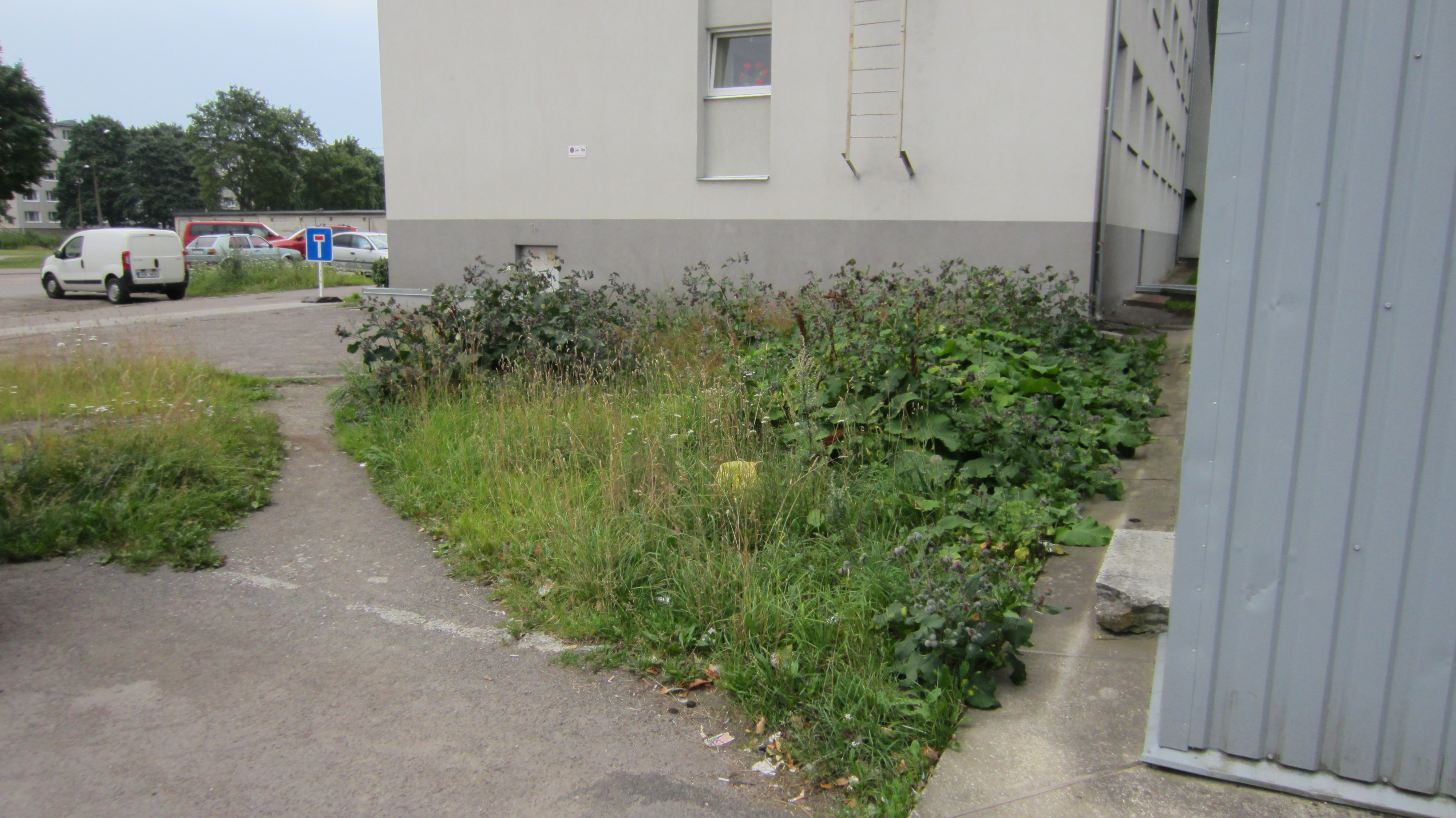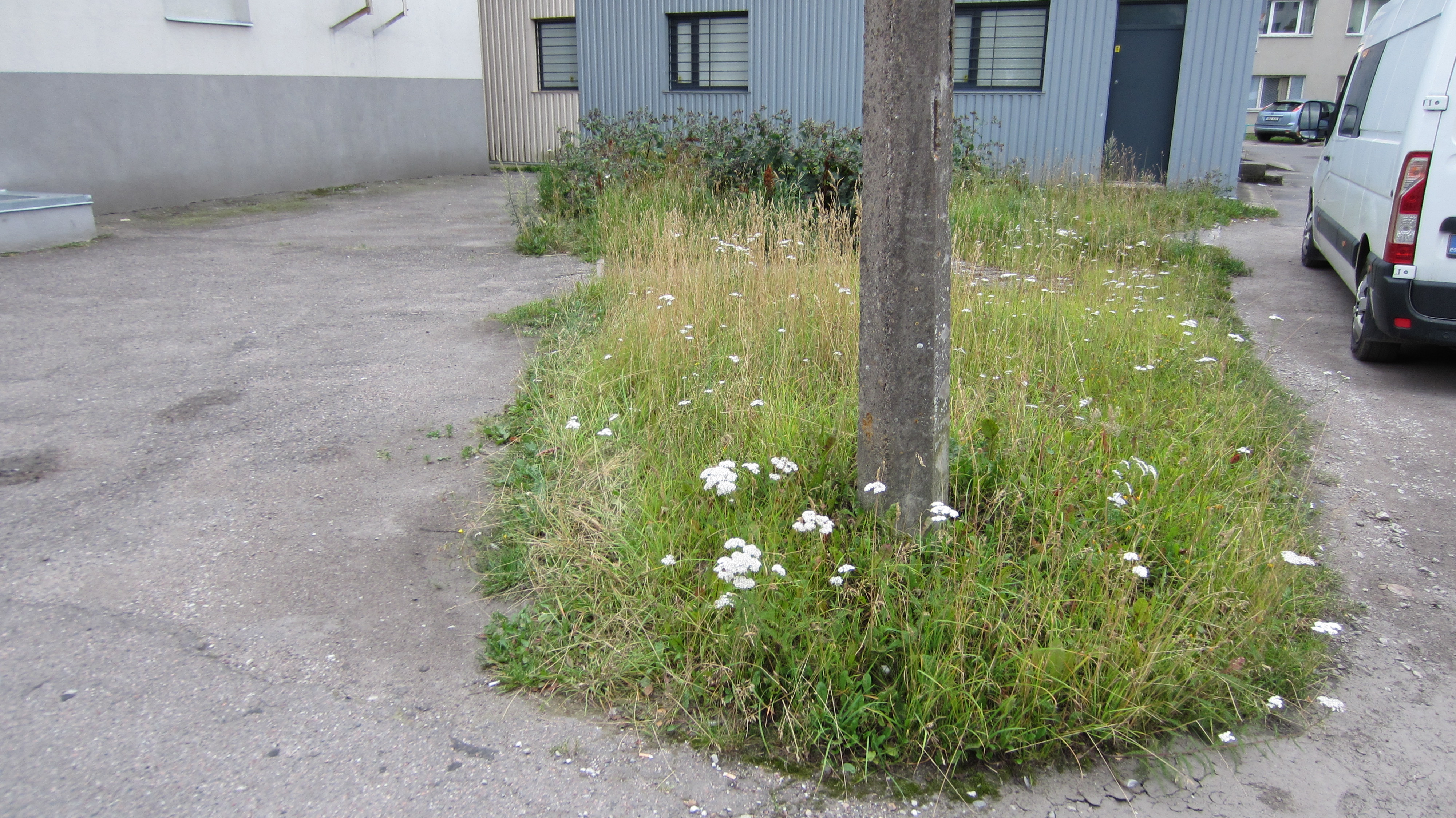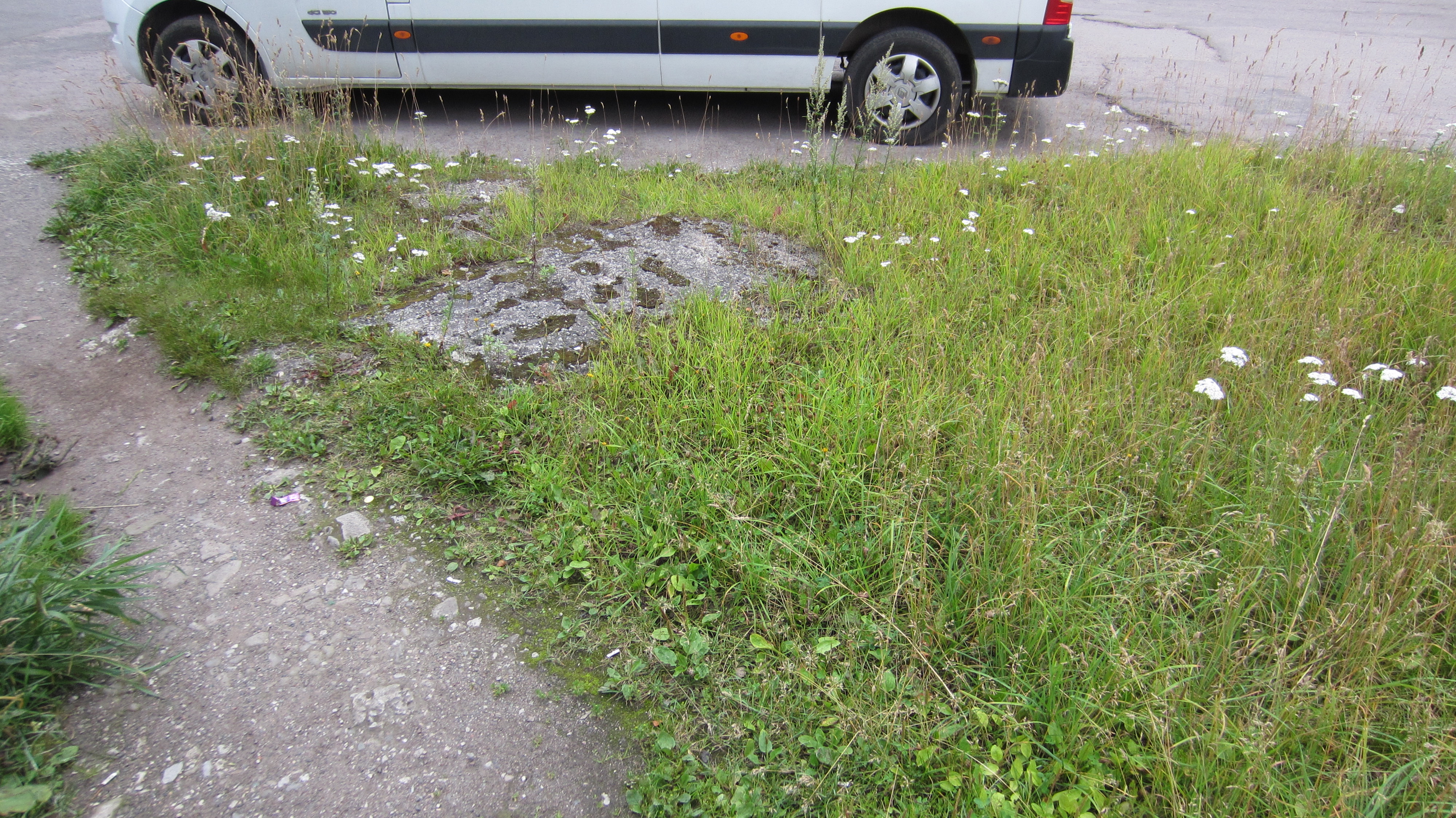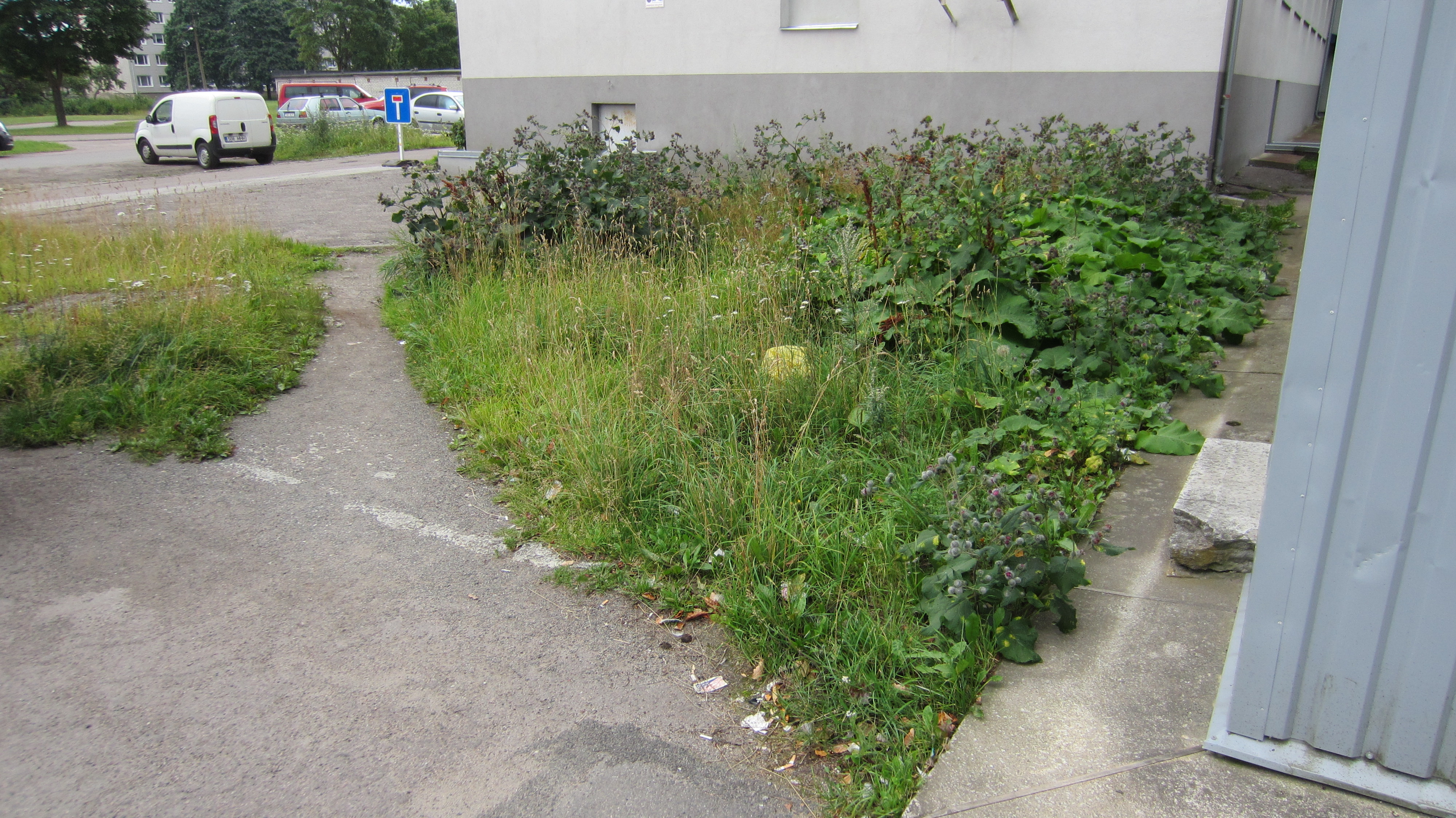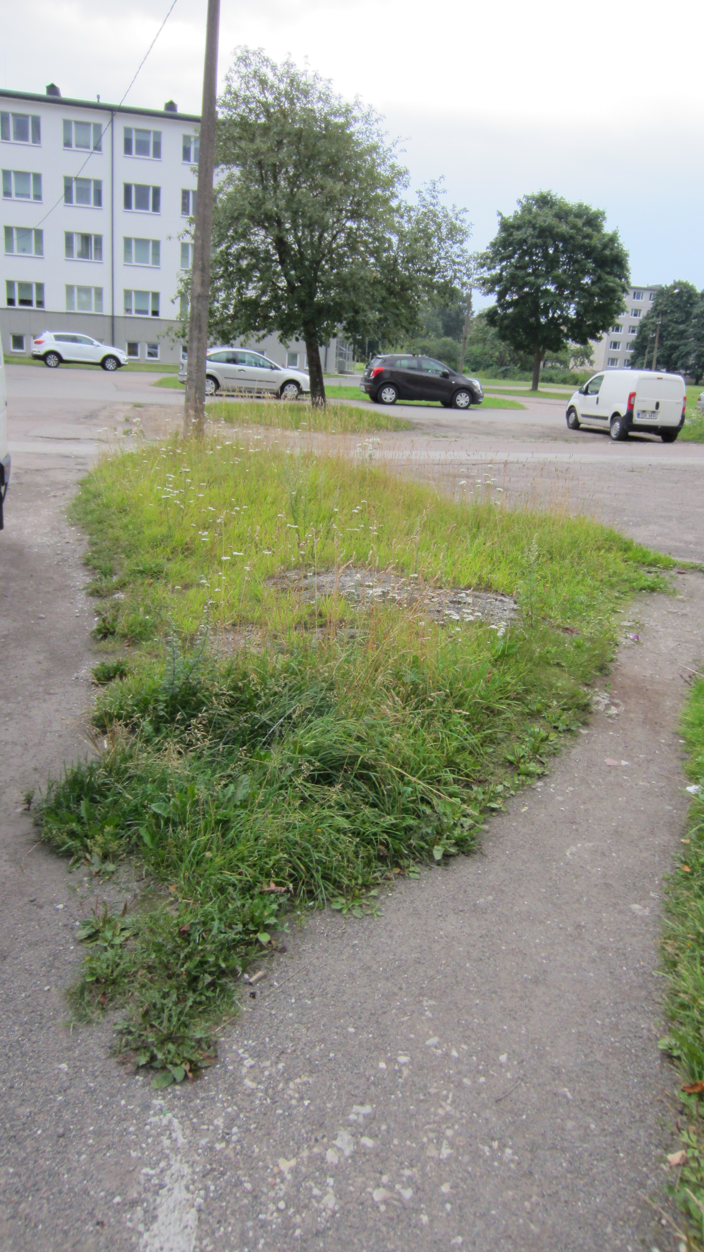 Kolmnurkne osa on ääristatud asfaltiga ning mingi osa on taimestikust üle piirde kasvamas. Üle piirde olev osa tuleb juurtega eemaldada ja kolmnurkse pinna seest samuti kogu olemasolev umbrohuväli koos juurtega puhastada. Kolmnurkne siseala tuleb pärast umbrohu eemaldamist katta korraliku mullaga ja pressida ühtlaselt sirgeks. Muruseemne külvab tellija ise.