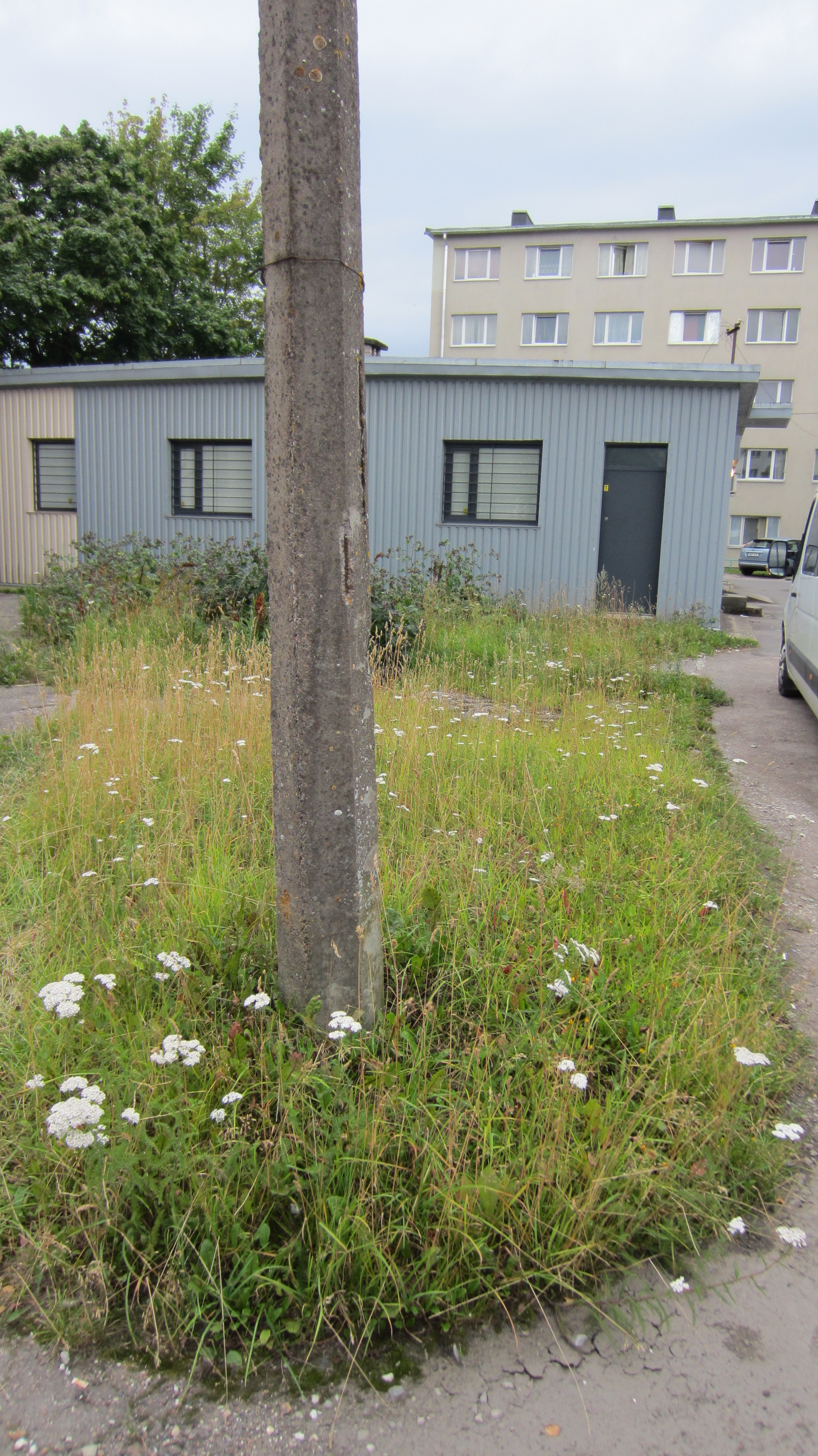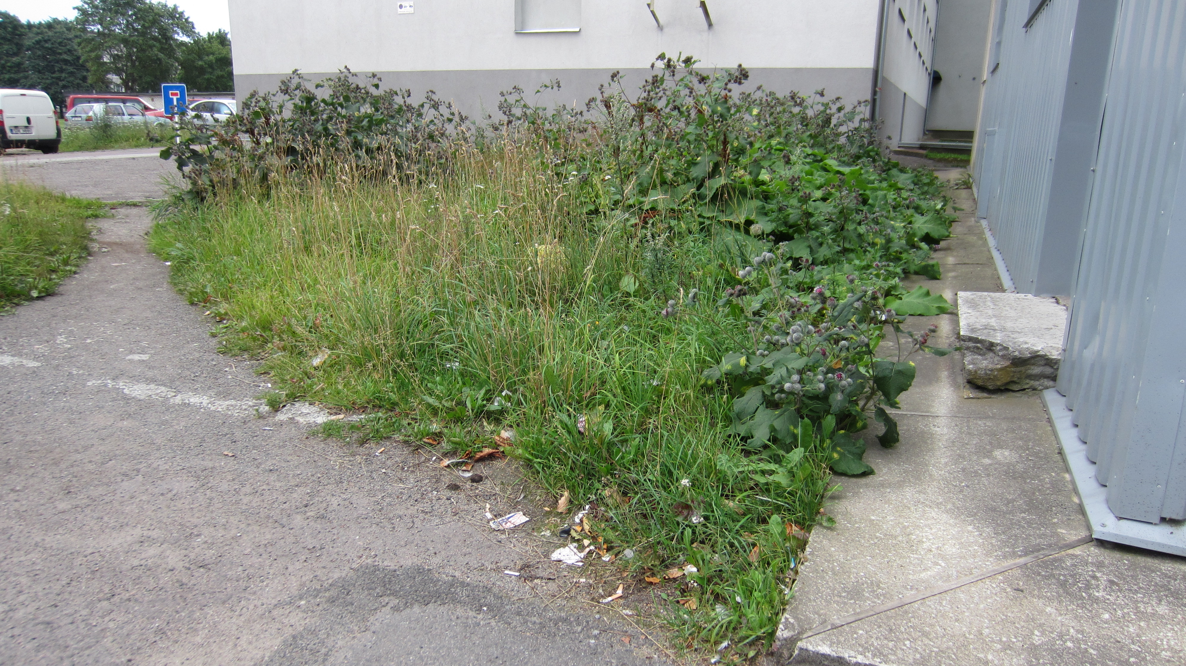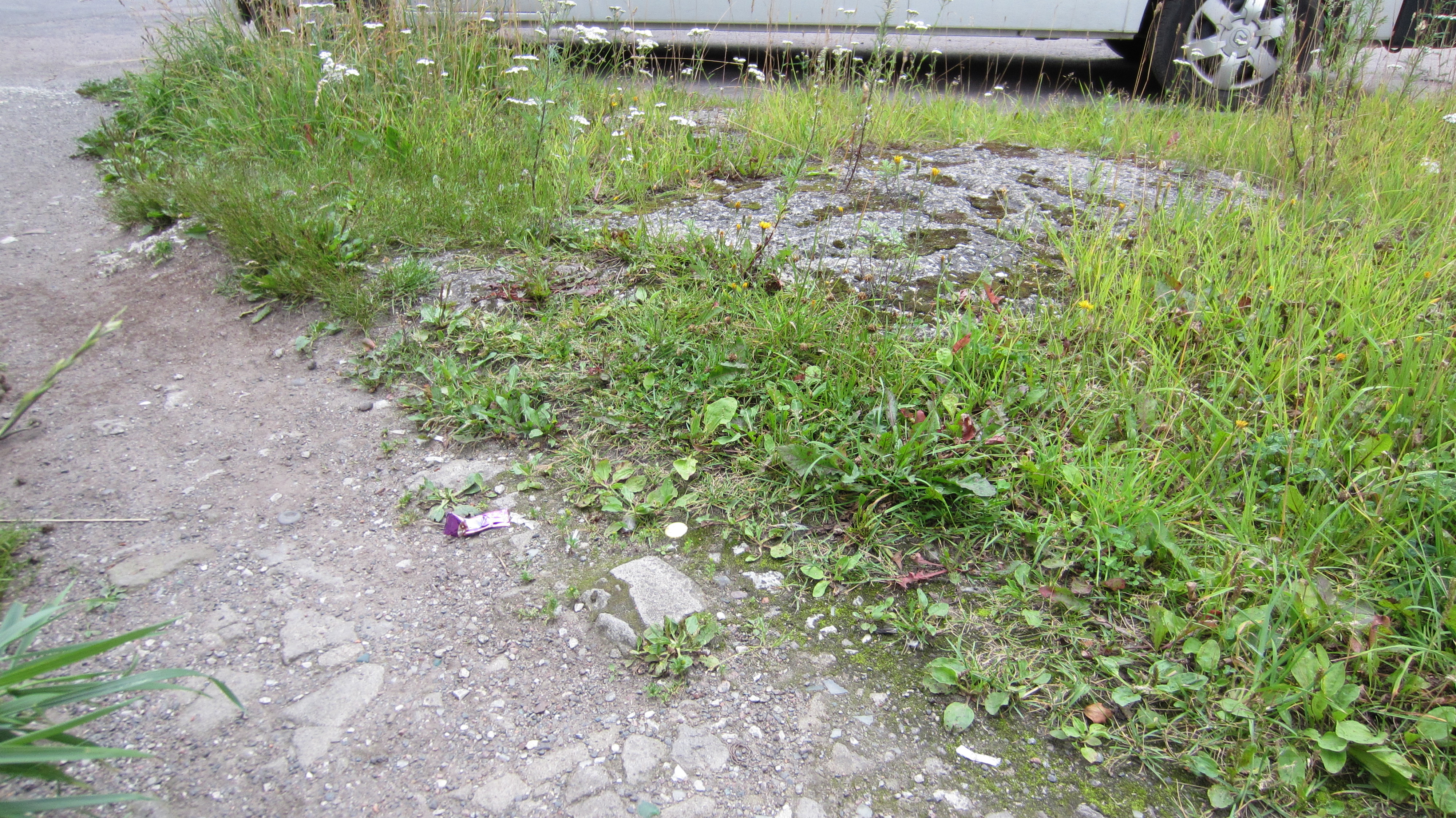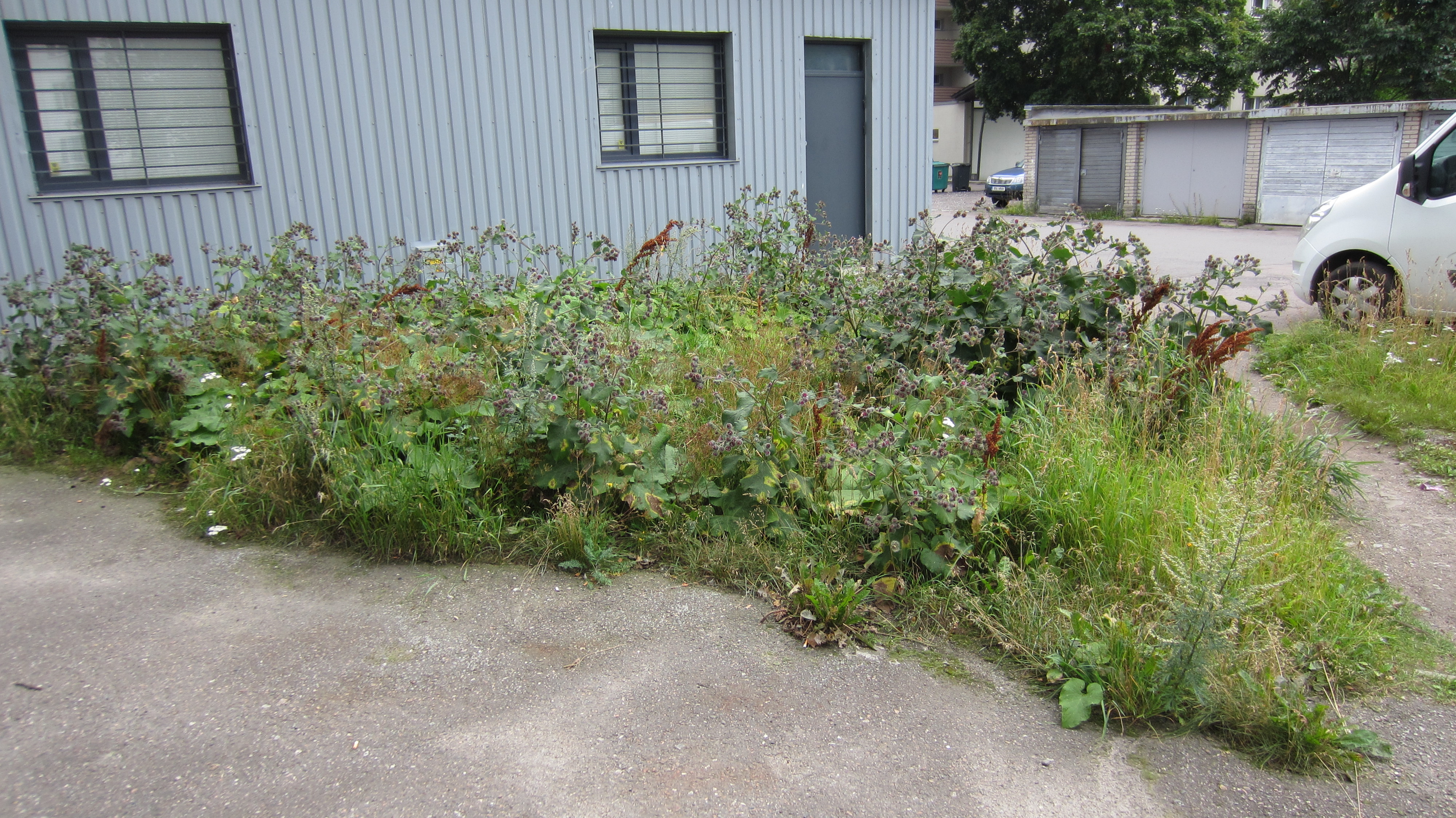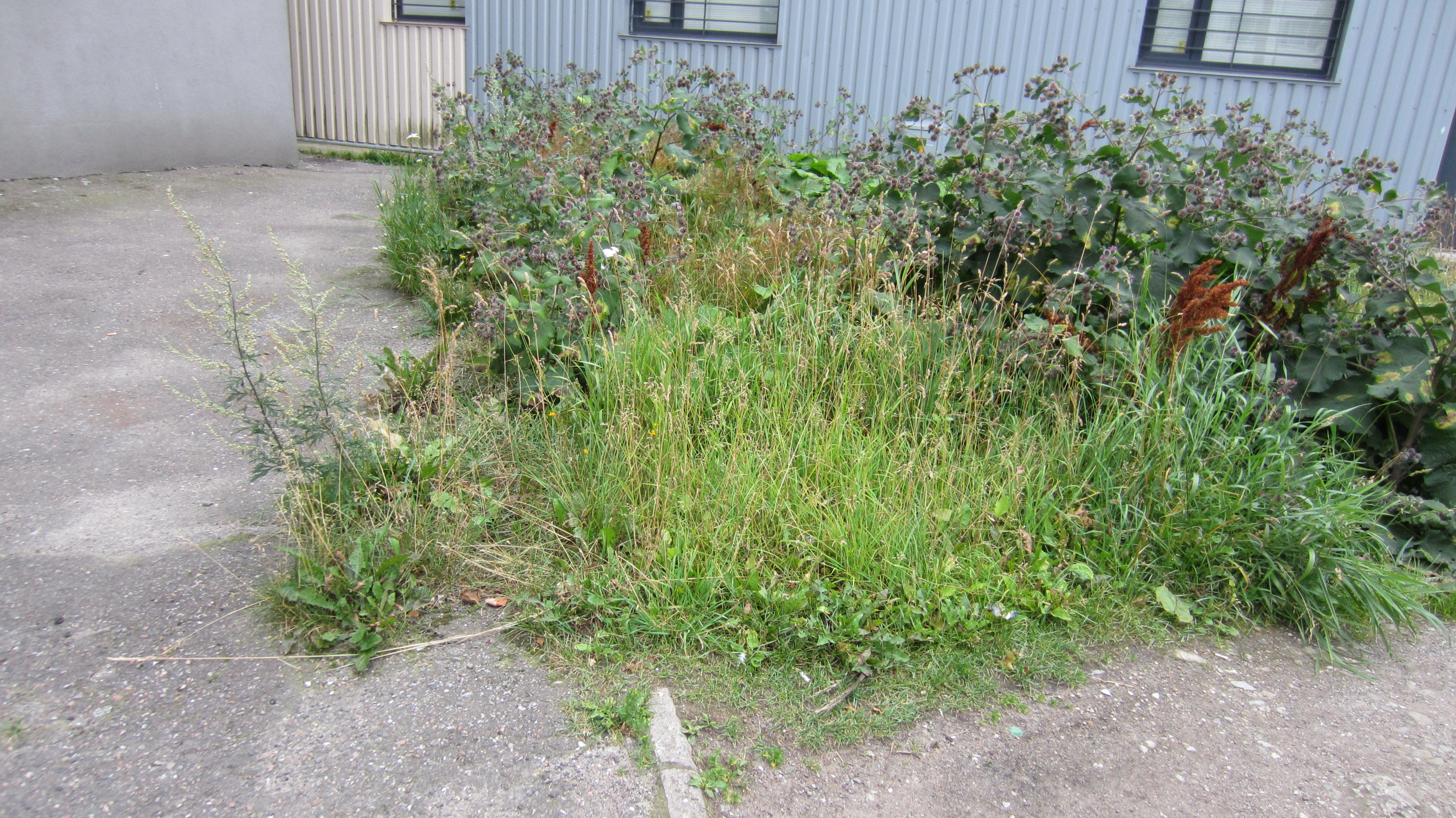 Kolmnurkne osa on ääristatud asfaltiga ning mingi osa on taimestikust üle piirde kasvamas. Üle piirde olev osa tuleb juurtega eemaldada ja kolmnurkse pinna seest samuti kogu olemasolev umbrohuväli koos juurtega puhastada. Kolmnurkne siseala tuleb pärast umbrohu eemaldamist katta korraliku mullaga ja pressida ühtlaselt sirgeks. Muruseemne külvab tellija ise.