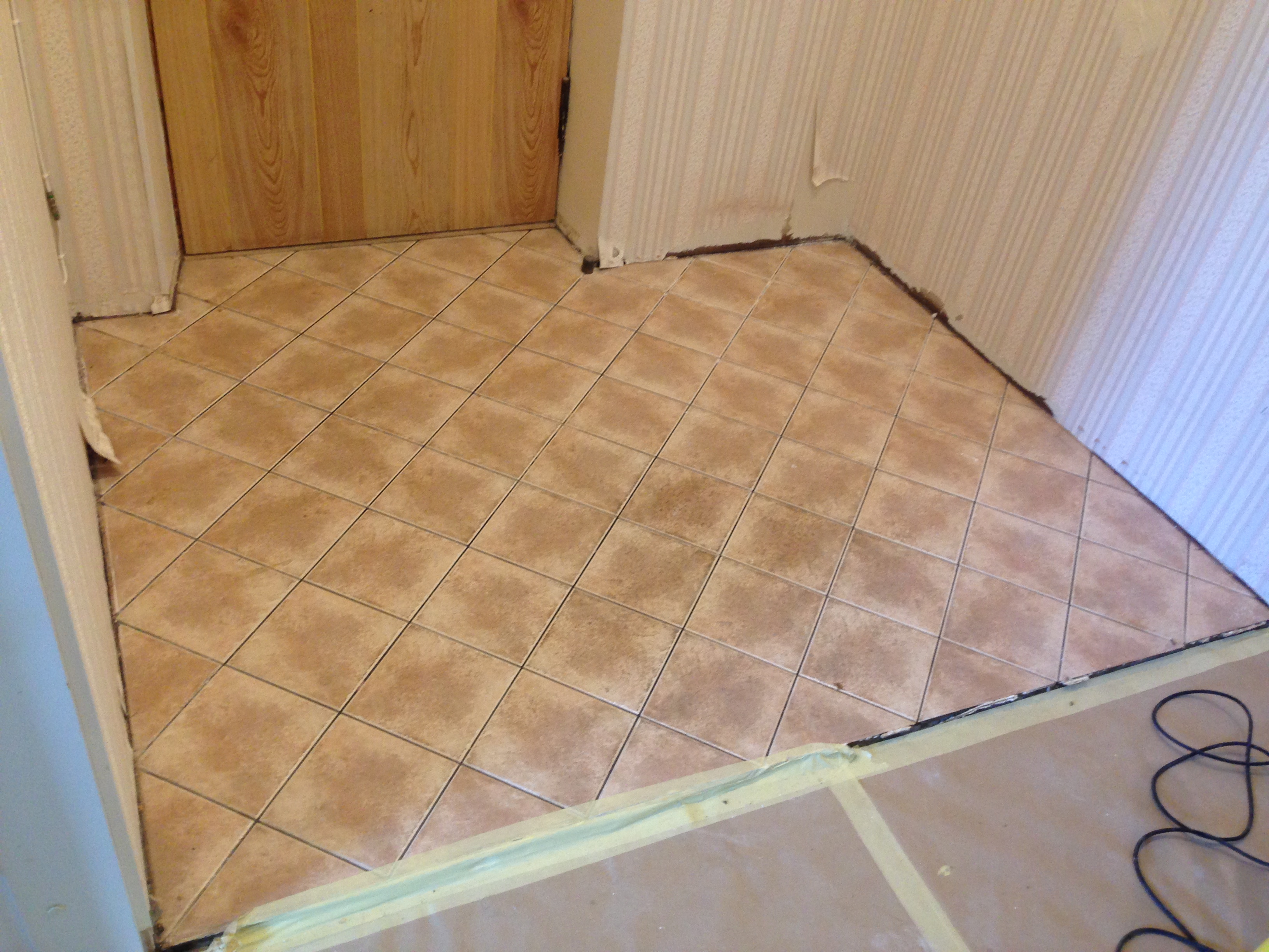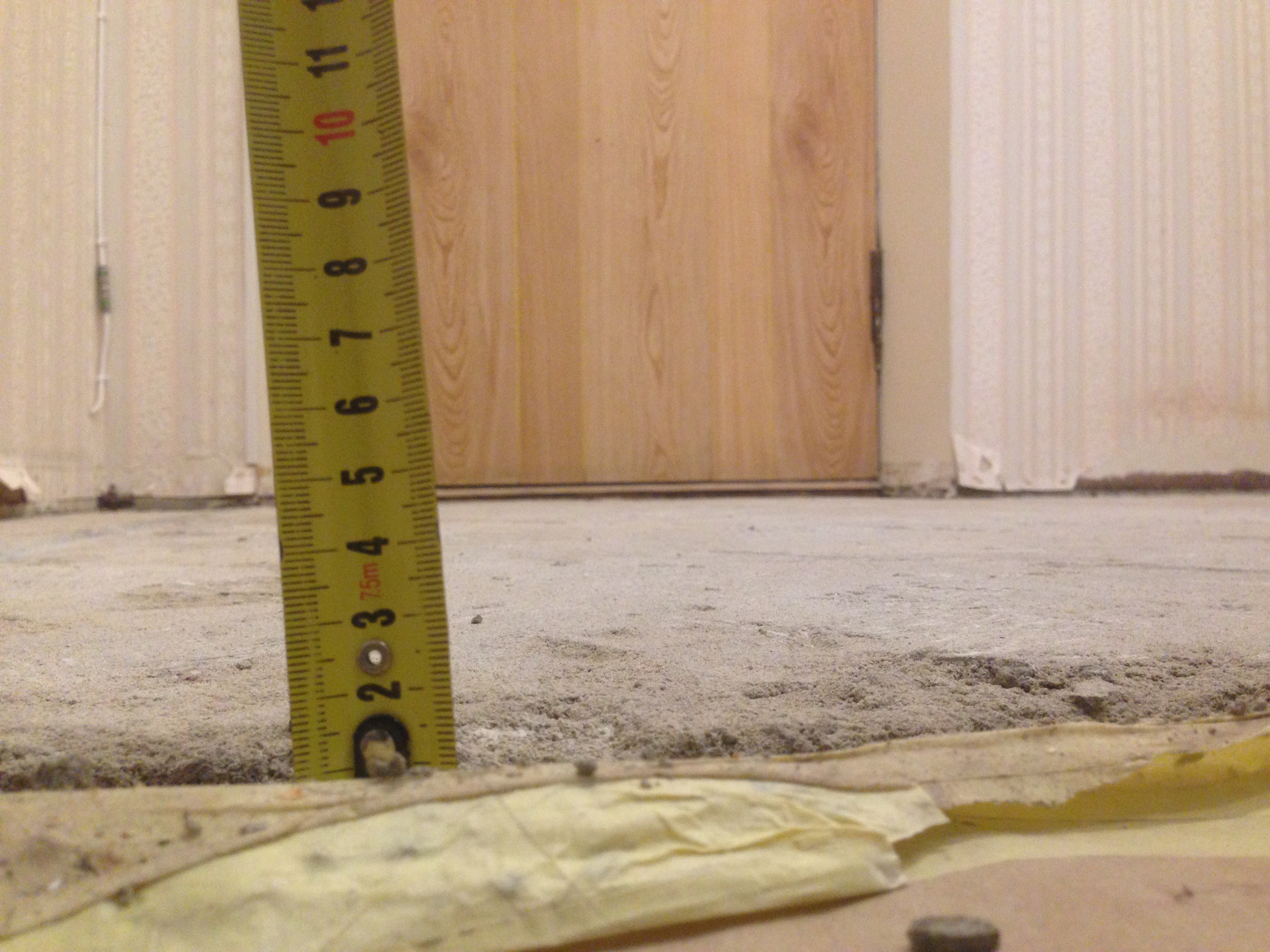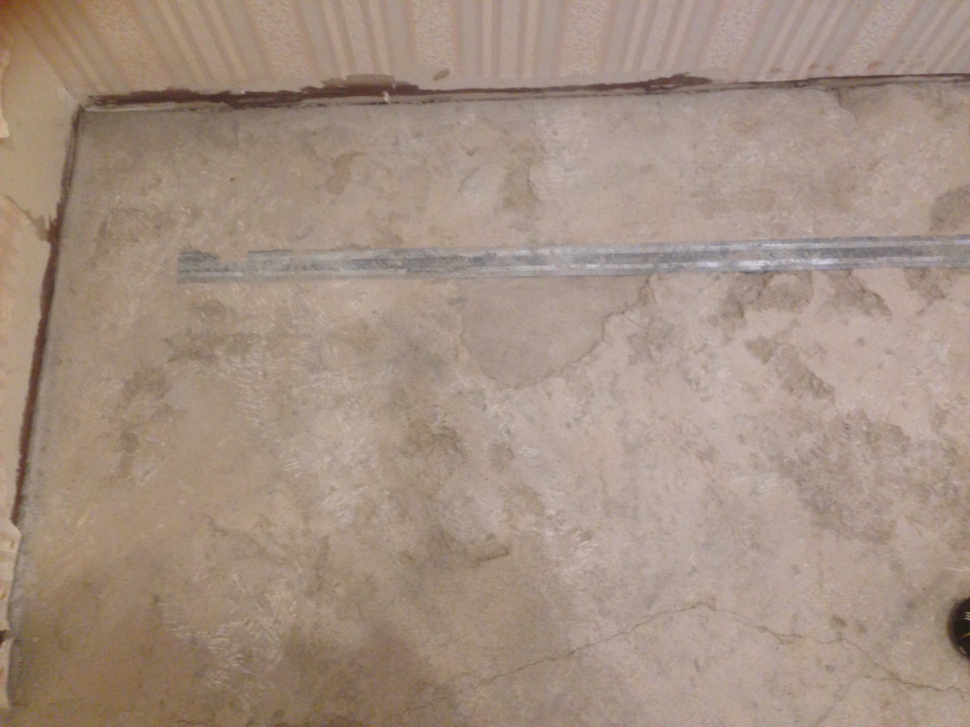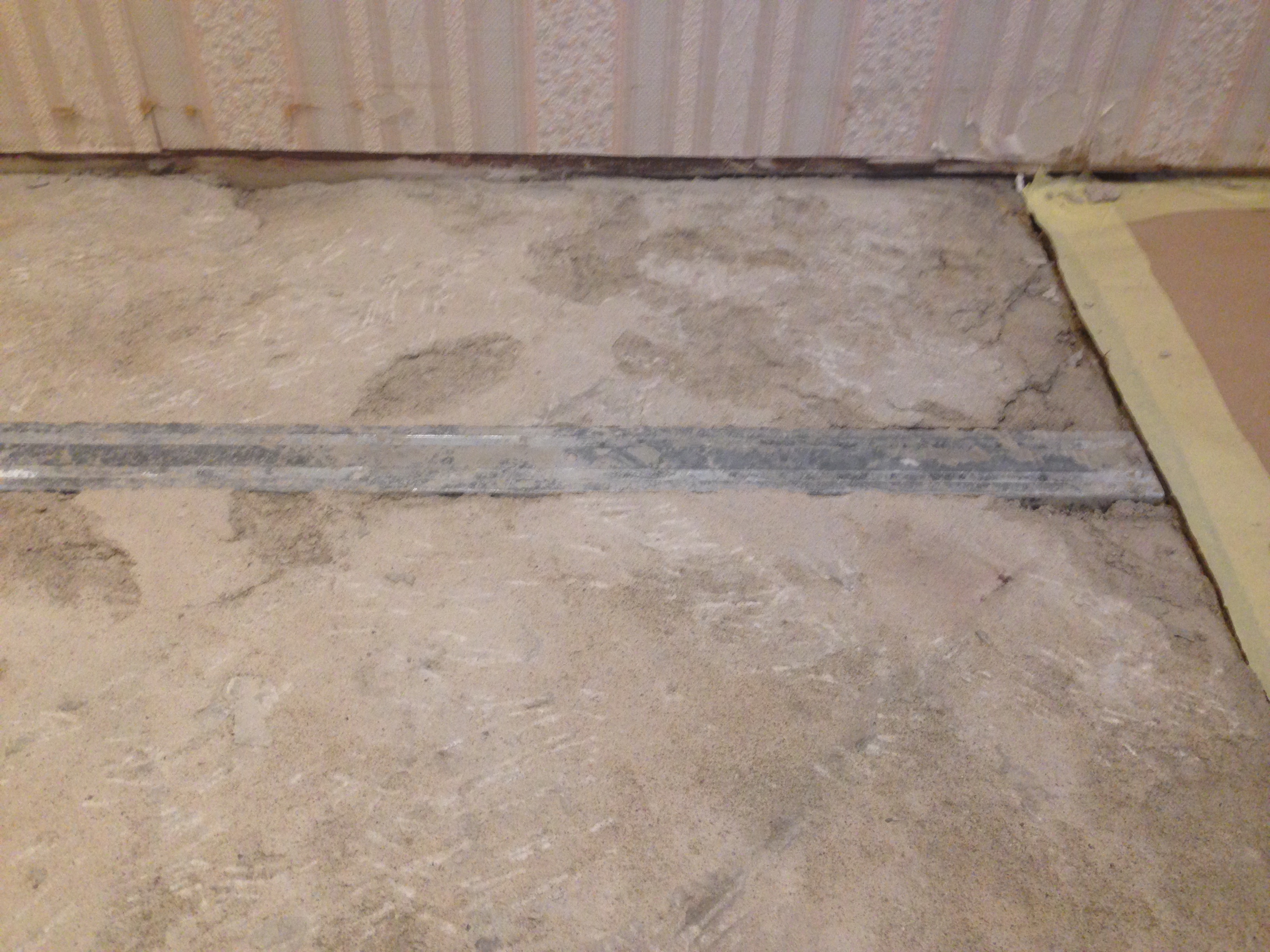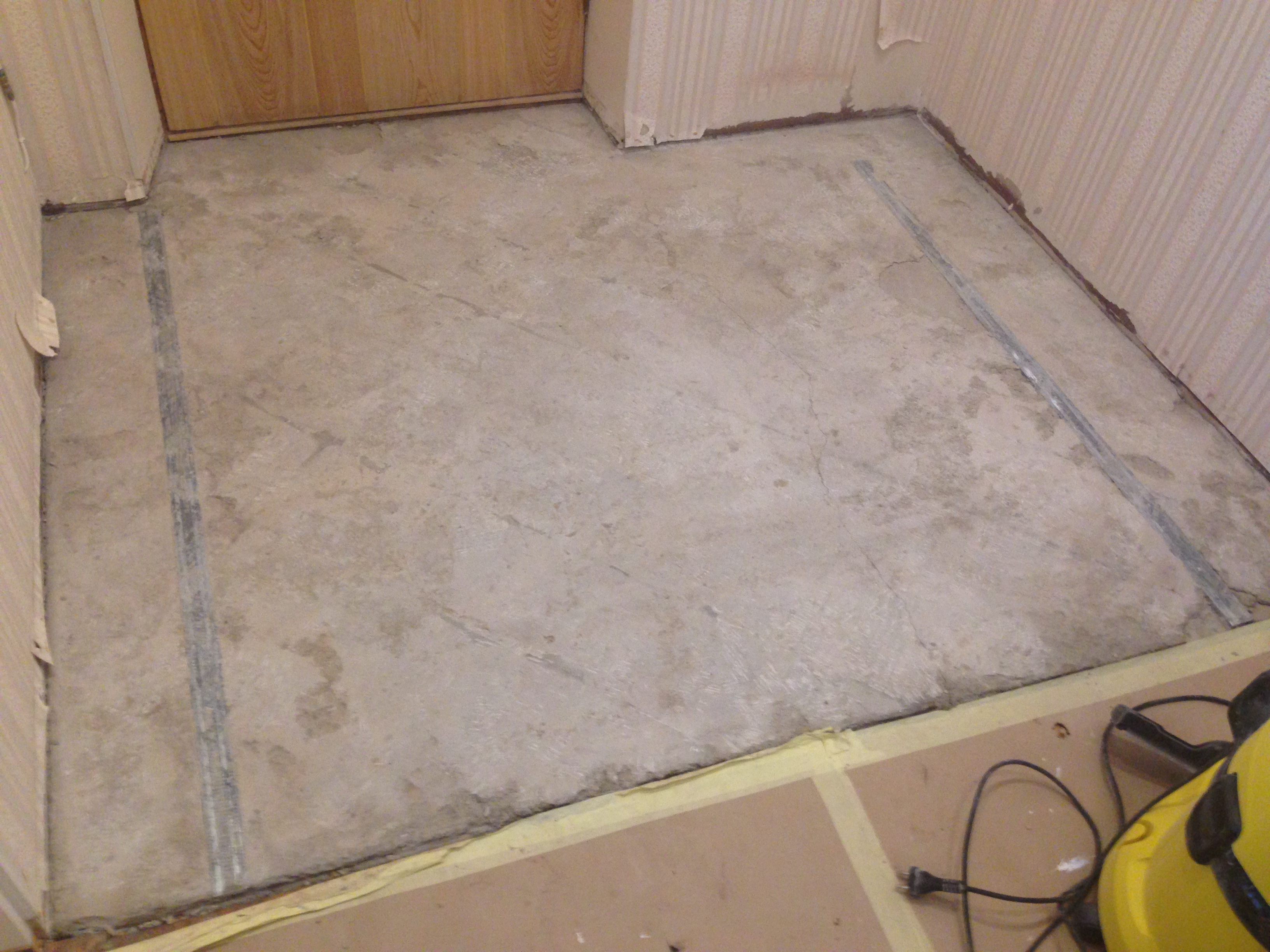 Vanad plaadid ja plaadisegu on meisliga eemaldatud, all olev pind on betoonist aga siiski esineb ebatasasusi (vanade plaatide eemaldamisel tuli tükke ära ka betoonpinnast). Betoonpinna sees on ka kaks metallist riba, mida ei saa hästi eemaldada.