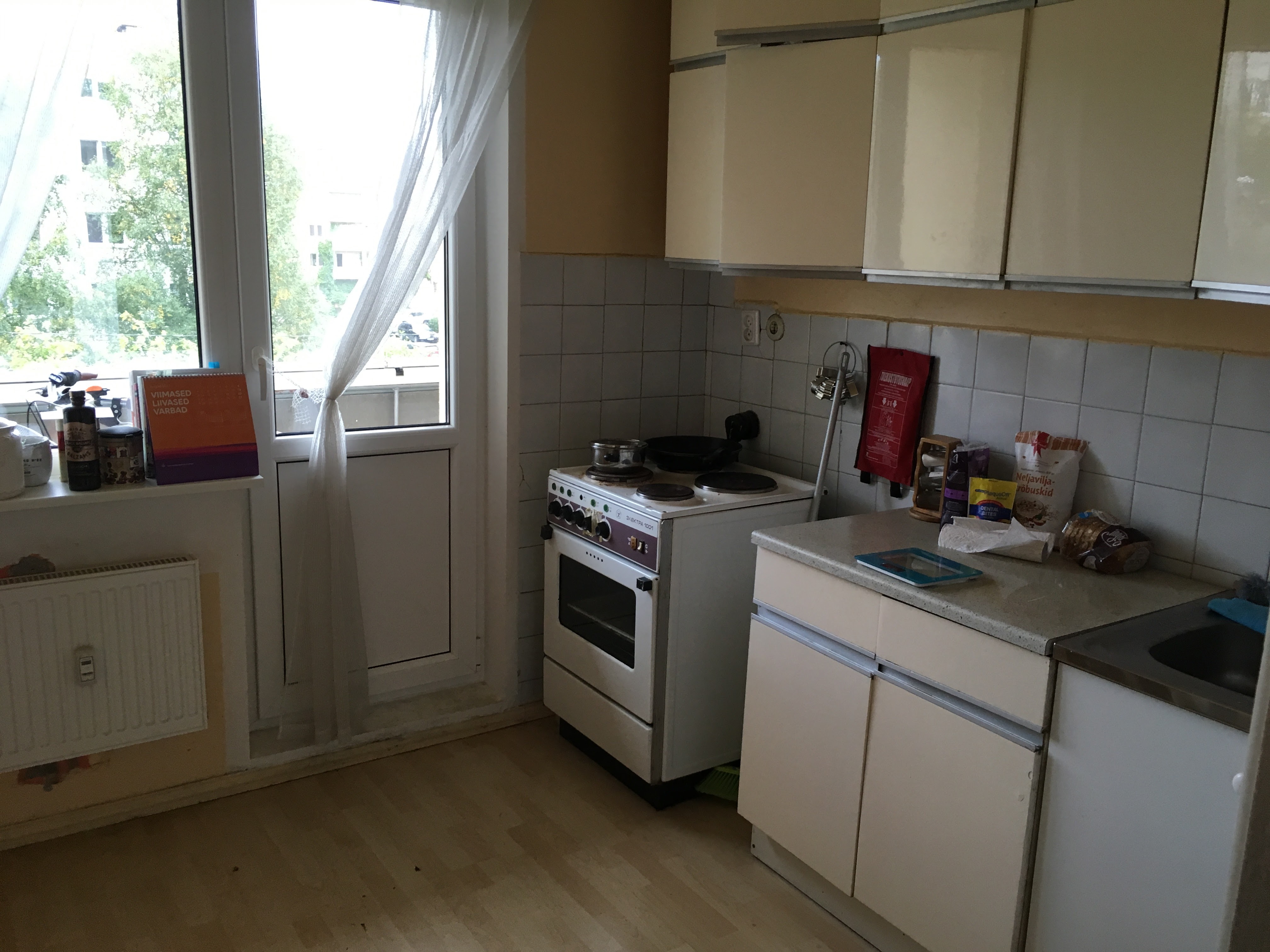 Köögis on parkett, seinad on värvitud ja osaliselt plaaditud. Vana nõukaaegne pliit ning mööbel.