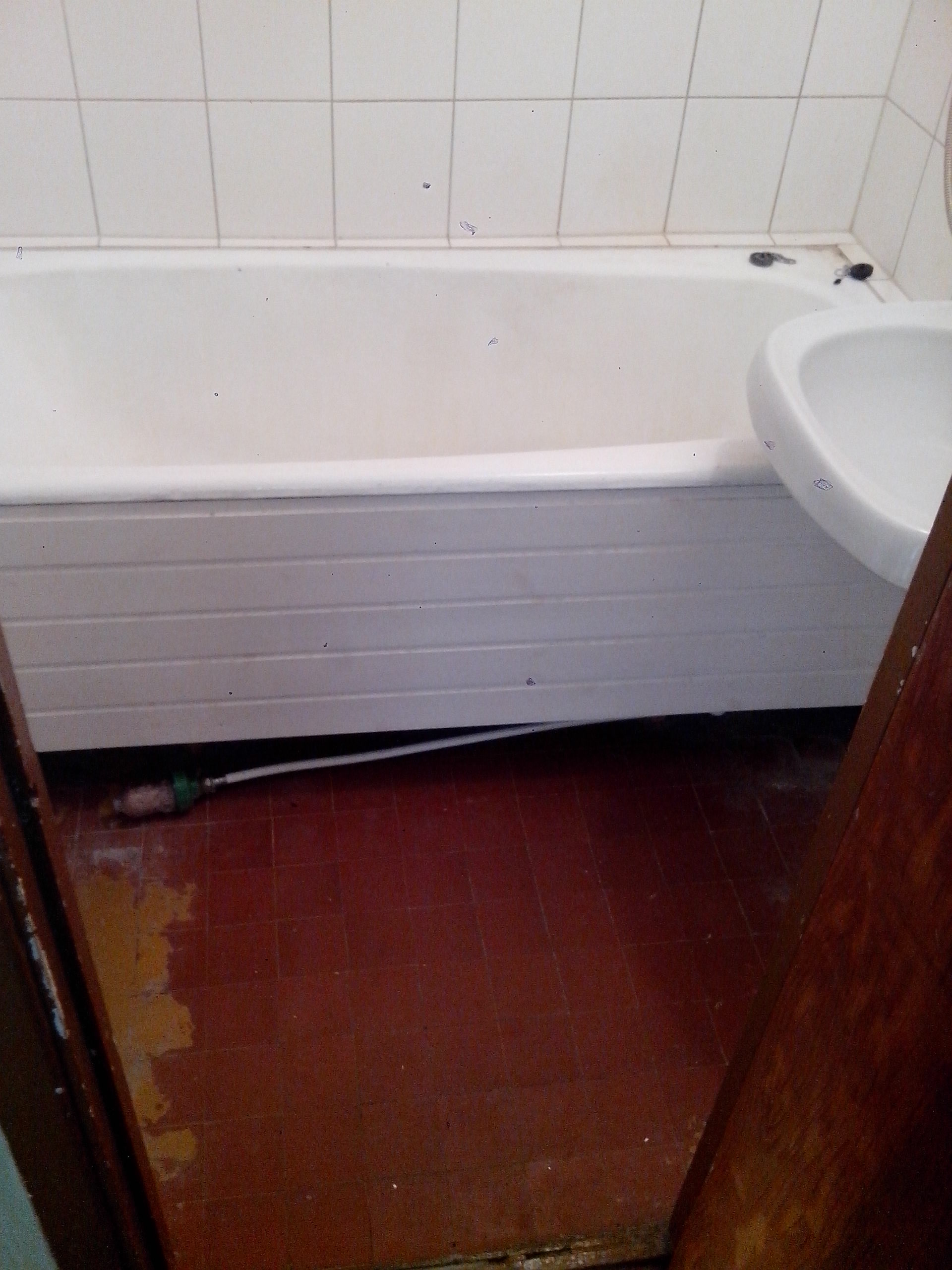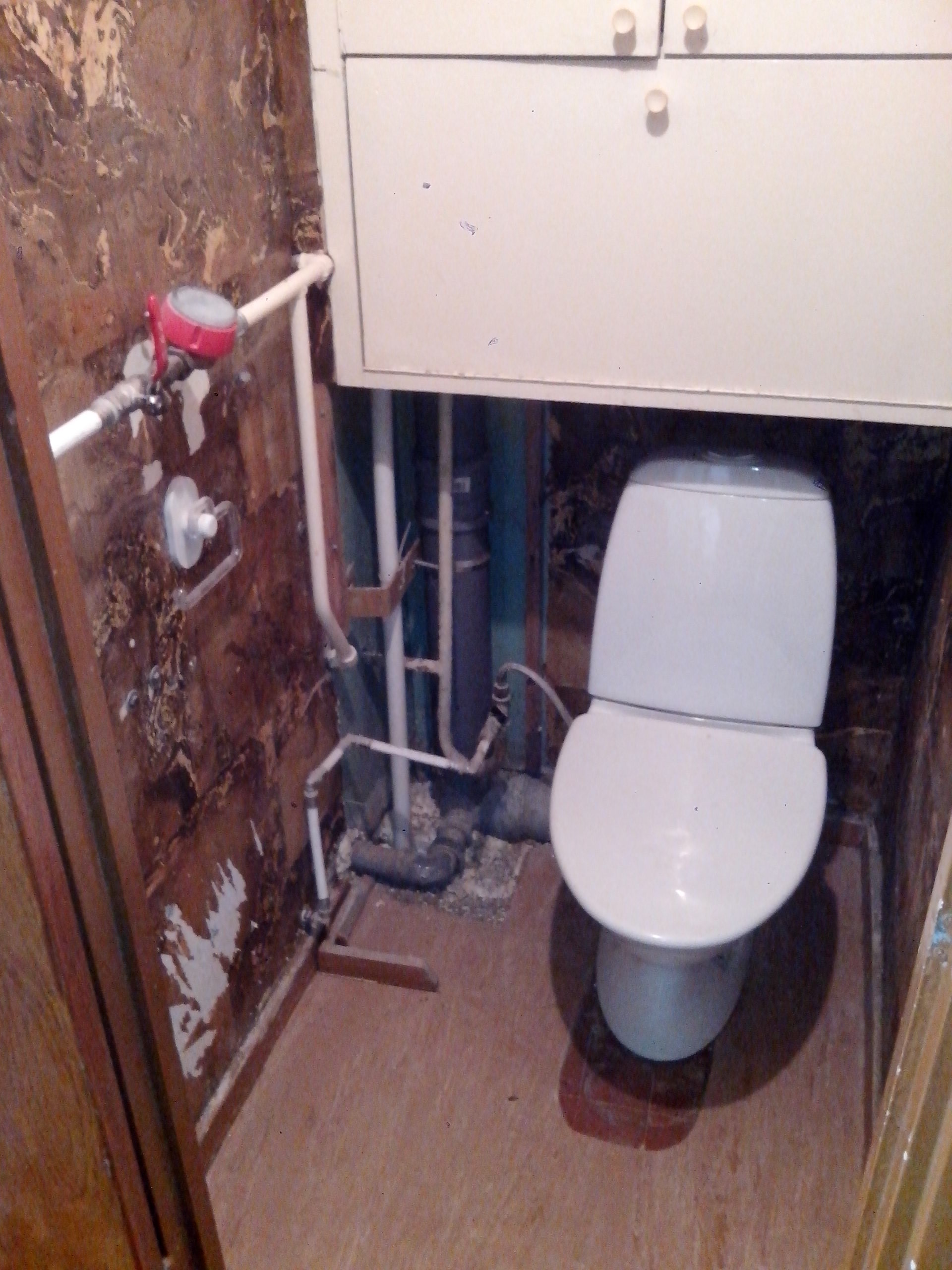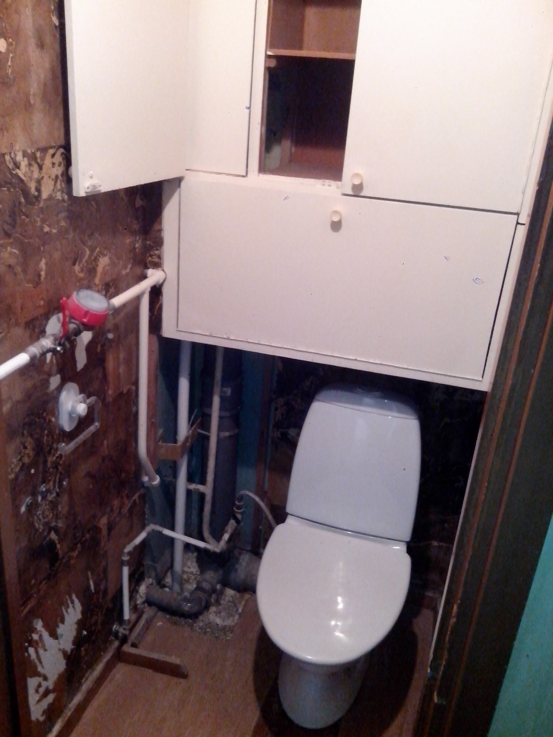 4. Lisatööd: Olemasoleva kapi (puitkarkassil) eemaldamine. Kipsist torude katmiseks nurga ehitus tagaseinas vasakul.WC poti paigaldus.