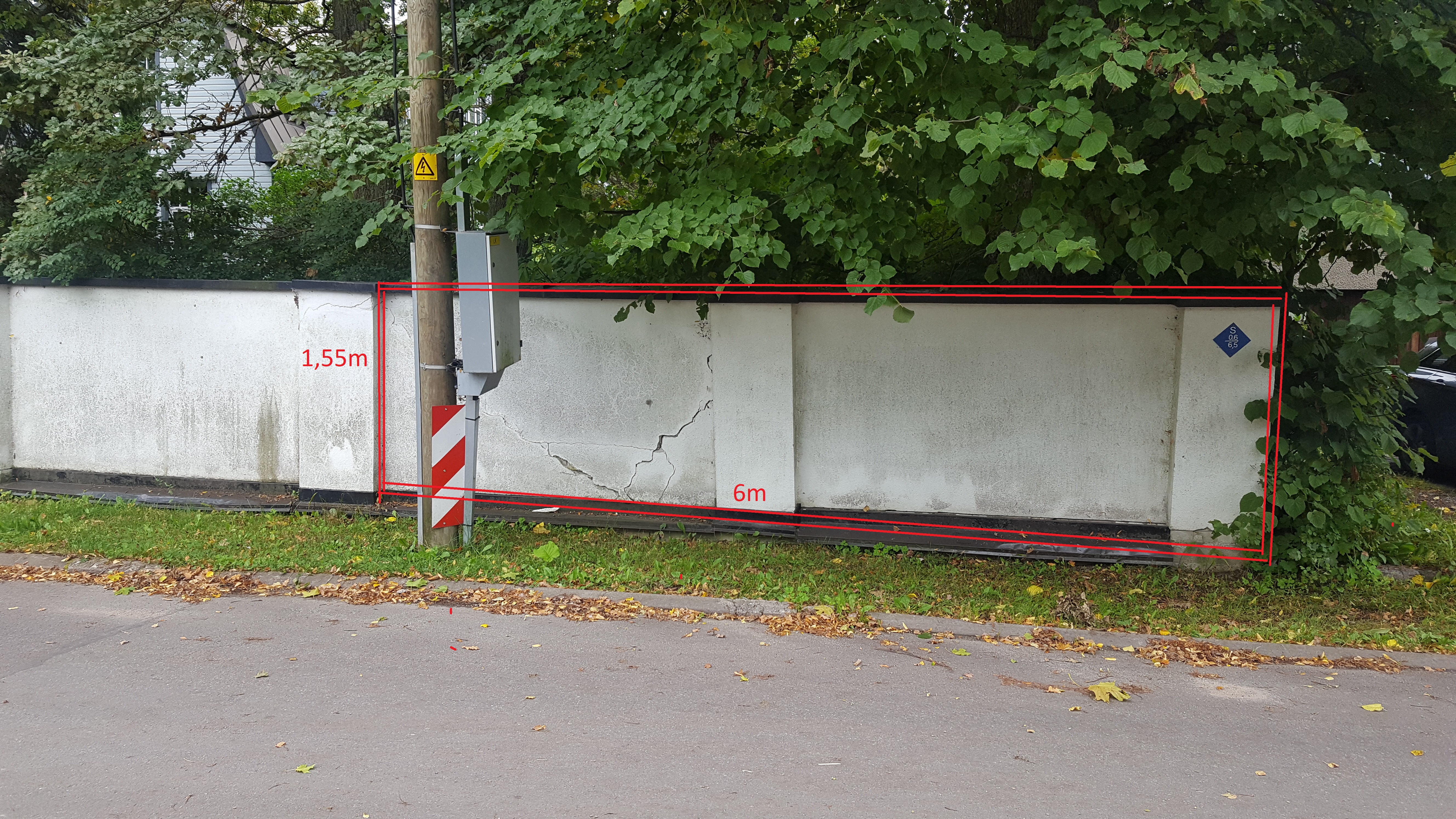 Parandatava, vahetava osa pikkus on 6 m. kõrgus 1,55m. Pildil olevad plekid tagasi panna. Värvida valgeks. Tellise peal on krobeline krohv.