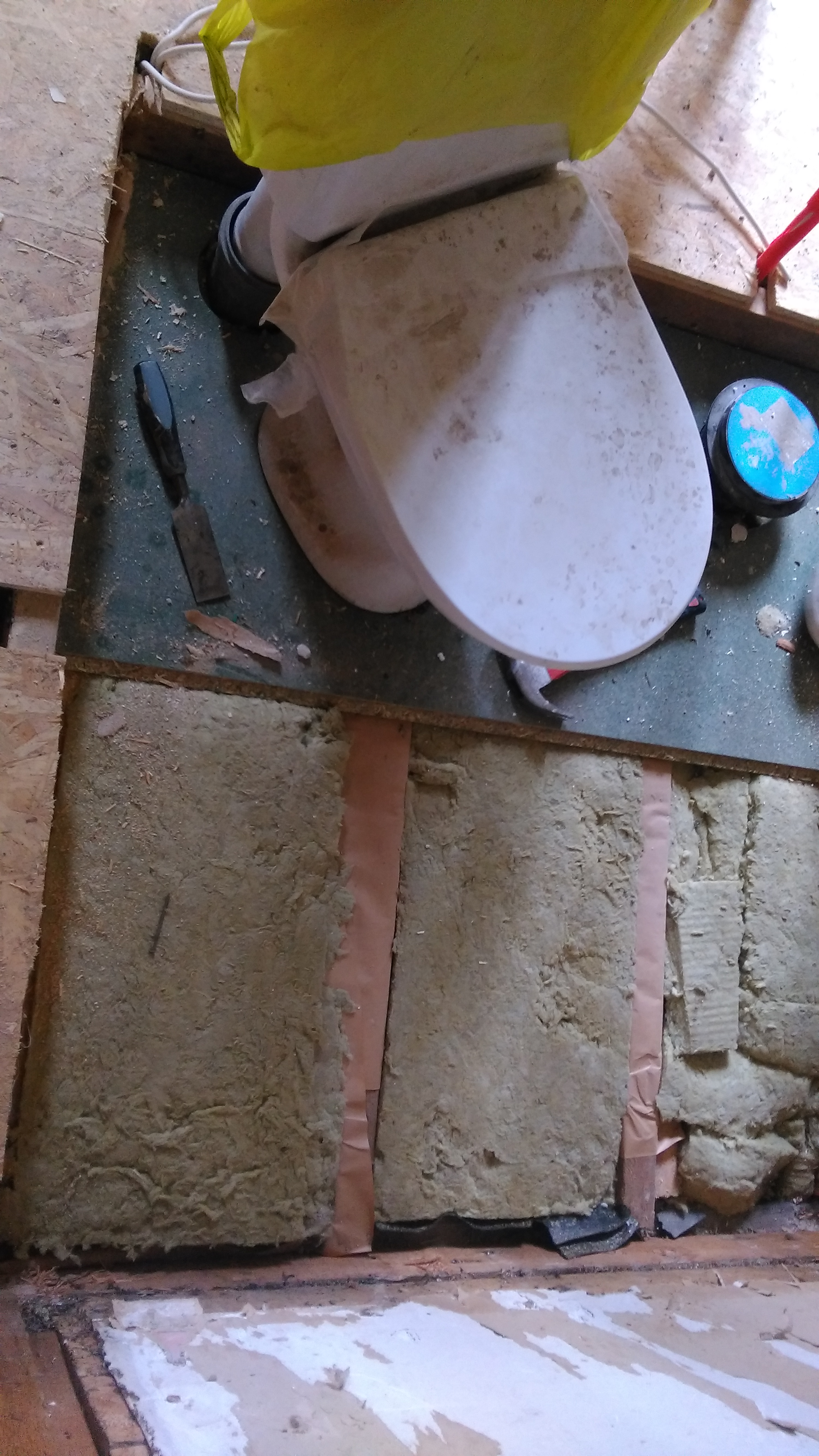 Olemasolev lagi: 2,5cm peno+laagid, sinna peale tuleb kipsplaat (paigaldus minu poolt) enne vannitoa ehituse alustamist.