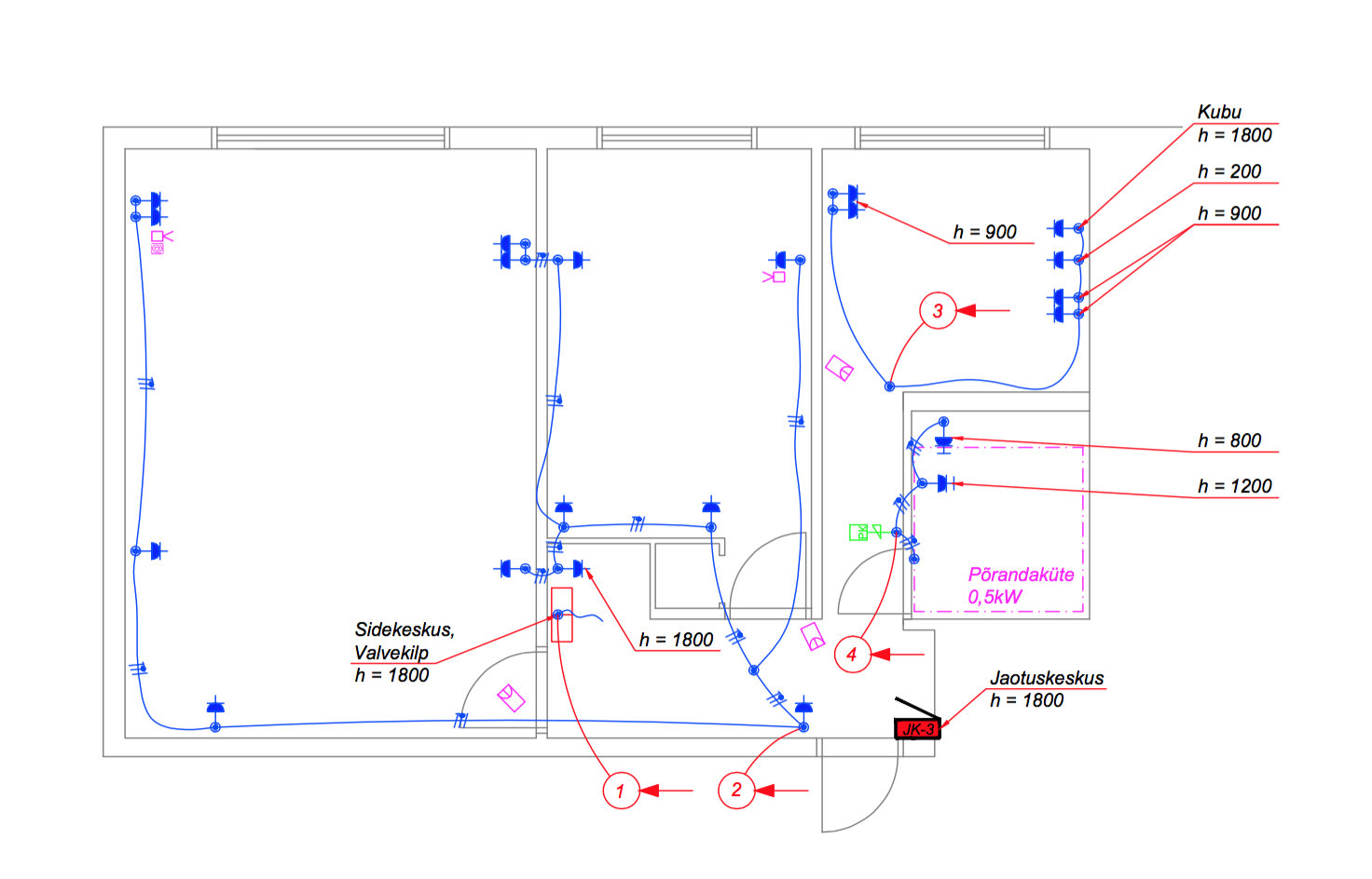 Kaablid on veetud. Vannitoas on elektritööd juba teostatud (pakkumine joonistelt seda osa ei hõlma).