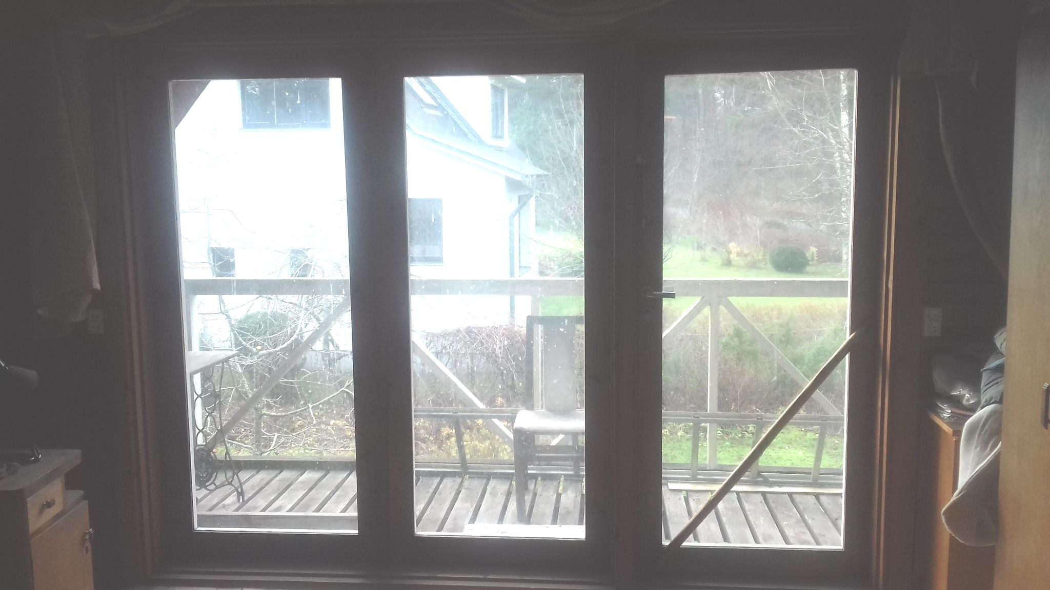 Praegu on ees ainult 80ndate lõpul valmistatud puitraamis tavaline klaas välimises osas. Sissepoole peaks ka mingid aknad panema (plast klaaspaketiga?), et oleks soojem. 2/3 osa ei pea lahti käima, kuid võib. Võib koosneda kahest plokist ja keskele post eraldajaks või üks suur aken, kuidas odavam on. 1/3 osa peab lahti käima. Mingeid erilisi avamis-sulgemissüsteeme vaja ei ole. Piisab kui käib lahti tavalise hingega ja riivis-haagis.