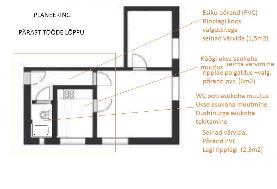 WC: Põrand katta pvc kattega, seinad värvida, ripplagi, wc pott seinale paigaldus, Boileri paigaldus, dushinurga paigaldus (kabiin tellijalt) võimalik et tualeti tuleb laiendada -/+ 15 cm (köögi arvelt) et dushinurk mahuks. Praegune laius 85 cm