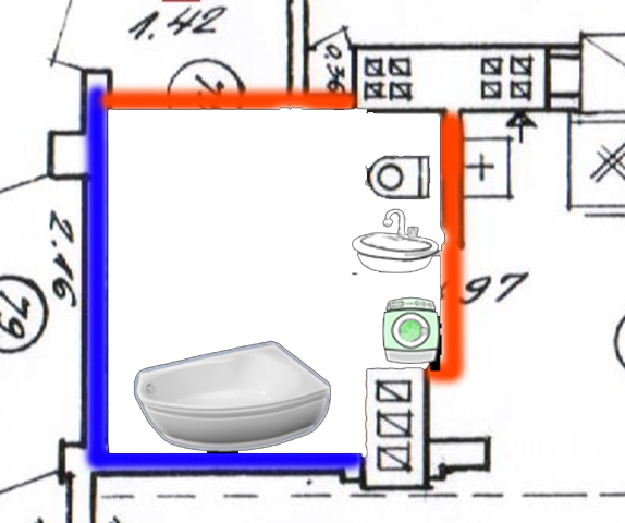 1. Seinad – Üles ehitada, soojustada, elekter ja vesi seina sisse (luugiga peamise liitekoha juures). Pistik pesumasinale ning vool ka valamu peegli valgustile (valgusti pistikuga). Plaatimine ainult vanni küljed, ülejäänud värvitavad. Vanni kohale tuleb ka dušš. Ukse paigaldus (uks tuleb pildilt vaadates üles vasakusse nurka, sisse avanev.