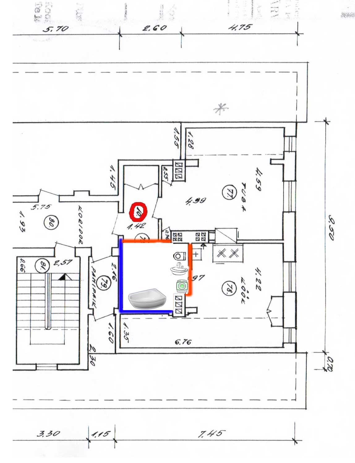 5. Vesi – Torustiku vahetus alates alumise naabri juurest kuni vannituppa. Lisaks boiler (100L, vertikaalne, vannituppa WC poti kohale) korteri süsteemi ning väljavõte kööki. Osa torustikust tuleb seina pealt (korstnajala kõrvalt) ja läheb vanni alt tagasi seina sisse.