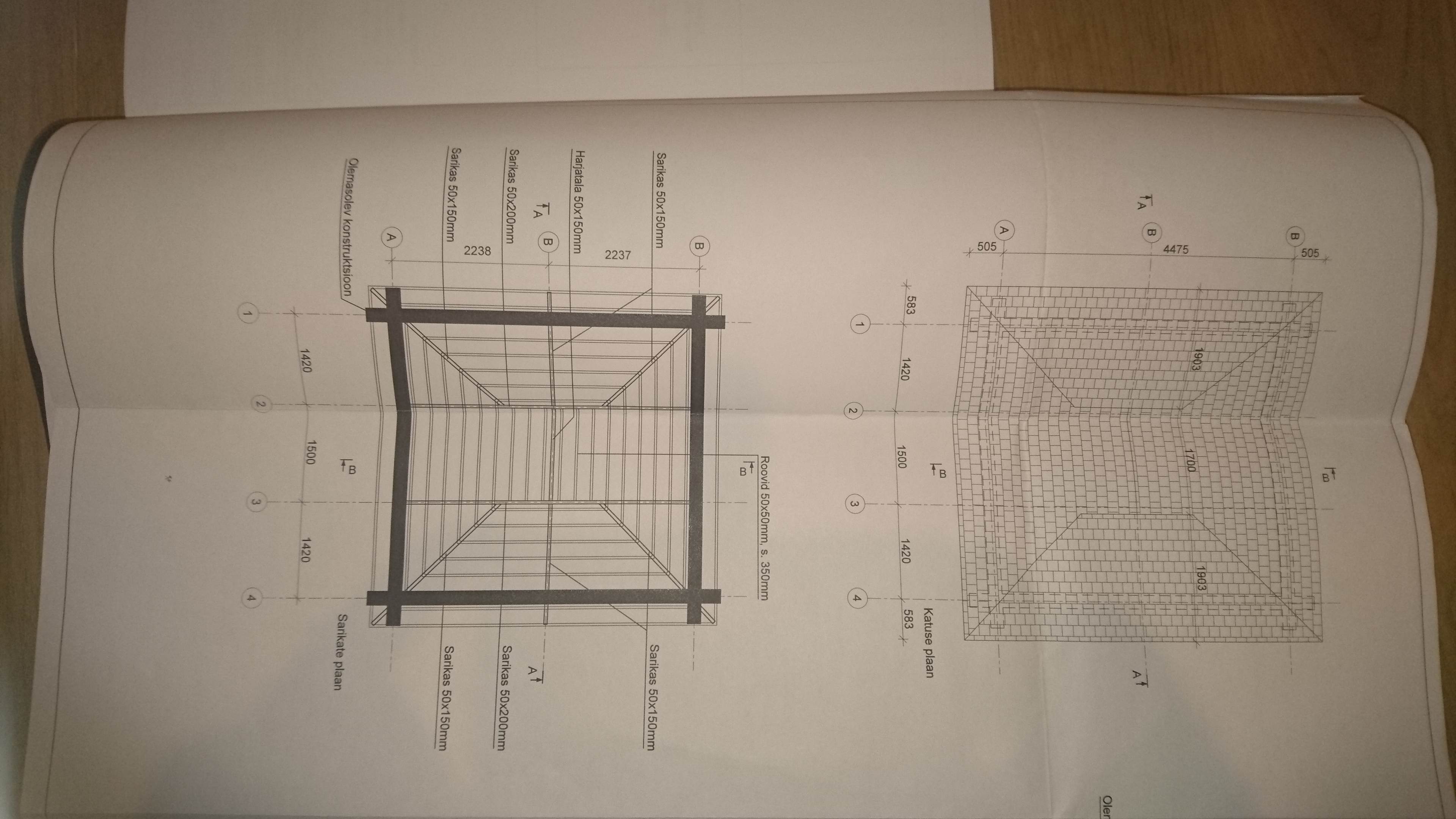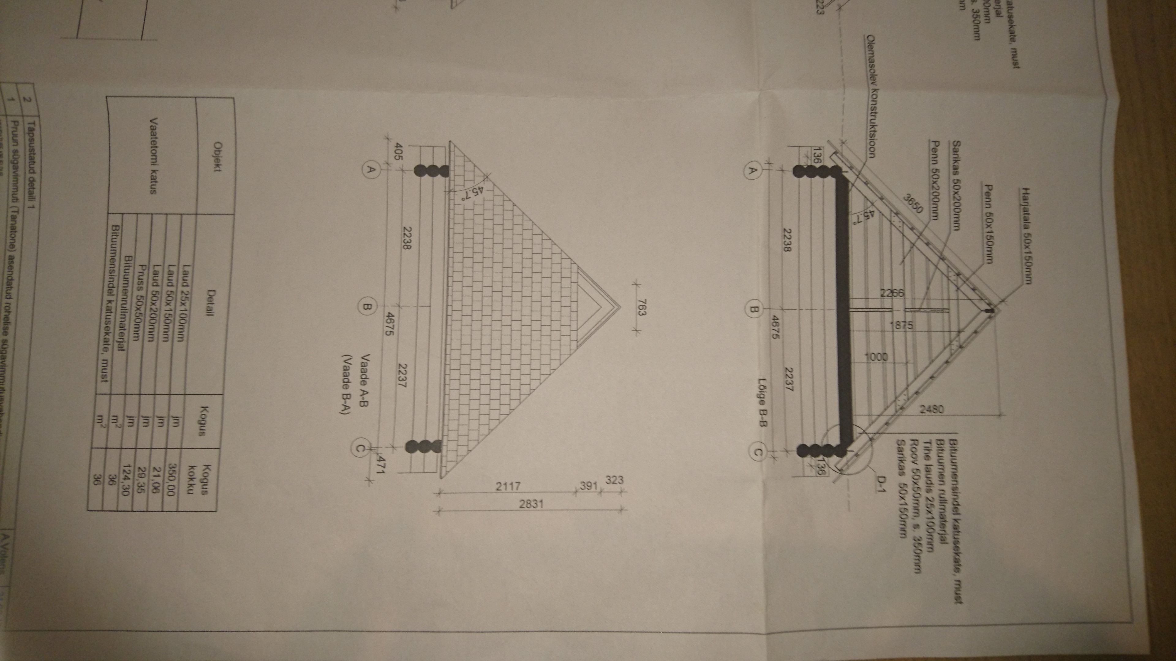 Uue katuse ehitus. Uue katuse sarikad tulevad samamoodi nagu vanal. Ainult, et immutatud nelikant materjalist. Nende peale tuleb roovitus 50x50 prussit. Järgmiselt tihe laudis 25x100. Selle peale bituumenist aluskate ja selle peale bituumensindel kärg kate. Lisan ka joonised juurde.