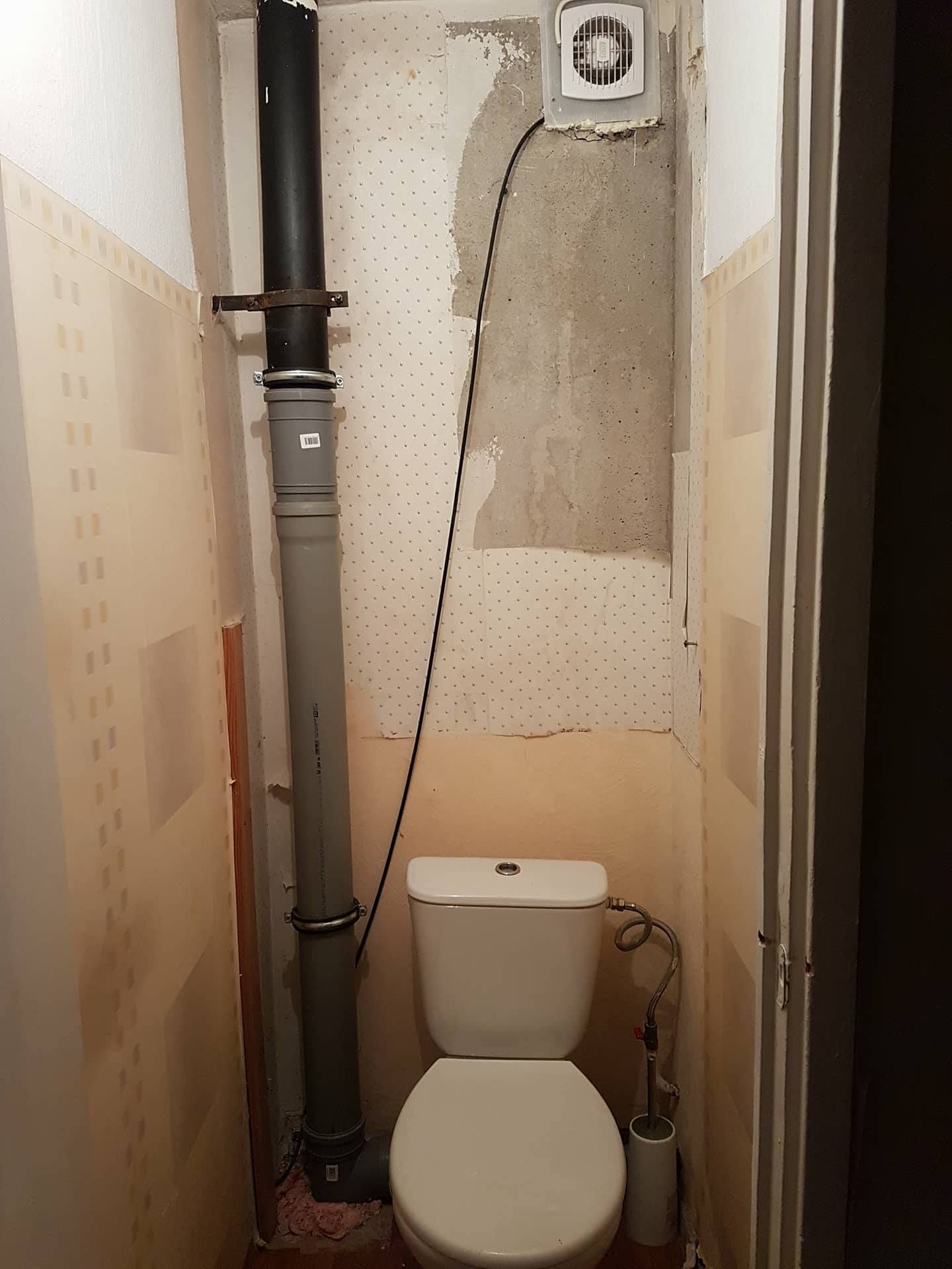 WC-s on hetkel põrandal linoleum ja tapeeditud seinad. WC-poti taga on lahtiselt toru, mida sooviks peita. Lahendused seinasisese WC-potiga on eelistatud. Seinad soovime värvida ja põranda plaatida.