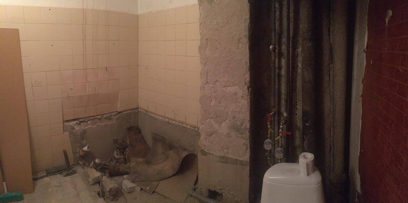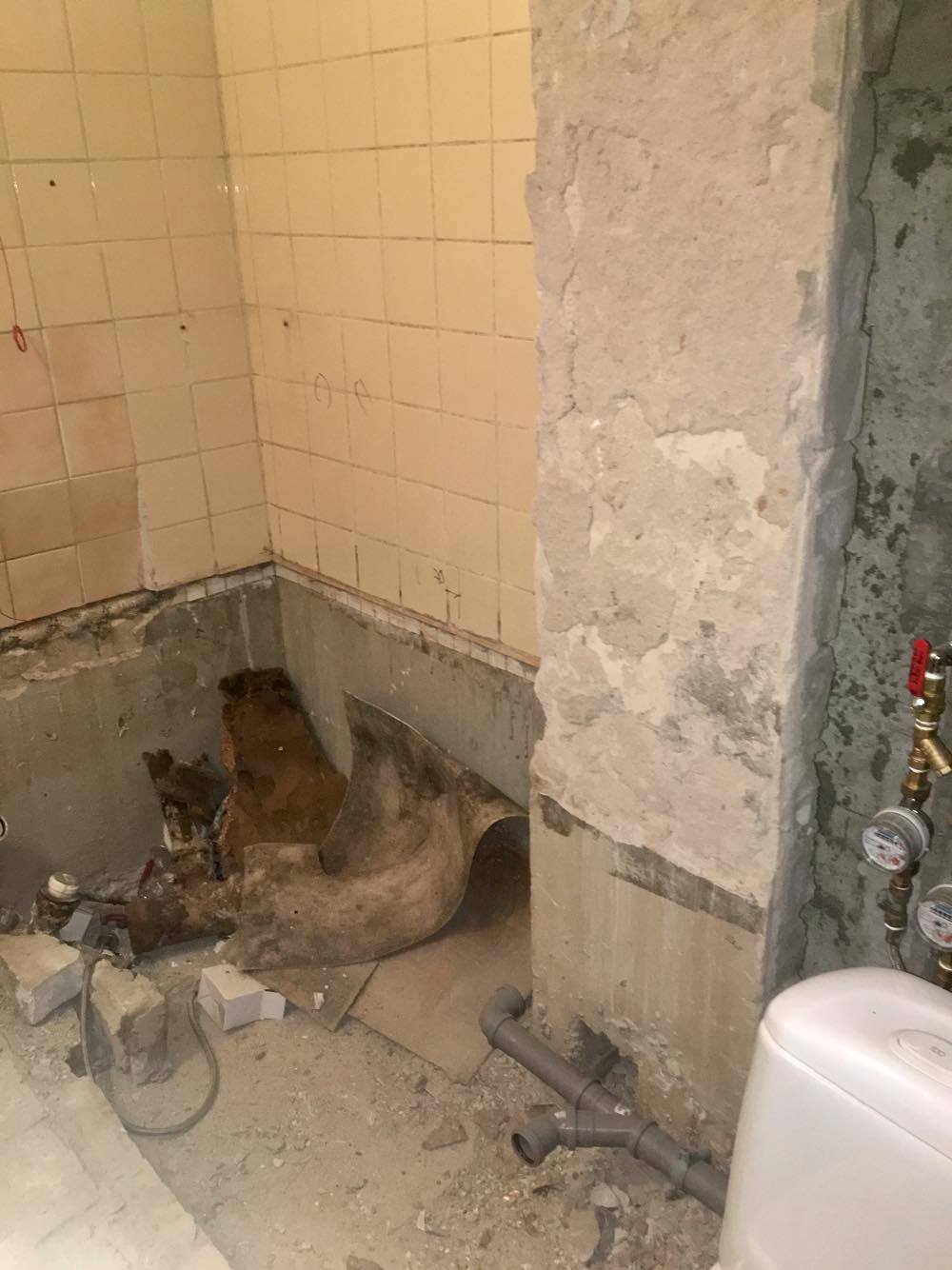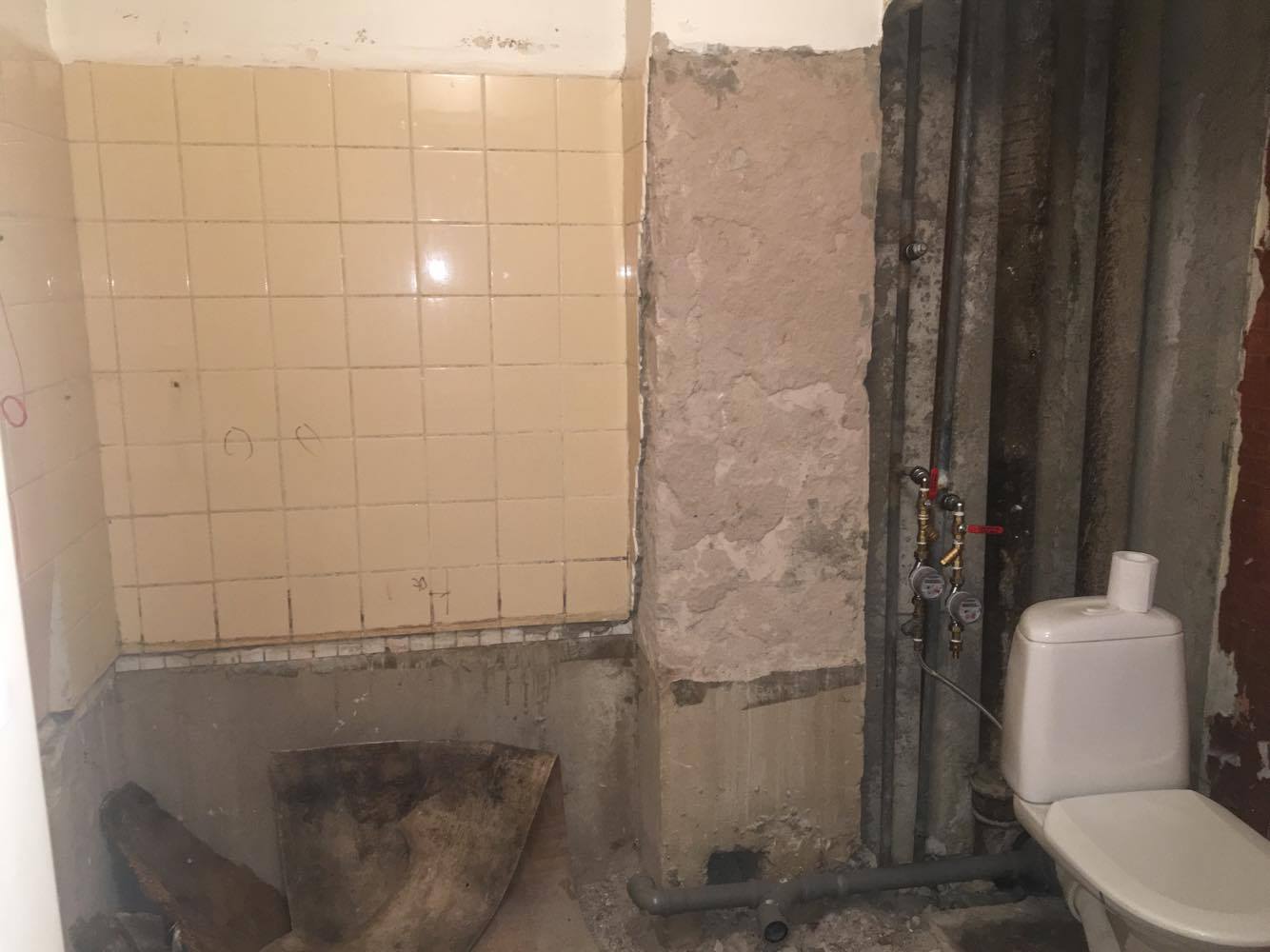 Tegu on vana paneelmaja vannitoaga. Wc uks on juba kinni pandud ning sein wc ja vannitoa vahel 80% maha lõhutud. Vana vann on välja visatud ja põrandalt vana plaat maha võetud.Vee äravool on uksest sisse minne paremal.