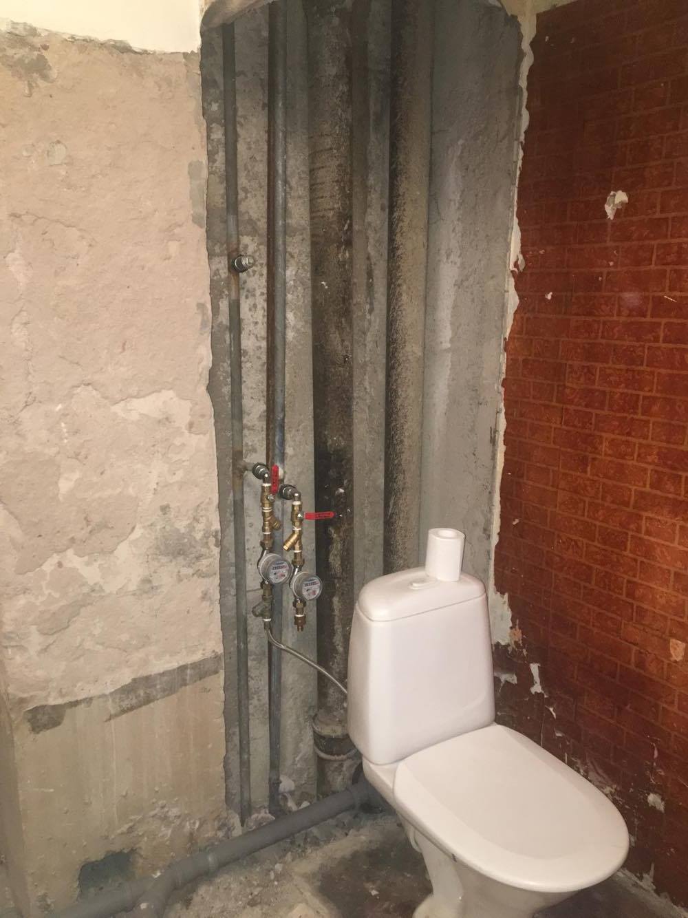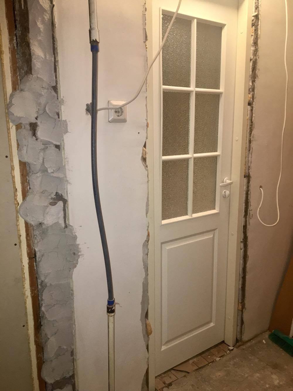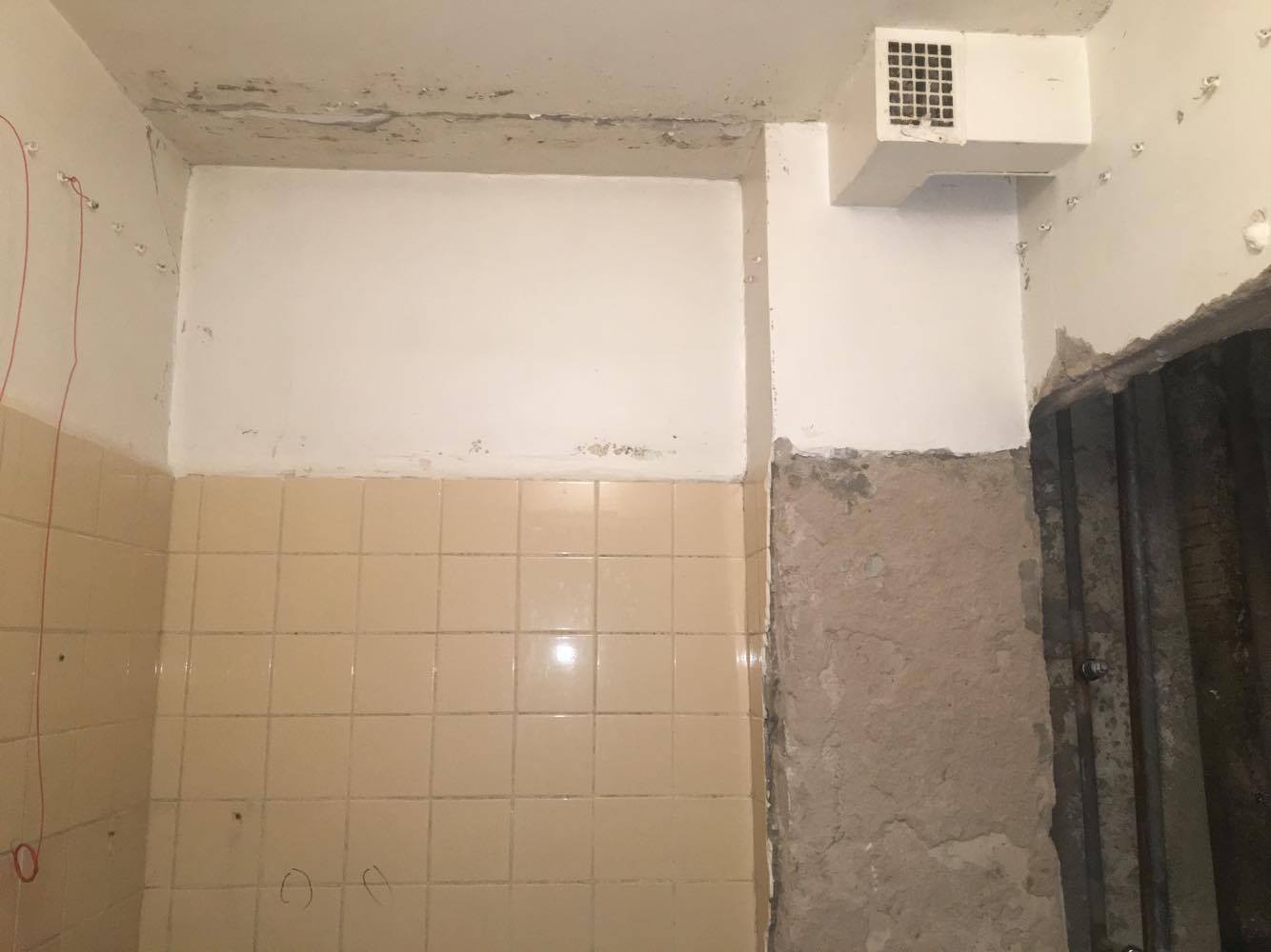 Tegu on vana paneelmaja vannitoaga. Wc uks on juba kinni pandud ning sein wc ja vannitoa vahel 80% maha lõhutud. Vana vann on välja visatud ja põrandalt vana plaat maha võetud.Vee äravool on uksest sisse minne paremal.