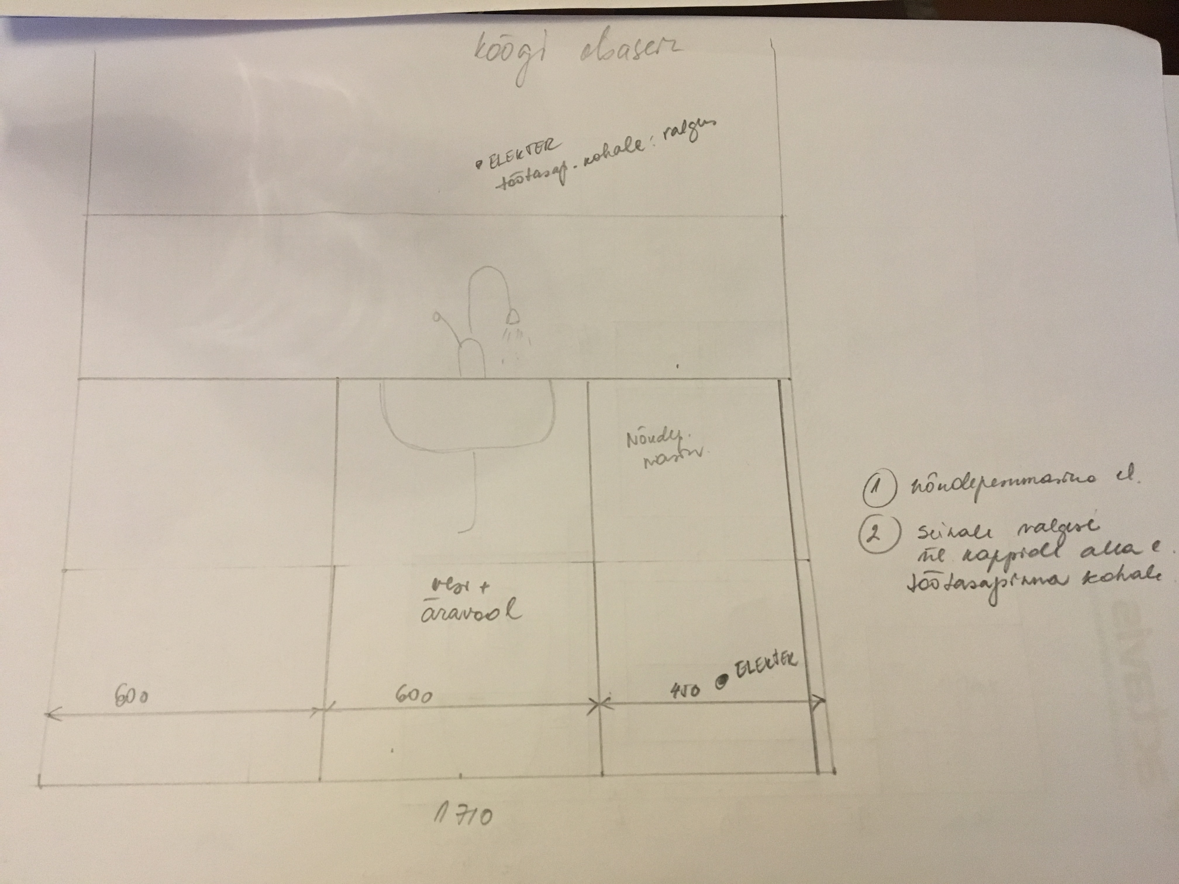 6. El.tööd: laevalgus 1punkt ja lüliti, pistikupesad - 9 tk (3 erin.lok.), el.varustus nõudepesumasinale, el.pliidile ja ahjule, tõmbekapile, töötasapinna valgustuse elektrivarustus 2 kohas.
