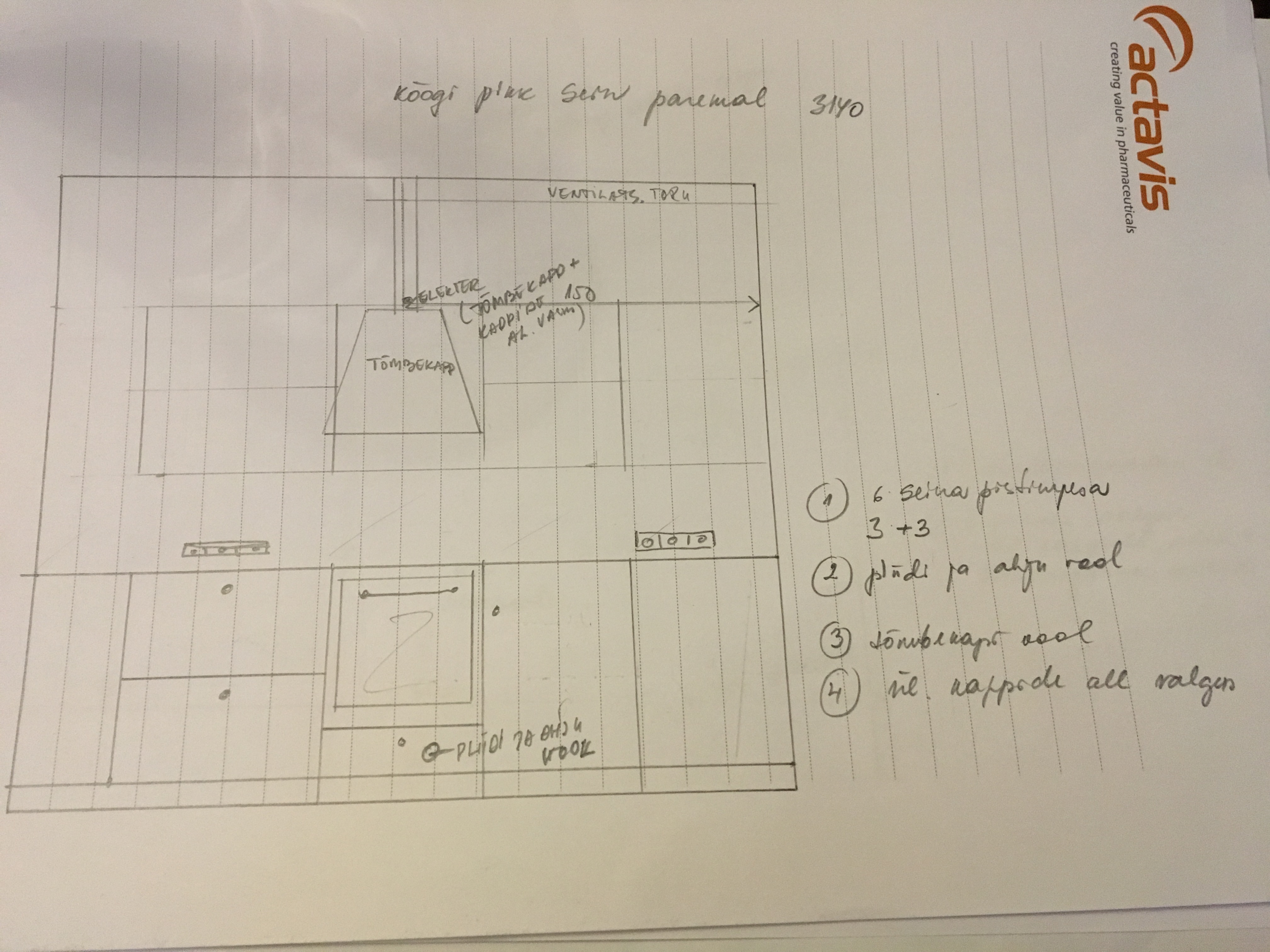 4. Muud: paigaldada valamu ja nõudepesumasina vee ja kanalisatsiooni ühendused ning ventilatsioonilahendus - ruumi rest + el.pliidi kubu ühendus vent.kanaliga vannitoas.