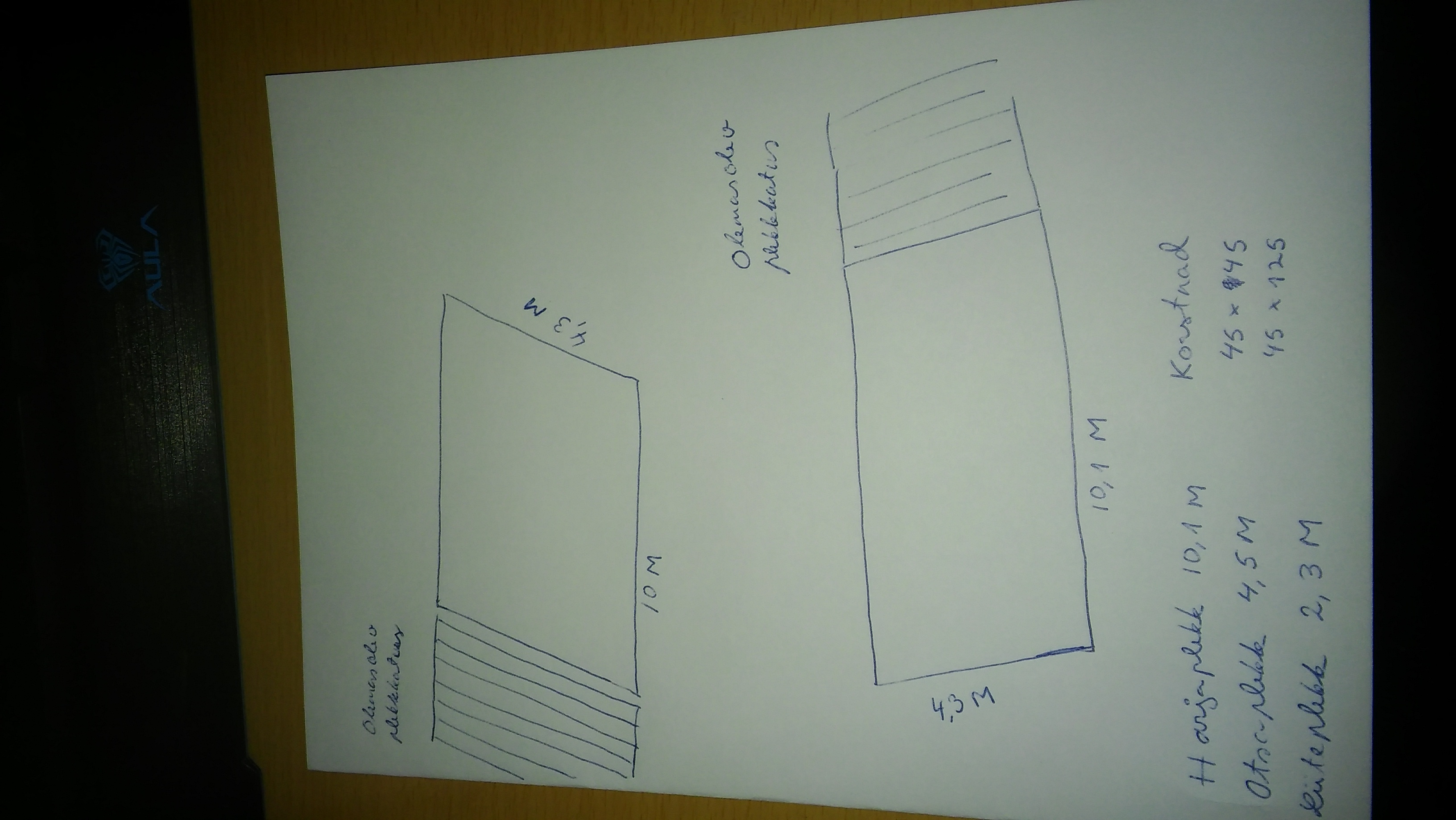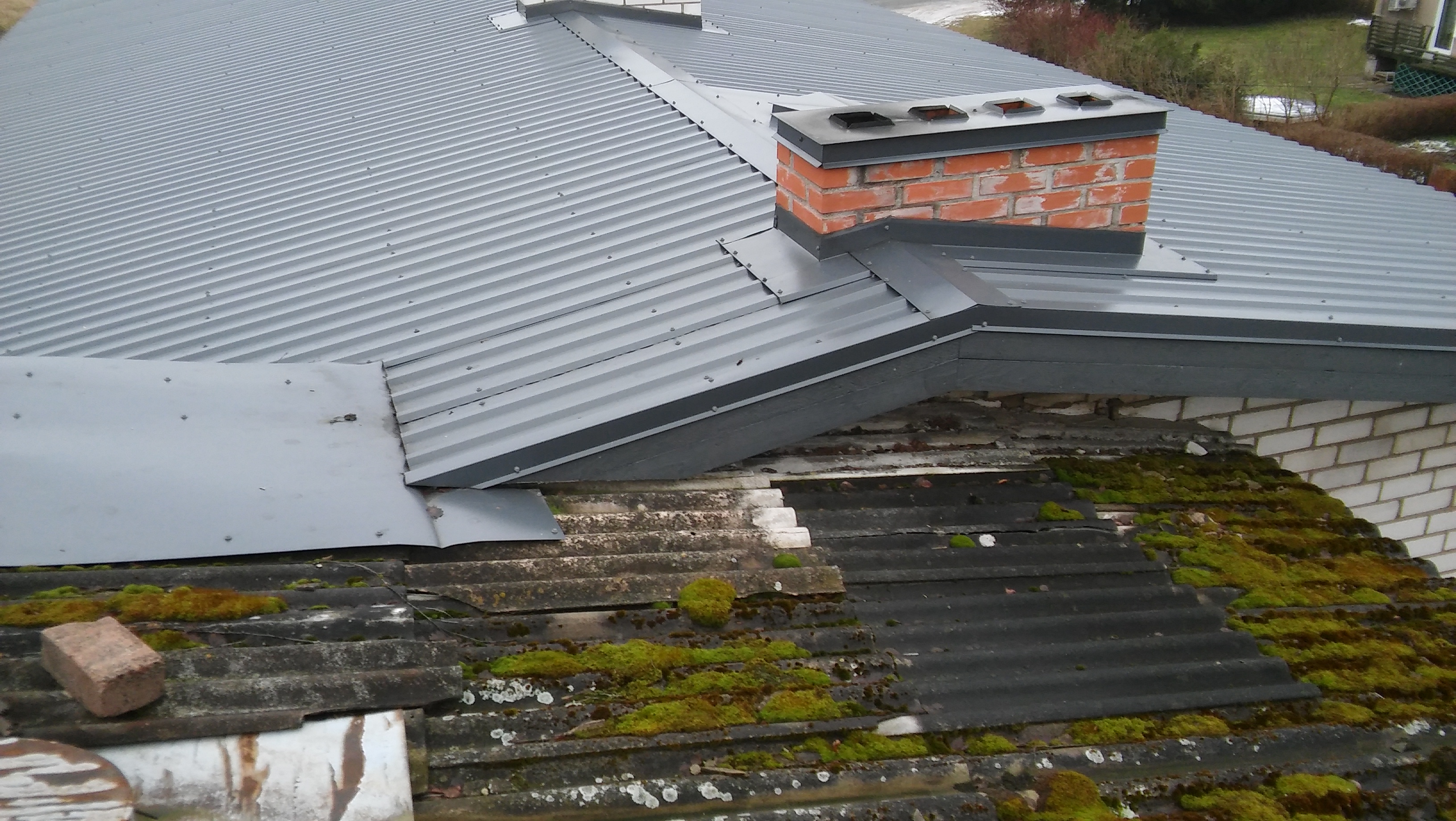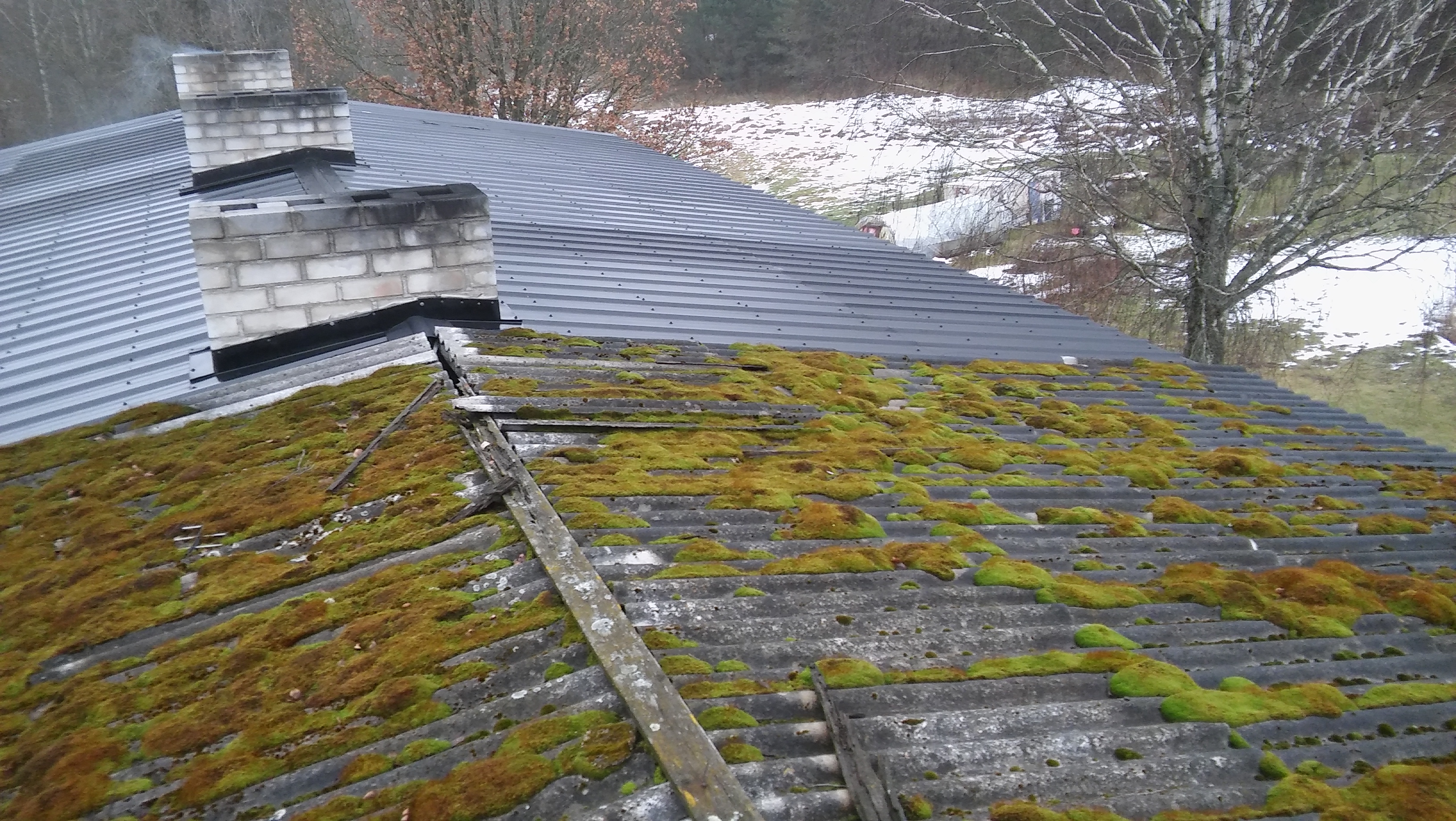 Tuleb maha võtta olemasolev eterniit, seal all olev 50x50 roov. Siis sarikatele aluskattekile, kile peale 22x50 lipid ja siis laud roovitus. Peale tuleb hall trapetsplekk. Katus üheltpoolt laius 10meetrit ja pikkus 4,25 meetrit ja teisepoolt 10,1 meetrit ja pikkus 4,25 meetrit. Harjaplekk 10,1 meetrit, otsaplekk 4,5 meetrit ja liiteplekk seinaäärde 2,3 meetrit. Kahele korstnale tulevad plekid ümber. Korstna mõõdud 45x45cm ja 45x125cm. Lisaks tuleb kui eterniit maas lae peale laotada 15 + 15 cm villa 40 m².