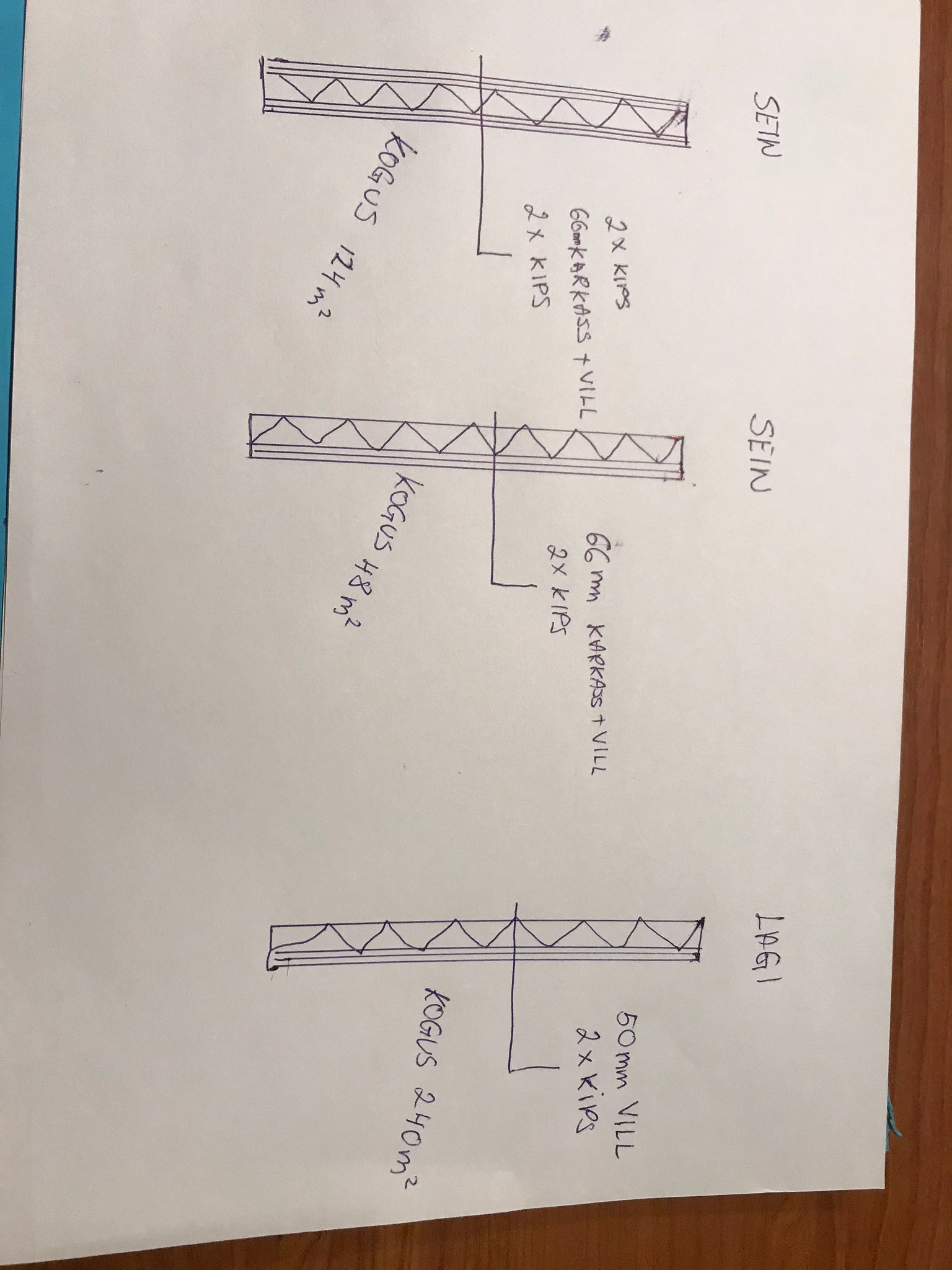 Seina on 2 tüüpi. 66 karkass ja vill-2x kips seina pind 48m2 ja teine 2xkips-66 karkass ja vill-2x kips, seina pind 124m2 sisaldab 8. 800mm ukseava